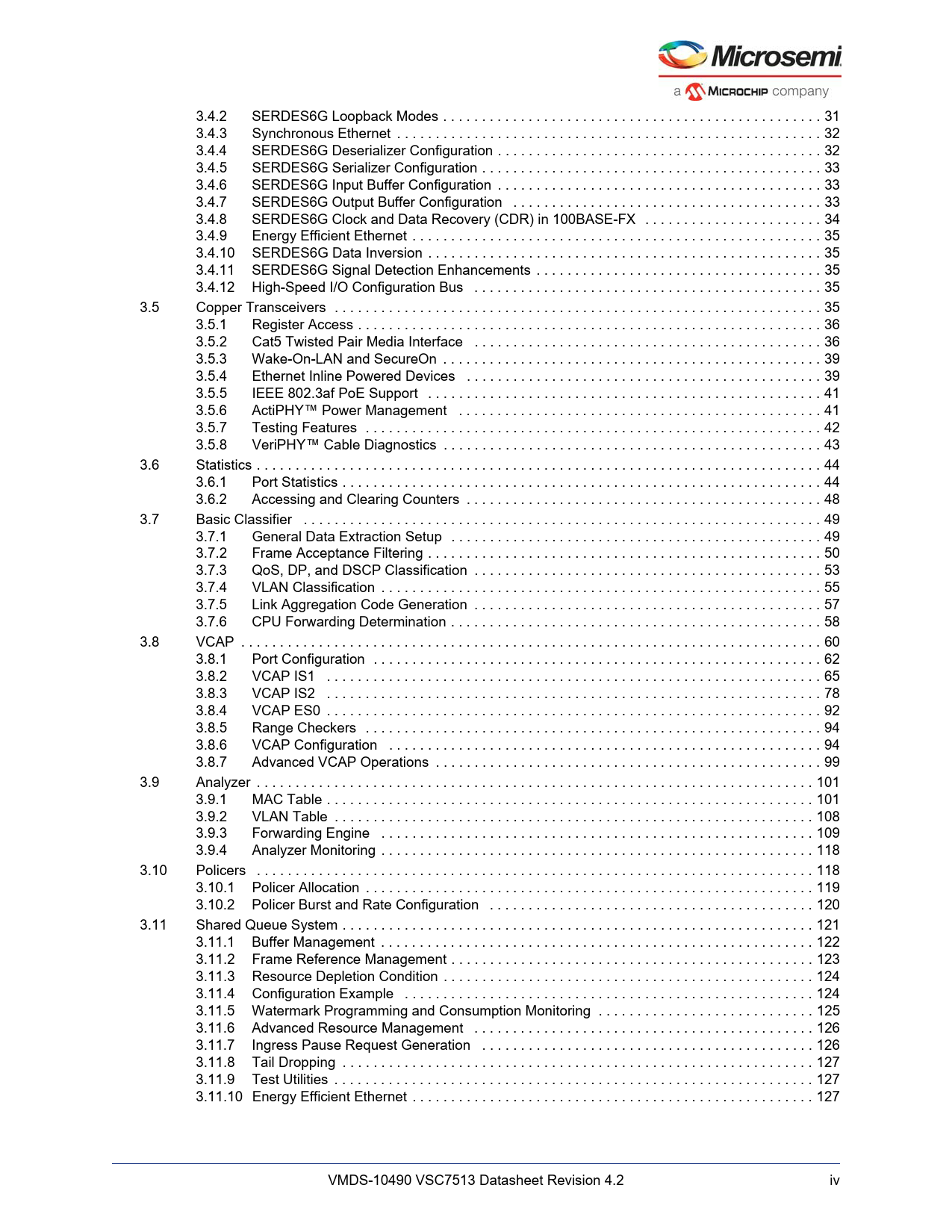 Línea de modelo para esta hoja de datos Versión de texto del documento link to page 46 link to page 47 link to page 47 link to page 48 link to page 48 link to page 48 link to page 49 link to page 50 link to page 50 link to page 50 link to page 50 link to page 50 link to page 51 link to page 51 link to page 54 link to page 54 link to page 56 link to page 56 link to page 57 link to page 58 link to page 59 link to page 59 link to page 63 link to page 64 link to page 64 link to page 65 link to page 68 link to page 70 link to page 72 link to page 73 link to page 75 link to page 77 link to page 80 link to page 93 link to page 107 link to page 109 link to page 109 link to page 114 link to page 116 link to page 116 link to page 123 link to page 124 link to page 133 link to page 133 link to page 134 link to page 135 link to page 136 link to page 137 link to page 138 link to page 139 link to page 139 link to page 140 link to page 141 link to page 141 link to page 142 link to page 142 link to page 142 3.4.2 SERDES6G Loopback Modes . 31 3.4.3 Synchronous Ethernet . 32 3.4.4 SERDES6G Deserializer Configuration . 32 3.4.5 SERDES6G Serializer Configuration . 33 3.4.6 SERDES6G Input Buffer Configuration . 33 3.4.7 SERDES6G Output Buffer Configuration . 33 3.4.8 SERDES6G Clock and Data Recovery (CDR) in 100BASE-FX . 34 3.4.9 Energy Efficient Ethernet . 35 3.4.10 SERDES6G Data Inversion . 35 3.4.11 SERDES6G Signal Detection Enhancements . 35 3.4.12 High-Speed I/O Configuration Bus . 35 3.5 Copper Transceivers . 35 3.5.1 Register Access . 36 3.5.2 Cat5 Twisted Pair Media Interface . 36 3.5.3 Wake-On-LAN and SecureOn . 39 3.5.4 Ethernet Inline Powered Devices . 39 3.5.5 IEEE 802.3af PoE Support . 41 3.5.6 ActiPHY™ Power Management . 41 3.5.7 Testing Features . 42 3.5.8 VeriPHY™ Cable Diagnostics . 43 3.6 Statistics . 44 3.6.1 Port Statistics . 44 3.6.2 Accessing and Clearing Counters . 48 3.7 Basic Classifier . 49 3.7.1 General Data Extraction Setup . 49 3.7.2 Frame Acceptance Filtering . 50 3.7.3 QoS, DP, and DSCP Classification . 53 3.7.4 VLAN Classification . 55 3.7.5 Link Aggregation Code Generation . 57 3.7.6 CPU Forwarding Determination . 58 3.8 VCAP . 60 3.8.1 Port Configuration . 62 3.8.2 VCAP IS1 . 65 3.8.3 VCAP IS2 . 78 3.8.4 VCAP ES0 . 92 3.8.5 Range Checkers . 94 3.8.6 VCAP Configuration . 94 3.8.7 Advanced VCAP Operations . 99 3.9 Analyzer . 101 3.9.1 MAC Table . 101 3.9.2 VLAN Table . 108 3.9.3 Forwarding Engine . 109 3.9.4 Analyzer Monitoring . 118 3.10 Policers . 118 3.10.1 Policer Allocation . 119 3.10.2 Policer Burst and Rate Configuration . 120 3.11 Shared Queue System . 121 3.11.1 Buffer Management . 122 3.11.2 Frame Reference Management . 123 3.11.3 Resource Depletion Condition . 124 3.11.4 Configuration Example . 124 3.11.5 Watermark Programming and Consumption Monitoring . 125 3.11.6 Advanced Resource Management . 126 3.11.7 Ingress Pause Request Generation . 126 3.11.8 Tail Dropping . 127 3.11.9 Test Utilities . 127 3.11.10 Energy Efficient Ethernet . 127 VMDS-10490 VSC7513 Datasheet Revision 4.2 iv Document Outline 1 Revision History 1.1 Revision 4.2 1.2 Revision 4.1 1.3 Revision 4.0 1.4 Revision 2.1 1.5 Revision 2.0 2 Product Overview 2.1 General Features 2.1.1 Layer 2 Switching 2.1.2 Layer 2 Multicast 2.1.3 Quality of Service 2.1.4 Security 2.1.5 Management 2.1.6 Product Parameters 2.2 Applications 2.3 Functional Overview 2.3.1 Frame Arrival 2.3.2 Basic and Advanced Frame Classification 2.3.3 Versatile Content Aware Processor (VCAP) 2.3.4 Policing 2.3.5 Layer-2 Forwarding 2.3.6 Shared Queue System and Egress Scheduler 2.3.7 Rewriter and Frame Departure 2.3.8 CPU Port Module 2.3.9 Synchronous Ethernet and Precision Time Protocol 2.3.10 CPU System and Interfaces 3 Functional Descriptions 3.1 Port Numbering and Mappings 3.1.1 Supported SerDes Interfaces 3.1.2 Dual-Media Mode 3.1.3 QSGMII 3.1.4 PCIe Mode 3.1.5 Logical Port Numbers 3.2 Port Modules 3.2.1 MAC 3.2.2 PCS 3.3 SERDES1G 3.3.1 SERDES1G Basic Configuration 3.3.2 SERDES1G Loopback Modes 3.3.3 Synchronous Ethernet 3.3.4 SERDES1G Deserializer Configuration 3.3.5 SERDES1G Serializer Configuration 3.3.6 SERDES1G Input Buffer Configuration 3.3.7 SERDES1G Output Buffer Configuration 3.3.8 SERDES1G Clock and Data Recovery (CDR) in 100BASE-FX 3.3.9 Energy Efficient Ethernet 3.3.10 SERDES1G Data Inversion 3.4 SERDES6G 3.4.1 SERDES6G Basic Configuration 3.4.2 SERDES6G Loopback Modes 3.4.3 Synchronous Ethernet 3.4.4 SERDES6G Deserializer Configuration 3.4.5 SERDES6G Serializer Configuration 3.4.6 SERDES6G Input Buffer Configuration 3.4.7 SERDES6G Output Buffer Configuration 3.4.8 SERDES6G Clock and Data Recovery (CDR) in 100BASE-FX 3.4.9 Energy Efficient Ethernet 3.4.10 SERDES6G Data Inversion 3.4.11 SERDES6G Signal Detection Enhancements 3.4.12 High-Speed I/O Configuration Bus 3.5 Copper Transceivers 3.5.1 Register Access 3.5.2 Cat5 Twisted Pair Media Interface 3.5.3 Wake-On-LAN and SecureOn 3.5.4 Ethernet Inline Powered Devices 3.5.5 IEEE 802.3af PoE Support 3.5.6 ActiPHY™ Power Management 3.5.7 Testing Features 3.5.8 VeriPHY™ Cable Diagnostics 3.6 Statistics 3.6.1 Port Statistics 3.6.2 Accessing and Clearing Counters 3.7 Basic Classifier 3.7.1 General Data Extraction Setup 3.7.2 Frame Acceptance Filtering 3.7.3 QoS, DP, and DSCP Classification 3.7.4 VLAN Classification 3.7.5 Link Aggregation Code Generation 3.7.6 CPU Forwarding Determination 3.8 VCAP 3.8.1 Port Configuration 3.8.2 VCAP IS1 3.8.3 VCAP IS2 3.8.4 VCAP ES0 3.8.5 Range Checkers 3.8.6 VCAP Configuration 3.8.7 Advanced VCAP Operations 3.9 Analyzer 3.9.1 MAC Table 3.9.2 VLAN Table 3.9.3 Forwarding Engine 3.9.4 Analyzer Monitoring 3.10 Policers 3.10.1 Policer Allocation 3.10.2 Policer Burst and Rate Configuration 3.11 Shared Queue System 3.11.1 Buffer Management 3.11.2 Frame Reference Management 3.11.3 Resource Depletion Condition 3.11.4 Configuration Example 3.11.5 Watermark Programming and Consumption Monitoring 3.11.6 Advanced Resource Management 3.11.7 Ingress Pau