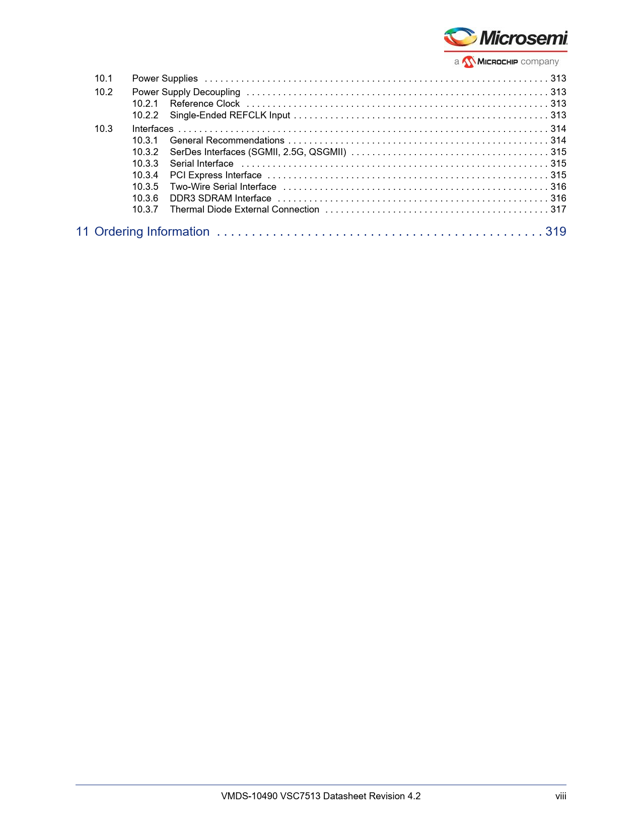 Línea de modelo para esta hoja de datos Versión de texto del documento link to page 328 link to page 328 link to page 328 link to page 328 link to page 329 link to page 329 link to page 330 link to page 330 link to page 330 link to page 331 link to page 331 link to page 332 link to page 334 10.1 Power Supplies . 313 10.2 Power Supply Decoupling . 313 10.2.1 Reference Clock . 313 10.2.2 Single-Ended REFCLK Input . 313 10.3 Interfaces . 314 10.3.1 General Recommendations . 314 10.3.2 SerDes Interfaces (SGMII, 2.5G, QSGMII) . 315 10.3.3 Serial Interface . 315 10.3.4 PCI Express Interface . 315 10.3.5 Two-Wire Serial Interface . 316 10.3.6 DDR3 SDRAM Interface . 316 10.3.7 Thermal Diode External Connection . 317 11 Ordering Information . 319 VMDS-10490 VSC7513 Datasheet Revision 4.2 vii Document Outline 1 Revision History 1.1 Revision 4.2 1.2 Revision 4.1 1.3 Revision 4.0 1.4 Revision 2.1 1.5 Revision 2.0 2 Product Overview 2.1 General Features 2.1.1 Layer 2 Switching 2.1.2 Layer 2 Multicast 2.1.3 Quality of Service 2.1.4 Security 2.1.5 Management 2.1.6 Product Parameters 2.2 Applications 2.3 Functional Overview 2.3.1 Frame Arrival 2.3.2 Basic and Advanced Frame Classification 2.3.3 Versatile Content Aware Processor (VCAP) 2.3.4 Policing 2.3.5 Layer-2 Forwarding 2.3.6 Shared Queue System and Egress Scheduler 2.3.7 Rewriter and Frame Departure 2.3.8 CPU Port Module 2.3.9 Synchronous Ethernet and Precision Time Protocol 2.3.10 CPU System and Interfaces 3 Functional Descriptions 3.1 Port Numbering and Mappings 3.1.1 Supported SerDes Interfaces 3.1.2 Dual-Media Mode 3.1.3 QSGMII 3.1.4 PCIe Mode 3.1.5 Logical Port Numbers 3.2 Port Modules 3.2.1 MAC 3.2.2 PCS 3.3 SERDES1G 3.3.1 SERDES1G Basic Configuration 3.3.2 SERDES1G Loopback Modes 3.3.3 Synchronous Ethernet 3.3.4 SERDES1G Deserializer Configuration 3.3.5 SERDES1G Serializer Configuration 3.3.6 SERDES1G Input Buffer Configuration 3.3.7 SERDES1G Output Buffer Configuration 3.3.8 SERDES1G Clock and Data Recovery (CDR) in 100BASE-FX 3.3.9 Energy Efficient Ethernet 3.3.10 SERDES1G Data Inversion 3.4 SERDES6G 3.4.1 SERDES6G Basic Configuration 3.4.2 SERDES6G Loopback Modes 3.4.3 Synchronous Ethernet 3.4.4 SERDES6G Deserializer Configuration 3.4.5 SERDES6G Serializer Configuration 3.4.6 SERDES6G Input Buffer Configuration 3.4.7 SERDES6G Output Buffer Configuration 3.4.8 SERDES6G Clock and Data Recovery (CDR) in 100BASE-FX 3.4.9 Energy Efficient Ethernet 3.4.10 SERDES6G Data Inversion 3.4.11 SERDES6G Signal Detection Enhancements 3.4.12 High-Speed I/O Configuration Bus 3.5 Copper Transceivers 3.5.1 Register Access 3.5.2 Cat5 Twisted Pair Media Interface 3.5.3 Wake-On-LAN and SecureOn 3.5.4 Ethernet Inline Powered Devices 3.5.5 IEEE 802.3af PoE Support 3.5.6 ActiPHY™ Power Management 3.5.7 Testing Features 3.5.8 VeriPHY™ Cable Diagnostics 3.6 Statistics 3.6.1 Port Statistics 3.6.2 Accessing and Clearing Counters 3.7 Basic Classifier 3.7.1 General Data Extraction Setup 3.7.2 Frame Acceptance Filtering 3.7.3 QoS, DP, and DSCP Classification 3.7.4 VLAN Classification 3.7.5 Link Aggregation Code Generation 3.7.6 CPU Forwarding Determination 3.8 VCAP 3.8.1 Port Configuration 3.8.2 VCAP IS1 3.8.3 VCAP IS2 3.8.4 VCAP ES0 3.8.5 Range Checkers 3.8.6 VCAP Configuration 3.8.7 Advanced VCAP Operations 3.9 Analyzer 3.9.1 MAC Table 3.9.2 VLAN Table 3.9.3 Forwarding Engine 3.9.4 Analyzer Monitoring 3.10 Policers 3.10.1 Policer Allocation 3.10.2 Policer Burst and Rate Configuration 3.11 Shared Queue System 3.11.1 Buffer Management 3.11.2 Frame Reference Management 3.11.3 Resource Depletion Condition 3.11.4 Configuration Example 3.11.5 Watermark Programming and Consumption Monitoring 3.11.6 Advanced Resource Management 3.11.7 Ingress Pause Request Generation 3.11.8 Tail Dropping 3.11.9 Test Utilities 3.11.10 Energy Efficient Ethernet 3.12 Scheduler and Shapers 3.12.1 Scheduler Element 3.12.2 Egress Shapers 3.12.3 Deficit Weighted Round Robin 3.12.4 Round Robin 3.12.5 Shaping and DWRR Scheduling Examples 3.13 Rewriter 3.13.1 VLAN Editing 3.13.2 DSCP Remarking 3.13.3 FCS Updating 3.13.4 PTP Time Stamping 3.13.5 Special Rewriter Operations 3.14 CPU Port Module 3.14.1 Frame Extraction 3.14.2 Frame Injection 3.14.3 Node Processor Interface (NPI) 3.14.4 Frame Generation Engine for Periodic Transmissions 3.15 VRAP Engine 3.15.1 VRAP Request Frame Format 3.15.2 VRAP Response Frame Format 3.15.3 VRAP Header Format 3.15.4 VRAP READ Command 3.15.5 VRAP WRITE Command 3.15.6 VRAP READ-MODIFY-WRITE Command 3.15.7 VRAP IDLE Command 3.15.8 VRAP PAUSE Command 3.16 Layer 1 Timing 3.17 Hardware Time Stamping 3.17.1 Time Stamp Classification 3.17.2 Time of Day Generation 3.17.3 Hardware Time Stamping Module 3.17.4 Configuring I/O Delays 3.18 Clocking and Reset 3.18.1 Pin Strapping 4 VCore-III System and CPU Interfaces 4.1 VCore-III Configurations 4.2 Clocking and Reset 4.2.1 Watchdog Timer 4.3 Shared Bus 4.3.1 VCore-III Shared Bus Arbitration 4.3.2 Chip Register Region 4.3.3 SI Flash Region 4.3.4 DDR3/DDR3L Region 4.3.5 PCIe Region 4.4 VCore-III CPU 4.4.1 Little Endian and Big Endian Support 4.4.2 Software Debug and Development 4.5 External CPU Support 4.5.1 Register Access and Multimaster Systems 4.5.2 Serial Interface in Slave Mode 4.5.3 MIIM Interface in Slave Mode 4.5.4 Access to the VCore Shared Bus 4.5.5 Mailbox and Semaphores 4.6 PCIe Endpoint Controller 4.6.1 Accessing Endpoint Registers 4.6.2 Enabling the Endpoint 4.6.3 Base Address Registers Inbound Requests 4.6.4 Outbound Interrupts 4.6.5 Outbound Access 4.6.6 Power Management 4.6.7 Device Reset Using PCIe 4.7 Frame DMA 4.7.1 DMA Control Block Structures 4.7.2 Enabling and Disabling FDMA Channels 4.7.3 Channel Counters 4.7.4 FDMA Events and Interrupts 4.7.5 FDMA Extraction 4.7.6 FDMA Injection 4.7.7 Manual Mode 4.8 VCore-III System Peripherals 4.8.1 SI Boot Controller 4.8.2 SI Master Controller 4.8.3 DDR3/DDR3L Memory Controller 4.8.4 Timers 4.8.5 UARTs 4.8.6 Two-Wire Serial Interface 4.8.7 MII Management Controller 4.8.
