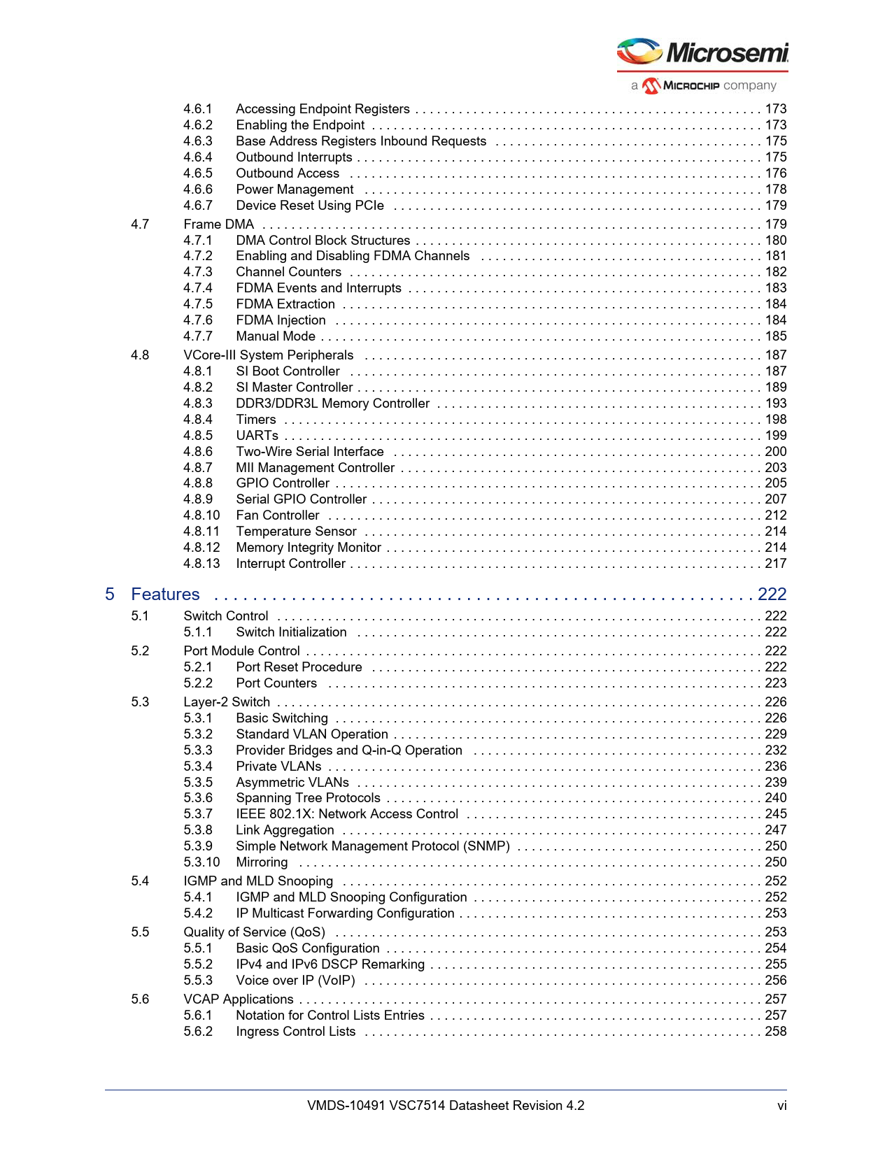 Línea de modelo para esta hoja de datos Versión de texto del documento link to page 188 link to page 188 link to page 190 link to page 190 link to page 191 link to page 193 link to page 194 link to page 194 link to page 195 link to page 196 link to page 197 link to page 198 link to page 199 link to page 199 link to page 200 link to page 202 link to page 202 link to page 204 link to page 208 link to page 213 link to page 214 link to page 215 link to page 218 link to page 220 link to page 222 link to page 227 link to page 229 link to page 229 link to page 232 link to page 237 link to page 237 link to page 237 link to page 237 link to page 237 link to page 238 link to page 241 link to page 241 link to page 244 link to page 247 link to page 251 link to page 254 link to page 255 link to page 260 link to page 262 link to page 265 link to page 265 link to page 267 link to page 267 link to page 268 link to page 268 link to page 269 link to page 270 link to page 271 link to page 272 link to page 272 link to page 273 4.6.1 Accessing Endpoint Registers . 173 4.6.2 Enabling the Endpoint . 173 4.6.3 Base Address Registers Inbound Requests . 175 4.6.4 Outbound Interrupts . 175 4.6.5 Outbound Access . 176 4.6.6 Power Management . 178 4.6.7 Device Reset Using PCIe . 179 4.7 Frame DMA . 179 4.7.1 DMA Control Block Structures . 180 4.7.2 Enabling and Disabling FDMA Channels . 181 4.7.3 Channel Counters . 182 4.7.4 FDMA Events and Interrupts . 183 4.7.5 FDMA Extraction . 184 4.7.6 FDMA Injection . 184 4.7.7 Manual Mode . 185 4.8 VCore-III System Peripherals . 187 4.8.1 SI Boot Controller . 187 4.8.2 SI Master Controller . 189 4.8.3 DDR3/DDR3L Memory Controller . 193 4.8.4 Timers . 198 4.8.5 UARTs . 199 4.8.6 Two-Wire Serial Interface . 200 4.8.7 MII Management Controller . 203 4.8.8 GPIO Controller . 205 4.8.9 Serial GPIO Controller . 207 4.8.10 Fan Controller . 212 4.8.11 Temperature Sensor . 214 4.8.12 Memory Integrity Monitor . 214 4.8.13 Interrupt Controller . 217 5 Features . 222 5.1 Switch Control . 222 5.1.1 Switch Initialization . 222 5.2 Port Module Control . 222 5.2.1 Port Reset Procedure . 222 5.2.2 Port Counters . 223 5.3 Layer-2 Switch . 226 5.3.1 Basic Switching . 226 5.3.2 Standard VLAN Operation . 229 5.3.3 Provider Bridges and Q-in-Q Operation . 232 5.3.4 Private VLANs . 236 5.3.5 Asymmetric VLANs . 239 5.3.6 Spanning Tree Protocols . 240 5.3.7 IEEE 802.1X: Network Access Control . 245 5.3.8 Link Aggregation . 247 5.3.9 Simple Network Management Protocol (SNMP) . 250 5.3.10 Mirroring . 250 5.4 IGMP and MLD Snooping . 252 5.4.1 IGMP and MLD Snooping Configuration . 252 5.4.2 IP Multicast Forwarding Configuration . 253 5.5 Quality of Service (QoS) . 253 5.5.1 Basic QoS Configuration . 254 5.5.2 IPv4 and IPv6 DSCP Remarking . 255 5.5.3 Voice over IP (VoIP) . 256 5.6 VCAP Applications . 257 5.6.1 Notation for Control Lists Entries . 257 5.6.2 Ingress Control Lists . 258 VMDS-10491 VSC7514 Datasheet Revision 4.2 vi Document Outline 1 Revision History 1.1 Revision 4.2 1.2 Revision 4.1 1.3 Revision 4.0 1.4 Revision 2.1 1.5 Revision 2.0 2 Product Overview 2.1 General Features 2.1.1 Layer 2 Switching 2.1.2 Layer 2 Multicast 2.1.3 Quality of Service 2.1.4 Security 2.1.5 Management 2.1.6 Product Parameters 2.2 Applications 2.3 Functional Overview 2.3.1 Frame Arrival 2.3.2 Basic and Advanced Frame Classification 2.3.3 Versatile Content Aware Processor (VCAP) 2.3.4 Policing 2.3.5 Layer-2 Forwarding 2.3.6 Shared Queue System and Egress Scheduler 2.3.7 Rewriter and Frame Departure 2.3.8 CPU Port Module 2.3.9 Synchronous Ethernet and Precision Time Protocol 2.3.10 CPU System and Interfaces 3 Functional Descriptions 3.1 Port Numbering and Mappings 3.1.1 Supported SerDes Interfaces 3.1.2 Dual-Media Mode 3.1.3 QSGMII 3.1.4 Miscellaneous Port Muxing 3.1.5 PCIe Mode 3.1.6 Logical Port Numbers 3.2 Port Modules 3.2.1 MAC 3.2.2 PCS 3.3 SERDES1G 3.3.1 SERDES1G Basic Configuration 3.3.2 SERDES1G Loopback Modes 3.3.3 Synchronous Ethernet 3.3.4 SERDES1G Deserializer Configuration 3.3.5 SERDES1G Serializer Configuration 3.3.6 SERDES1G Input Buffer Configuration 3.3.7 SERDES1G Output Buffer Configuration 3.3.8 SERDES1G Clock and Data Recovery (CDR) in 100BASE-FX 3.3.9 Energy Efficient Ethernet 3.3.10 SERDES1G Data Inversion 3.4 SERDES6G 3.4.1 SERDES6G Basic Configuration 3.4.2 SERDES6G Loopback Modes 3.4.3 Synchronous Ethernet 3.4.4 SERDES6G Deserializer Configuration 3.4.5 SERDES6G Serializer Configuration 3.4.6 SERDES6G Input Buffer Configuration 3.4.7 SERDES6G Output Buffer Configuration 3.4.8 SERDES6G Clock and Data Recovery (CDR) in 100BASE-FX 3.4.9 Energy Efficient Ethernet 3.4.10 SERDES6G Data Inversion 3.4.11 SERDES6G Signal Detection Enhancements 3.4.12 High-Speed I/O Configuration Bus 3.5 Copper Transceivers 3.5.1 Register Access 3.5.2 Cat5 Twisted Pair Media Interface 3.5.3 Wake-On-LAN and SecureOn 3.5.4 Ethernet Inline Powered Devices 3.5.5 IEEE 802.3af PoE Support 3.5.6 ActiPHY™ Power Management 3.5.7 Testing Features 3.5.8 VeriPHY™ Cable Diagnostics 3.6 Statistics 3.6.1 Port Statistics 3.6.2 Accessing and Clearing Counters 3.7 Basic Classifier 3.7.1 General Data Extraction Setup 3.7.2 Frame Acceptance Filtering 3.7.3 QoS, DP, and DSCP Classification 3.7.4 VLAN Classification 3.7.5 Link Aggregation Code Generation 3.7.6 CPU Forwarding Determination 3.8 VCAP 3.8.1 Port Configuration 3.8.2 VCAP IS1 3.8.3 VCAP IS2 3.8.4 VCAP ES0 3.8.5 Range Checkers 3.8.6 VCAP Configuration 3.8.7 Advanced VCAP Operations 3.9 Analyzer 3.9.1 MAC Table 3.9.2 VLAN Table 3.9.3 Forwarding Engine 3.9.4 Analyzer Monitoring 3.10 Policers 3.10.1 Policer Allocation 3.10.2 Policer Burst and Rate Configuration 3.11 Shared Queue System 3.11.1 Buffer Management 3.11.2 Frame Reference Management 3.11.3 Resource Depletion Condition 3.11.4 Configuration Example 3.11.5 Watermark Programming and Consumption Monitoring 3.11.6 Advanced Resource Management 3.11.7 Ingress Pause Request Generation 3.11.8 Tail Dropping 3.11.9 Test Utilities 3.11