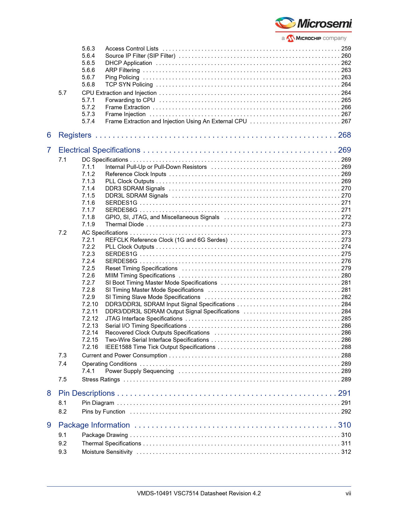 Línea de modelo para esta hoja de datos Versión de texto del documento link to page 274 link to page 275 link to page 277 link to page 278 link to page 278 link to page 279 link to page 279 link to page 280 link to page 281 link to page 282 link to page 282 link to page 283 link to page 284 link to page 284 link to page 284 link to page 284 link to page 284 link to page 285 link to page 285 link to page 286 link to page 286 link to page 287 link to page 288 link to page 288 link to page 288 link to page 289 link to page 290 link to page 291 link to page 294 link to page 295 link to page 296 link to page 296 link to page 297 link to page 299 link to page 299 link to page 300 link to page 301 link to page 301 link to page 301 link to page 303 link to page 303 link to page 304 link to page 304 link to page 304 link to page 306 link to page 306 link to page 307 link to page 325 link to page 325 link to page 326 link to page 327 5.6.3 Access Control Lists . 259 5.6.4 Source IP Filter (SIP Filter) . 260 5.6.5 DHCP Application . 262 5.6.6 ARP Filtering . 263 5.6.7 Ping Policing . 263 5.6.8 TCP SYN Policing . 264 5.7 CPU Extraction and Injection . 264 5.7.1 Forwarding to CPU . 265 5.7.2 Frame Extraction . 266 5.7.3 Frame Injection . 267 5.7.4 Frame Extraction and Injection Using An External CPU . 267 6 Registers . 268 7 Electrical Specifications . 269 7.1 DC Specifications . 269 7.1.1 Internal Pull-Up or Pull-Down Resistors . 269 7.1.2 Reference Clock Inputs . 269 7.1.3 PLL Clock Outputs . 269 7.1.4 DDR3 SDRAM Signals . 270 7.1.5 DDR3L SDRAM Signals . 270 7.1.6 SERDES1G . 271 7.1.7 SERDES6G . 271 7.1.8 GPIO, SI, JTAG, and Miscellaneous Signals . 272 7.1.9 Thermal Diode . 273 7.2 AC Specifications . 273 7.2.1 REFCLK Reference Clock (1G and 6G Serdes) . 273 7.2.2 PLL Clock Outputs . 274 7.2.3 SERDES1G . 275 7.2.4 SERDES6G . 276 7.2.5 Reset Timing Specifications . 279 7.2.6 MIIM Timing Specifications . 280 7.2.7 SI Boot Timing Master Mode Specifications . 281 7.2.8 SI Timing Master Mode Specifications . 281 7.2.9 SI Timing Slave Mode Specifications . 282 7.2.10 DDR3/DDR3L SDRAM Input Signal Specifications . 284 7.2.11 DDR3/DDR3L SDRAM Output Signal Specifications . 284 7.2.12 JTAG Interface Specifications . 285 7.2.13 Serial I/O Timing Specifications . 286 7.2.14 Recovered Clock Outputs Specifications . 286 7.2.15 Two-Wire Serial Interface Specifications . 286 7.2.16 IEEE1588 Time Tick Output Specifications . 288 7.3 Current and Power Consumption . 288 7.4 Operating Conditions . 289 7.4.1 Power Supply Sequencing . 289 7.5 Stress Ratings . 289 8 Pin Descriptions . 291 8.1 Pin Diagram . 291 8.2 Pins by Function . 292 9 Package Information . 310 9.1 Package Drawing . 310 9.2 Thermal Specifications . 311 9.3 Moisture Sensitivity . 312 VMDS-10491 VSC7514 Datasheet Revision 4.2 vii Document Outline 1 Revision History 1.1 Revision 4.2 1.2 Revision 4.1 1.3 Revision 4.0 1.4 Revision 2.1 1.5 Revision 2.0 2 Product Overview 2.1 General Features 2.1.1 Layer 2 Switching 2.1.2 Layer 2 Multicast 2.1.3 Quality of Service 2.1.4 Security 2.1.5 Management 2.1.6 Product Parameters 2.2 Applications 2.3 Functional Overview 2.3.1 Frame Arrival 2.3.2 Basic and Advanced Frame Classification 2.3.3 Versatile Content Aware Processor (VCAP) 2.3.4 Policing 2.3.5 Layer-2 Forwarding 2.3.6 Shared Queue System and Egress Scheduler 2.3.7 Rewriter and Frame Departure 2.3.8 CPU Port Module 2.3.9 Synchronous Ethernet and Precision Time Protocol 2.3.10 CPU System and Interfaces 3 Functional Descriptions 3.1 Port Numbering and Mappings 3.1.1 Supported SerDes Interfaces 3.1.2 Dual-Media Mode 3.1.3 QSGMII 3.1.4 Miscellaneous Port Muxing 3.1.5 PCIe Mode 3.1.6 Logical Port Numbers 3.2 Port Modules 3.2.1 MAC 3.2.2 PCS 3.3 SERDES1G 3.3.1 SERDES1G Basic Configuration 3.3.2 SERDES1G Loopback Modes 3.3.3 Synchronous Ethernet 3.3.4 SERDES1G Deserializer Configuration 3.3.5 SERDES1G Serializer Configuration 3.3.6 SERDES1G Input Buffer Configuration 3.3.7 SERDES1G Output Buffer Configuration 3.3.8 SERDES1G Clock and Data Recovery (CDR) in 100BASE-FX 3.3.9 Energy Efficient Ethernet 3.3.10 SERDES1G Data Inversion 3.4 SERDES6G 3.4.1 SERDES6G Basic Configuration 3.4.2 SERDES6G Loopback Modes 3.4.3 Synchronous Ethernet 3.4.4 SERDES6G Deserializer Configuration 3.4.5 SERDES6G Serializer Configuration 3.4.6 SERDES6G Input Buffer Configuration 3.4.7 SERDES6G Output Buffer Configuration 3.4.8 SERDES6G Clock and Data Recovery (CDR) in 100BASE-FX 3.4.9 Energy Efficient Ethernet 3.4.10 SERDES6G Data Inversion 3.4.11 SERDES6G Signal Detection Enhancements 3.4.12 High-Speed I/O Configuration Bus 3.5 Copper Transceivers 3.5.1 Register Access 3.5.2 Cat5 Twisted Pair Media Interface 3.5.3 Wake-On-LAN and SecureOn 3.5.4 Ethernet Inline Powered Devices 3.5.5 IEEE 802.3af PoE Support 3.5.6 ActiPHY™ Power Management 3.5.7 Testing Features 3.5.8 VeriPHY™ Cable Diagnostics 3.6 Statistics 3.6.1 Port Statistics 3.6.2 Accessing and Clearing Counters 3.7 Basic Classifier 3.7.1 General Data Extraction Setup 3.7.2 Frame Acceptance Filtering 3.7.3 QoS, DP, and DSCP Classification 3.7.4 VLAN Classification 3.7.5 Link Aggregation Code Generation 3.7.6 CPU Forwarding Determination 3.8 VCAP 3.8.1 Port Configuration 3.8.2 VCAP IS1 3.8.3 VCAP IS2 3.8.4 VCAP ES0 3.8.5 Range Checkers 3.8.6 VCAP Configuration 3.8.7 Advanced VCAP Operations 3.9 Analyzer 3.9.1 MAC Table 3.9.2 VLAN Table 3.9.3 Forwarding Engine 3.9.4 Analyzer Monitoring 3.10 Policers 3.10.1 Policer Allocation 3.10.2 Policer Burst and Rate Configuration 3.11 Shared Queue System 3.11.1 Buffer Management 3.11.2 Frame Reference Management 3.11.3 Resource Depletion Condition 3.11.4 Configuration Example 3.11.5 Watermark Programming and Consumption Monitoring 3.11.6 Advanced Resource Management 3.11.7 Ingress Pause Request Generation 3.11.8 Tail Dropping 3.11.9 Test Utilities 3.11.10 Energy Efficient Ethernet 3.12 Scheduler and Shapers 3.12.1 Scheduler Element 3.12.2 Egress Shapers 3.12.3 Deficit Weighted Round Robin 3.12.4