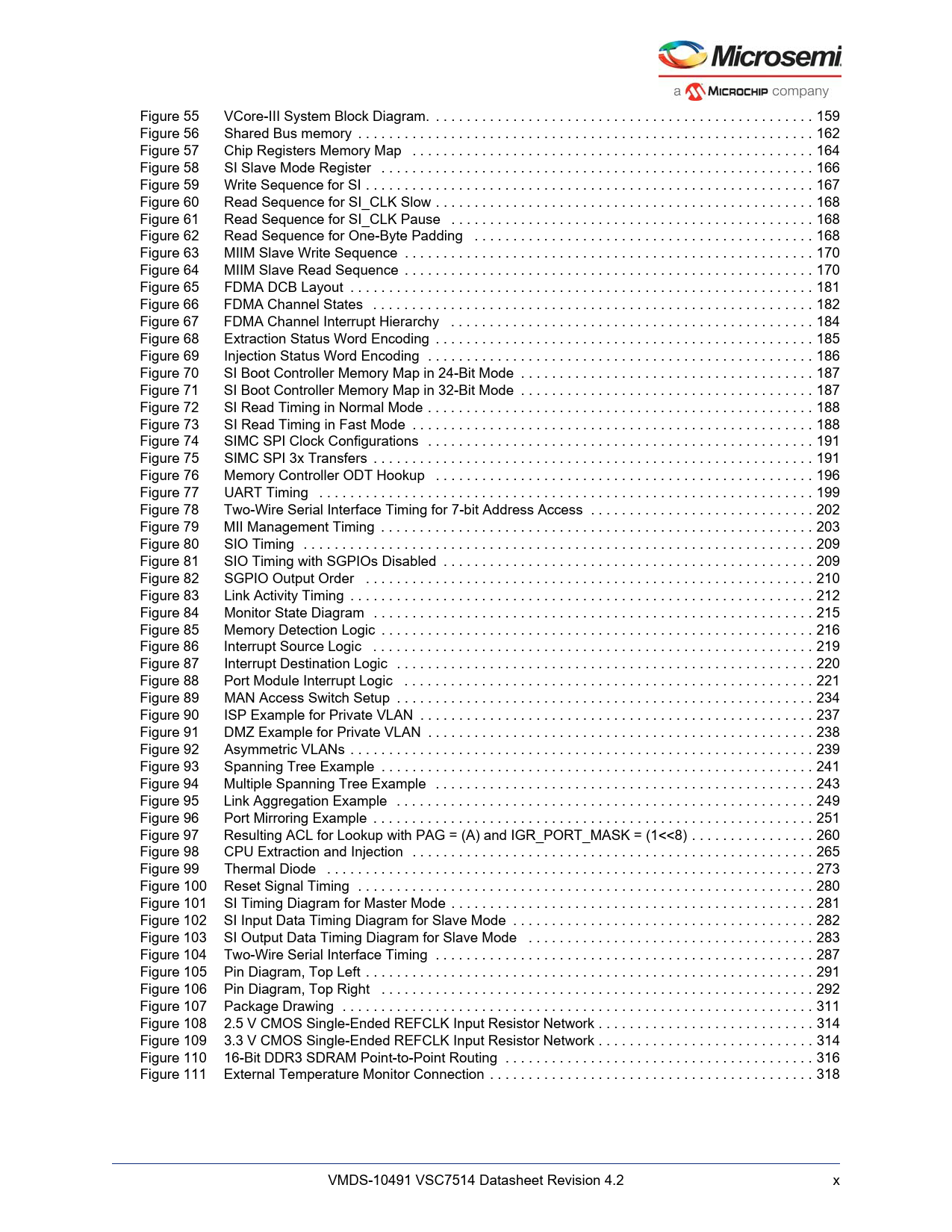 Línea de modelo para esta hoja de datos Versión de texto del documento link to page 174 link to page 177 link to page 179 link to page 181 link to page 182 link to page 183 link to page 183 link to page 183 link to page 185 link to page 185 link to page 196 link to page 197 link to page 199 link to page 200 link to page 201 link to page 202 link to page 202 link to page 203 link to page 203 link to page 206 link to page 206 link to page 211 link to page 214 link to page 217 link to page 218 link to page 224 link to page 224 link to page 225 link to page 227 link to page 230 link to page 231 link to page 234 link to page 235 link to page 236 link to page 249 link to page 252 link to page 253 link to page 254 link to page 256 link to page 258 link to page 264 link to page 266 link to page 275 link to page 280 link to page 288 link to page 295 link to page 296 link to page 297 link to page 298 link to page 302 link to page 306 link to page 307 link to page 326 link to page 329 link to page 329 link to page 331 link to page 333 Figure 55 VCore-III System Block Diagram. 159 Figure 56 Shared Bus memory . 162 Figure 57 Chip Registers Memory Map . 164 Figure 58 SI Slave Mode Register . 166 Figure 59 Write Sequence for SI . 167 Figure 60 Read Sequence for SI_CLK Slow . 168 Figure 61 Read Sequence for SI_CLK Pause . 168 Figure 62 Read Sequence for One-Byte Padding . 168 Figure 63 MIIM Slave Write Sequence . 170 Figure 64 MIIM Slave Read Sequence . 170 Figure 65 FDMA DCB Layout . 181 Figure 66 FDMA Channel States . 182 Figure 67 FDMA Channel Interrupt Hierarchy . 184 Figure 68 Extraction Status Word Encoding . 185 Figure 69 Injection Status Word Encoding . 186 Figure 70 SI Boot Controller Memory Map in 24-Bit Mode . 187 Figure 71 SI Boot Controller Memory Map in 32-Bit Mode . 187 Figure 72 SI Read Timing in Normal Mode . 188 Figure 73 SI Read Timing in Fast Mode . 188 Figure 74 SIMC SPI Clock Configurations . 191 Figure 75 SIMC SPI 3x Transfers . 191 Figure 76 Memory Controller ODT Hookup . 196 Figure 77 UART Timing . 199 Figure 78 Two-Wire Serial Interface Timing for 7-bit Address Access . 202 Figure 79 MII Management Timing . 203 Figure 80 SIO Timing . 209 Figure 81 SIO Timing with SGPIOs Disabled . 209 Figure 82 SGPIO Output Order . 210 Figure 83 Link Activity Timing . 212 Figure 84 Monitor State Diagram . 215 Figure 85 Memory Detection Logic . 216 Figure 86 Interrupt Source Logic . 219 Figure 87 Interrupt Destination Logic . 220 Figure 88 Port Module Interrupt Logic . 221 Figure 89 MAN Access Switch Setup . 234 Figure 90 ISP Example for Private VLAN . 237 Figure 91 DMZ Example for Private VLAN . 238 Figure 92 Asymmetric VLANs . 239 Figure 93 Spanning Tree Example . 241 Figure 94 Multiple Spanning Tree Example . 243 Figure 95 Link Aggregation Example . 249 Figure 96 Port Mirroring Example . 251 Figure 97 Resulting ACL for Lookup with PAG = (A) and IGR_PORT_MASK = (1<<8) . 260 Figure 98 CPU Extraction and Injection . 265 Figure 99 Thermal Diode . 273 Figure 100 Reset Signal Timing . 280 Figure 101 SI Timing Diagram for Master Mode . 281 Figure 102 SI Input Data Timing Diagram for Slave Mode . 282 Figure 103 SI Output Data Timing Diagram for Slave Mode . 283 Figure 104 Two-Wire Serial Interface Timing . 287 Figure 105 Pin Diagram, Top Left . 291 Figure 106 Pin Diagram, Top Right . 292 Figure 107 Package Drawing . 311 Figure 108 2.5 V CMOS Single-Ended REFCLK Input Resistor Network . 314 Figure 109 3.3 V CMOS Single-Ended REFCLK Input Resistor Network . 314 Figure 110 16-Bit DDR3 SDRAM Point-to-Point Routing . 316 Figure 111 External Temperature Monitor Connection . 318 VMDS-10491 VSC7514 Datasheet Revision 4.2 x Document Outline 1 Revision History 1.1 Revision 4.2 1.2 Revision 4.1 1.3 Revision 4.0 1.4 Revision 2.1 1.5 Revision 2.0 2 Product Overview 2.1 General Features 2.1.1 Layer 2 Switching 2.1.2 Layer 2 Multicast 2.1.3 Quality of Service 2.1.4 Security 2.1.5 Management 2.1.6 Product Parameters 2.2 Applications 2.3 Functional Overview 2.3.1 Frame Arrival 2.3.2 Basic and Advanced Frame Classification 2.3.3 Versatile Content Aware Processor (VCAP) 2.3.4 Policing 2.3.5 Layer-2 Forwarding 2.3.6 Shared Queue System and Egress Scheduler 2.3.7 Rewriter and Frame Departure 2.3.8 CPU Port Module 2.3.9 Synchronous Ethernet and Precision Time Protocol 2.3.10 CPU System and Interfaces 3 Functional Descriptions 3.1 Port Numbering and Mappings 3.1.1 Supported SerDes Interfaces 3.1.2 Dual-Media Mode 3.1.3 QSGMII 3.1.4 Miscellaneous Port Muxing 3.1.5 PCIe Mode 3.1.6 Logical Port Numbers 3.2 Port Modules 3.2.1 MAC 3.2.2 PCS 3.3 SERDES1G 3.3.1 SERDES1G Basic Configuration 3.3.2 SERDES1G Loopback Modes 3.3.3 Synchronous Ethernet 3.3.4 SERDES1G Deserializer Configuration 3.3.5 SERDES1G Serializer Configuration 3.3.6 SERDES1G Input Buffer Configuration 3.3.7 SERDES1G Output Buffer Configuration 3.3.8 SERDES1G Clock and Data Recovery (CDR) in 100BASE-FX 3.3.9 Energy Efficient Ethernet 3.3.10 SERDES1G Data Inversion 3.4 SERDES6G 3.4.1 SERDES6G Basic Configuration 3.4.2 SERDES6G Loopback Modes 3.4.3 Synchronous Ethernet 3.4.4 SERDES6G Deserializer Configuration 3.4.5 SERDES6G Serializer Configuration 3.4.6 SERDES6G Input Buffer Configuration 3.4.7 SERDES6G Output Buffer Configuration 3.4.8 SERDES6G Clock and Data Recovery (CDR) in 100BASE-FX 3.4.9 Energy Efficient Ethernet 3.4.10 SERDES6G Data Inversion 3.4.11 SERDES6G Signal Detection Enhancements 3.4.12 High-Speed I/O Configuration Bus 3.5 Copper Transceivers 3.5.1 Register Access 3.5.2 Cat5 Twisted Pair Media Interface 3.5.3 Wake-On-LAN and SecureOn 3.5.4 Ethernet Inline Powered Devices 3.5.5 IEEE 802.3af PoE Support 3.5.6 ActiPHY™ Power Management 3.5.7 Testing Features 3.5.8 VeriPHY™ Cable Diagnostics 3.6 Statistics 3.6.1 Port Statistics 3.6.2 Accessing and Clearing Counters 3.7 Basic Classifier 3.7.1 General Data Extraction Setup 3.7.2 Frame Acceptance Filtering 3.7.3 QoS, DP, and DSCP Classification 3.7.4 VLAN Classification 3.7.5 Link Aggregation Code Ge