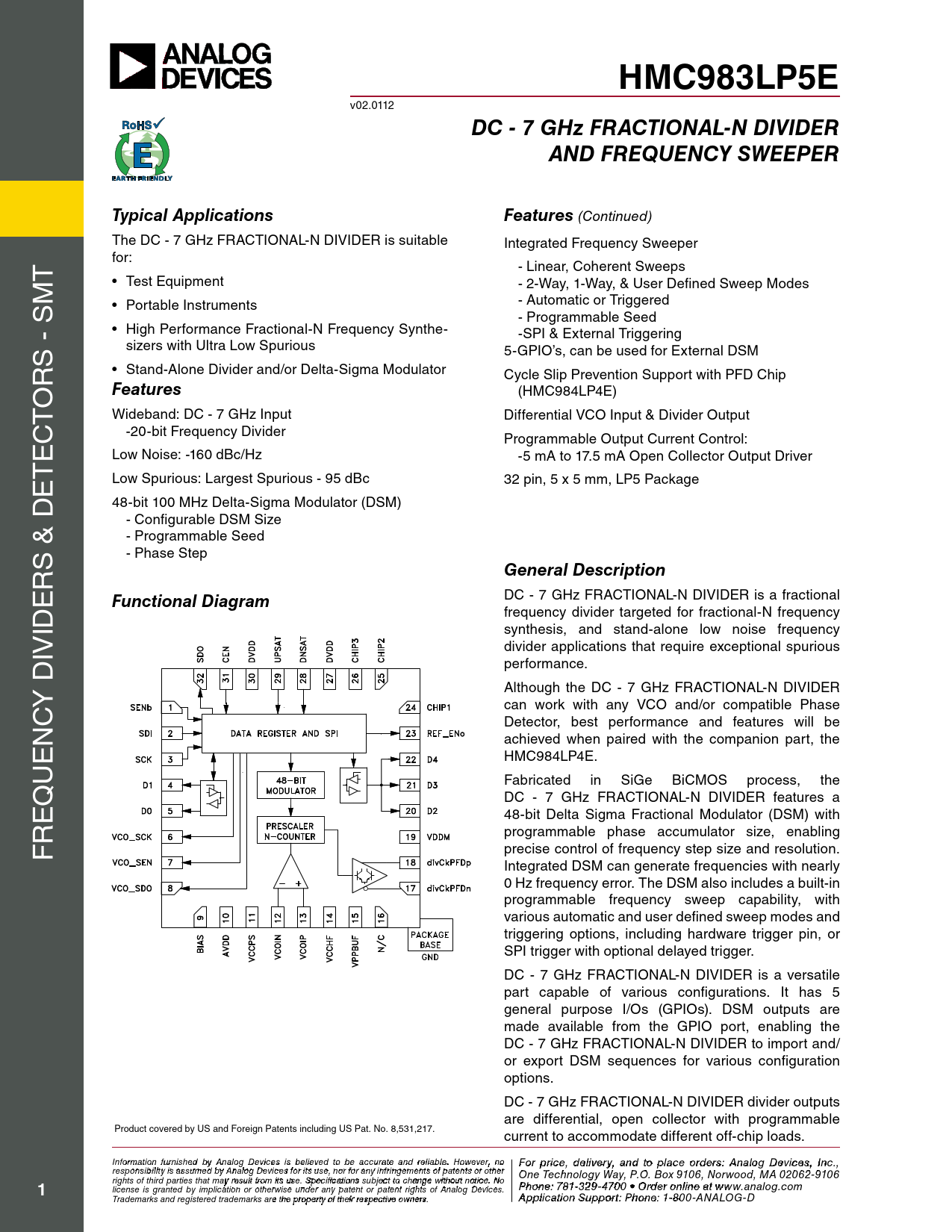 HMC983LP5E v02.0112 DC - 7 GHz FRACTIONAL-N DIVIDERAND FREQUENCY SWEEPERTypical ApplicationsFeatures (Continued) the Dc - 7 GHz FrActionAL-n DiviDer is suitable integrated Frequency sweeper t for: - Linear, coherent sweeps M • test equipment - 2-Way, 1-Way, & user Defined sweep Modes s - Automatic or triggered • Portable instruments - Programmable seed • High Performance Fractional-n Frequency synthe- -sPi & external triggering s - sizers with ultra Low spurious 5-GPio’s, can be used for external DsM r • stand-Alone Divider and/or Delta-sigma Modulator cycle slip Prevention support with PFD chip o Features (HMc984LP4e) t Wideband: Dc - 7 GHz input Differential vco input & Divider output c -20-bit Frequency Divider e Programmable output current control: t Low noise: -160 dBc/Hz -5 mA to 17.5 mA open col ector output Driver e Low spurious: Largest spurious - 95 dBc 32 pin, 5 x 5 mm, LP5 Package 48-bit 100 MHz Delta-sigma Modulator (DsM) - configurable DsM size - Programmable seed s & D - Phase step r General Description e Functional Diagram Dc - 7 GHz FrActionAL-n DiviDer is a fractional iD frequency divider targeted for fractional-n frequency synthesis, and stand-alone low noise frequency iv divider applications that require exceptional spurious performance. y D Although the Dc - 7 GHz FrActionAL-n DiviDer c can work with any vco and/or compatible Phase n Detector, best performance and features will be achieved when paired with the companion part, the e HMc984LP4e. u Fabricated in siGe BicMos process, the q Dc - 7 GHz FrActionAL-n DiviDer features a e 48-bit Delta sigma Fractional Modulator (DsM) with r programmable phase accumulator size, enabling F precise control of frequency step size and resolution. integrated DsM can generate frequencies with nearly 0 Hz frequency error. the DsM also includes a built-in programmable frequency sweep capability, with various automatic and user defined sweep modes and triggering options, including hardware trigger pin, or sPi trigger with optional delayed trigger. Dc - 7 GHz FrActionAL-n DiviDer is a versatile part capable of various configurations. it has 5 general purpose i/os (GPios). DsM outputs are made available from the GPio port, enabling the Dc - 7 GHz FrActionAL-n DiviDer to import and/ or export DsM sequences for various configuration options. Dc - 7 GHz FrActionAL-n DiviDer divider outputs are differential, open col ector with programmable Product covered by US and Foreign Patents including US Pat. No. 8,531,217. current to accommodate different off-chip loads. Inf F or o m r p atio r n ifc ur e n , d ishe e d lbiv y e A r n y a alog n D d t evic o p es is la beclie o eved rd to ebre sa: H ccur iattti e tae M nd re ilicarbloew . H a o ve C wever, o n rp o For price, delivery, and to place orders: Analog Devices, Inc., responsibility is assumed by Analog Devices for its use, nor for any infringements of patents or other oration, 2 Elizabeth Drive, Chelmsford, MA 01824 One Technology Way, P.O. Box 9106, Norwood, MA 02062-9106 Phone: 978-250-3343 Fax: 978-250-3373 O rights of third parties that may result from its use. Specifications subject to change without notice. No P rd ho e ne r O : 7 n 81- -3li 2n 9 e a -47 t w 0 w 0 • O w rd .h e it r o tniltie n .c e ao t m 1 license is granted by implication or otherwise under any patent or patent rights of Analog Devices. www.analog.com Application Support: Pho Trademarks and registered trademarks are the property of their respective owners. ne: 978-250-33 A 4 p 3 o plica r a tio p n S p u s p @ po h rt itt : P ite ho . n c e o : 1m -800-ANALOG-D