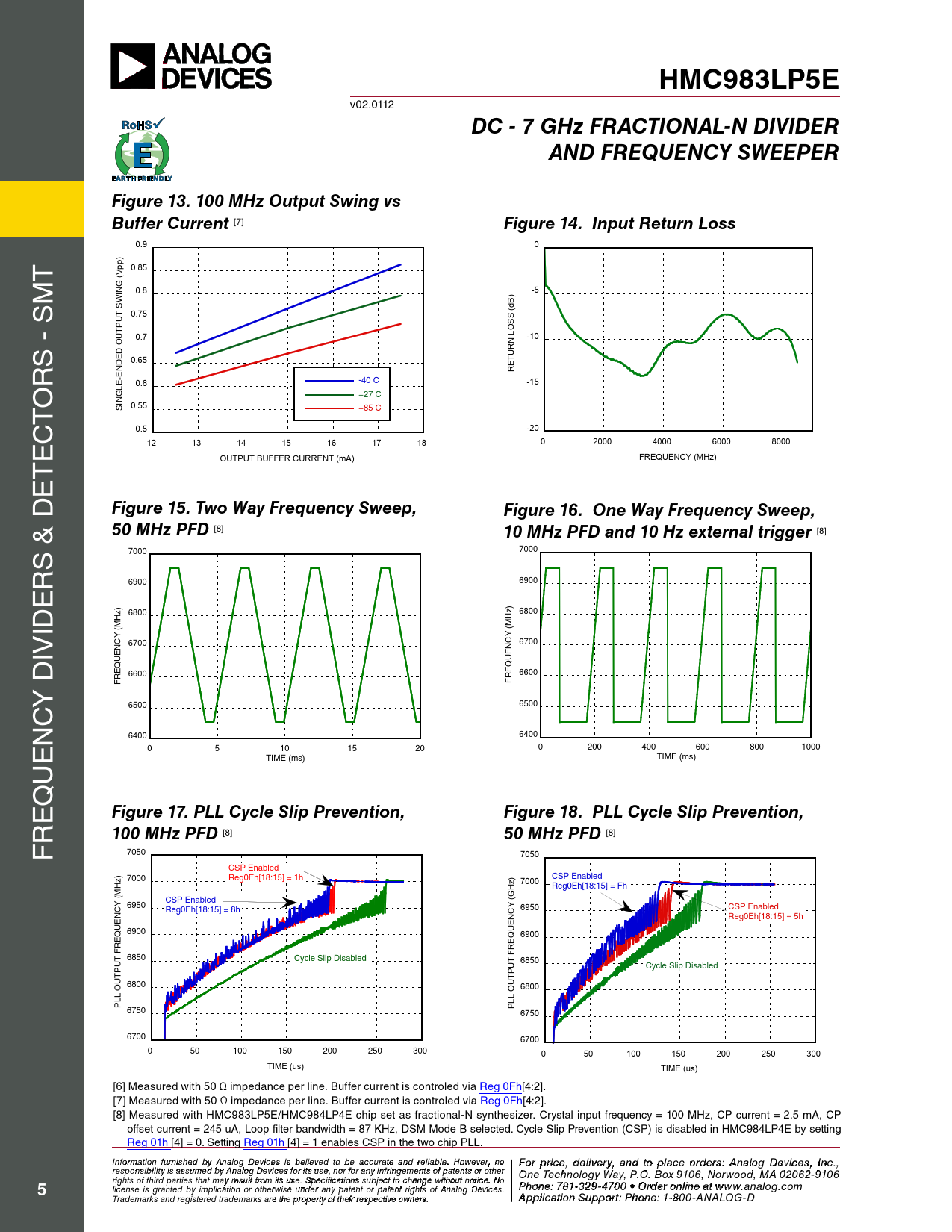 HMC983LP5E v02.0112 DC - 7 GHz FRACTIONAL-N DIVIDERAND FREQUENCY SWEEPERFigure 13. 100 MHz Output Swing vs Buffer Current [7] Figure 14. Input Return Loss 0.9 0 t pp) 0.85 M ING (V 0.8 -5 ) s W B 0.75 (d UT S S S O 0.7 -10 s - D OUTP 0.65 TURN L r NDE RE -E -40 C -15 o E 0.6 +27 C t INGL S 0.55 +85 C c 0.5 -20 e 12 13 14 15 16 17 18 0 2000 4000 6000 8000 t OUTPUT BUFFER CURRENT (mA) FREQUENCY (MHz) e Figure 15. Two Way Frequency Sweep,Figure 16. One Way Frequency Sweep,50 MHz PFD [8] 10 MHz PFD and 10 Hz external trigger [8] s & D 7000 7000 r 6900 6900 e ) iD 6800 6800 Hz Hz (M (M iv 6700 6700 NCY NCY UE UE Q Q 6600 6600 RE RE F y D F c 6500 6500 n 6400 6400 e 0 5 10 15 20 0 200 400 600 800 1000 TIME (ms) TIME (ms) u q e Figure 17. PLL Cycle Slip Prevention,Figure 18. PLL Cycle Slip Prevention, r 100 MHz PFD [8] 50 MHz PFD [8] F 7050 7050 CSP Enabled ) 7000 Reg0Eh[18:15] = 1h 7000 CSP Enabled Hz Reg0Eh[18:15] = Fh (M CSP Enabled (GHz) 6950 Reg0Eh[18:15] = 8h 6950 CSP Enabled NCY NCY Reg0Eh[18:15] = 5h UE 6900 UE Q Q 6900 RE F 6850 Cycle Slip Disabled 6850 UT UT FRE Cycle Slip Disabled P UT 6800 O 6800 L L LL OUTP P 6750 P 6750 6700 6700 0 50 100 150 200 250 300 0 50 100 150 200 250 300 TIME (us) TIME (us) [6] Measured with 50 Ω impedance per line. Buffer current is controled via reg 0Fh[4:2]. [7] Measured with 50 Ω impedance per line. Buffer current is controled via reg 0Fh[4:2]. [8] Measured with HMc983LP5e/HMc984LP4e chip set as fractional-n synthesizer. crystal input frequency = 100 MHz, cP current = 2.5 mA, cP offset current = 245 uA, Loop filter bandwidth = 87 KHz, DsM Mode B selected. cycle slip Prevention (csP) is disabled in HMc984LP4e by setting reg 01h [4] = 0. setting reg 01h [4] = 1 enables csP in the two chip PLL. Inf F or o m r p atio r n ifc ur e n , d ishe e d lbiv y e A r n y a alog n D d t evic o p es is la beclie o eved rd to ebre sa: H ccur iattti e tae M nd re ilicarbloew . H a o ve C wever, o n rp o For price, delivery, and to place orders: Analog Devices, Inc., responsibility is assumed by Analog Devices for its use, nor for any infringements of patents or other oration, 2 Elizabeth Drive, Chelmsford, MA 01824 One Technology Way, P.O. Box 9106, Norwood, MA 02062-9106 Phone: 978-250-3343 Fax: 978-250-3373 O rights of third parties that may result from its use. Specifications subject to change without notice. No P rd ho e ne r O : 7 n 81- -3li 2n 9 e a -47 t w 0 w 0 • O w rd .h e it r o tniltie n .c e ao t m 5 license is granted by implication or otherwise under any patent or patent rights of Analog Devices. www.analog.com Application Support: Pho Trademarks and registered trademarks are the property of their respective owners. ne: 978-250-33 A 4 p 3 o plica r a tio p n S p u s p @ po h rt itt : P ite ho . n c e o : 1m -800-ANALOG-D