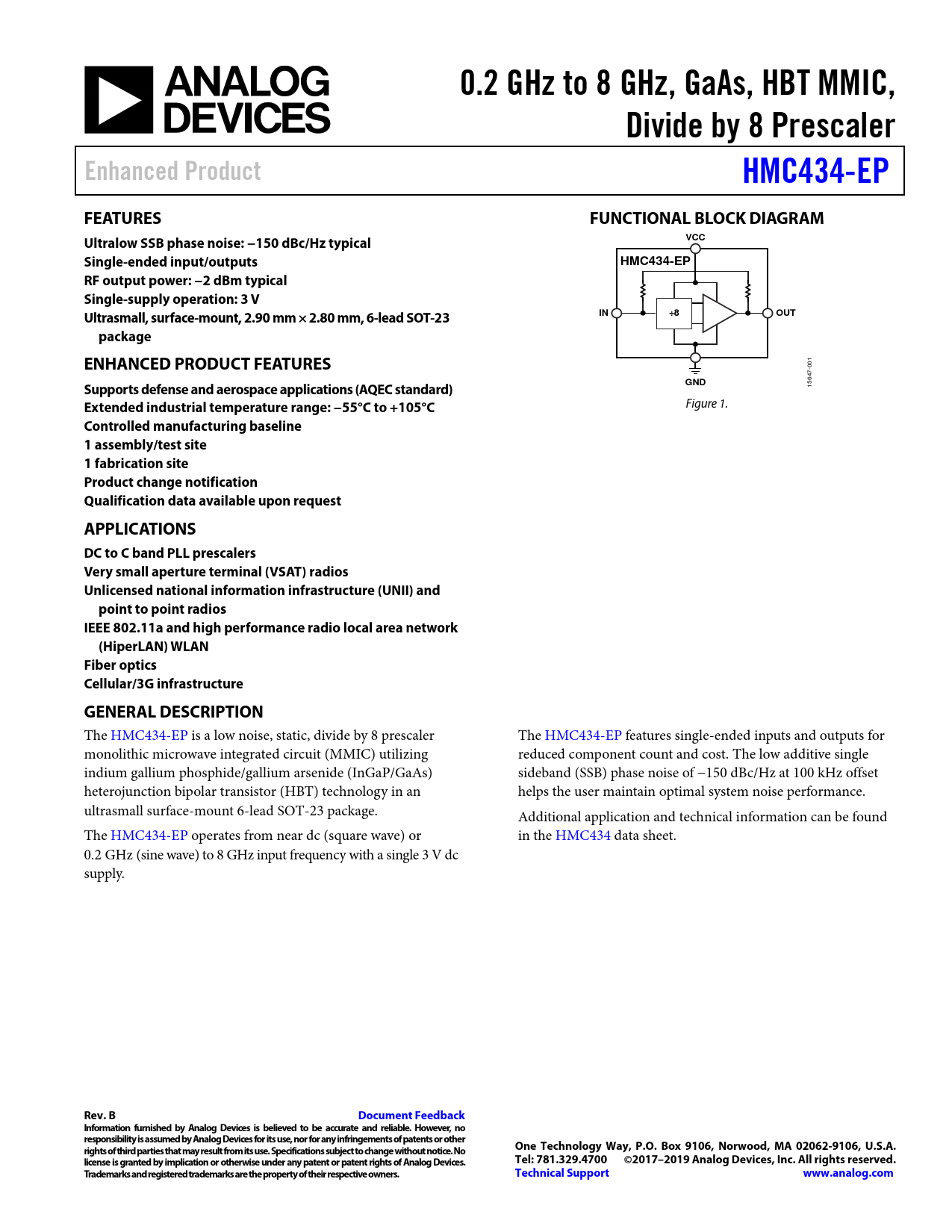 The HMC434-EP is a low noise, static, divide by 8 prescaler The HMC434-EP features single-ended inputs and outputs for monolithic microwave integrated circuit (MMIC) utilizing reduced component count and cost. The low additive single indium gallium phosphide/gallium arsenide (InGaP/GaAs) sideband (SSB) phase noise of −150 dBc/Hz at 100 kHz offset heterojunction bipolar transistor (HBT) technology in an helps the user maintain optimal system noise performance. ultrasmall surface-mount 6-lead SOT-23 package. Additional application and technical information can be found The HMC434-EP operates from near dc (square wave) or in the HMC434 data sheet. 0.2 GHz (sine wave) to 8 GHz input frequency with a single 3 V dc supply.
