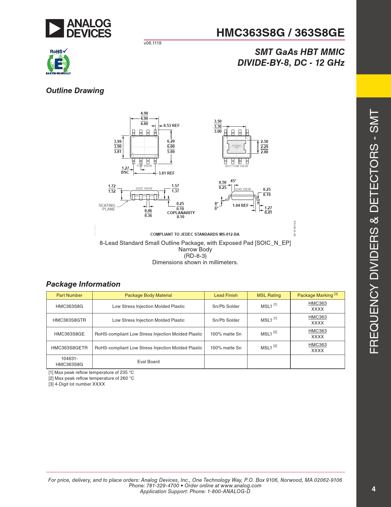 HMC363S8G / 363S8GE v06.1119 SMT GaAs HBT MMICDIVIDE-BY-8, DC - 12 GHz8-Lead Standard Small Outline Package, with Exposed Pad [SOIC_N_EP]Narrow Body(RD-8-3)Outline DrawingDimensions shown in millimeters.4.98 t 4.903.504.800.53 REF M 3.303.00 s 853.996.202.503.906.00EXPOSEDPAD2.293.815.802.00 s - 14 r 1.27TOP VIEWBOTTOM VIEW o BSC3.81 REF t 0.50 45° c 1.721.57SIDE VIEW0.25END VIEW0.251.37 e 1.520.19 t 0.258°SEATING1.04 REF e PLANE0.100°1.270.46COPLANARITY0.410.360.10PKG-006220COMPLIANT TO JEDEC STANDARDS MS-012-BA04-10-2019-A s & D 8-Lead standard small outline Package, with exposed Pad [soic_n_eP] r narrow Body e (rD-8-3) Dimensions shown in mil imeters. iD iv Package Information y D Part number Package Body Material Lead Finish MsL rating Package Marking [3] c HMc363s8G Low stress injection Molded Plastic sn/Pb solder MsL1 [1] HMc363 n XXXX e HMc363s8Gtr Low stress injection Molded Plastic sn/Pb solder MsL1 [1] HMc363 XXXX u q HMc363s8Ge roHs-compliant Low stress injection Molded Plastic 100% matte sn MsL1 [2] HMc363 XXXX e HMc363s8Getr roHs-compliant Low stress injection Molded Plastic 100% matte sn MsL1 [2] HMc363 r XXXX F 104631- eval Board HMc363s8G [1] Max peak reflow temperature of 235 °c [2] Max peak reflow temperature of 260 °c [3] 4-Digit lot number XXXX For price, delivery, and to place orders: Analog Devices, Inc., One Technology Way, P.O. Box 9106, Norwood, MA 02062-9106 Phone: 781-329-4700 • Order online at www.analog.com 4 Application Support: Phone: 1-800-ANALOG-D Document Outline Typical Applications Features Functional Diagram General Description Electrical Specifications, TA = +25° C, 50 Ohm System, Vcc= 5V Operating Chracteristics Input Sensitivity Window, T= 25 °C Input Sensitivity Window vs. Temperature Output Power vs. Temperature SSB Phase Noise Performance, Pin= 0 dBm, T= 25 °C Output Harmonic Content, Pin= 0 dBm, T= 25 °C Reverse Leakage, Pin= 0 dBm, T= 25 °C Output Voltage Waveform, Pin= 0 dBm, Fout= 882 MHz, T= 25 °C Absolute Maximum Ratings Typical Supply Current vs. Vcc Outline Drawing Package Information Pin Description Application Circuit Evaluation PCB List of Materials for Evaluation PCB 104631 [1]
