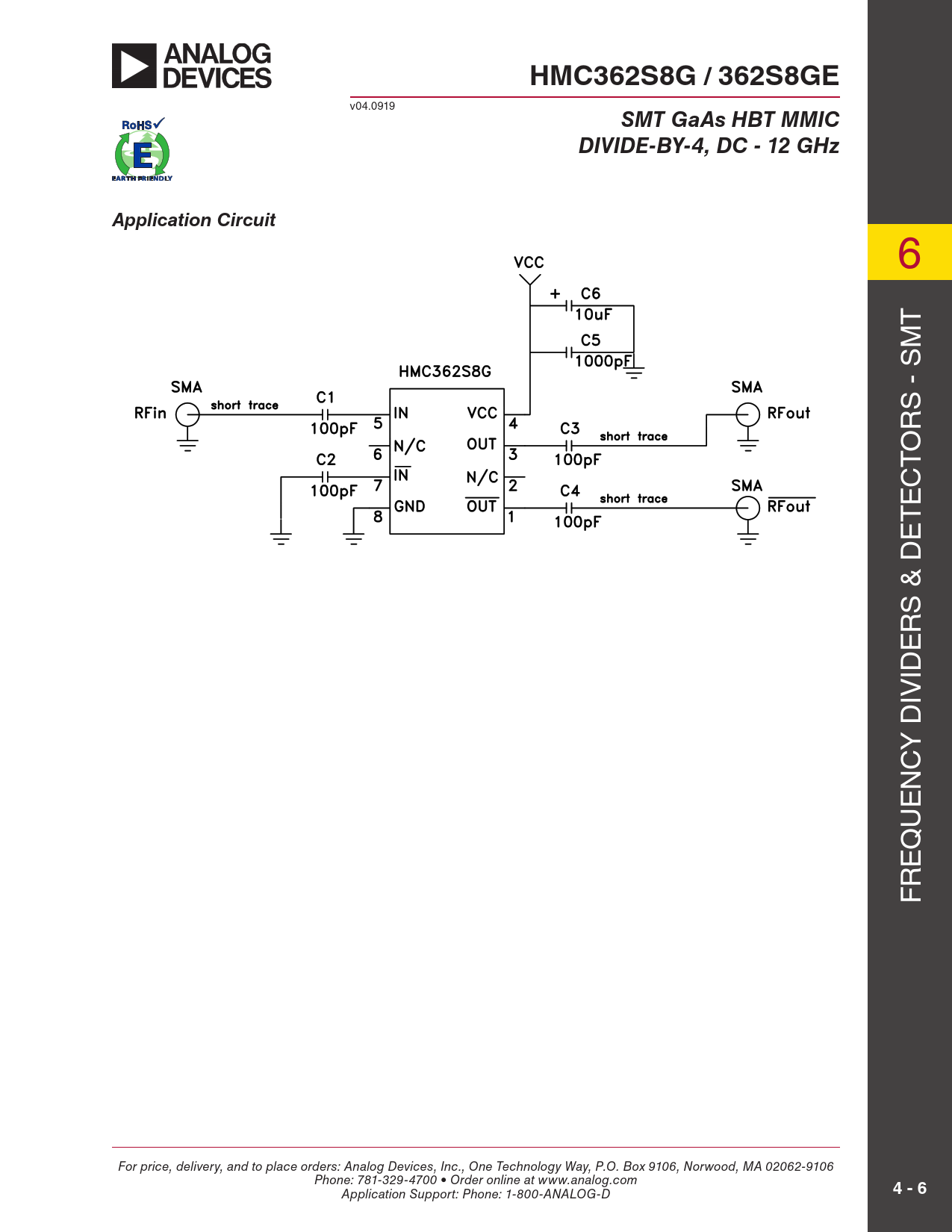 HMC362S8G / 362S8GE v04.0919 SMT GaAs HBT MMICDIVIDE-BY-4, DC - 12 GHzApplication Circuit 6 6 T T M M S - S S - S R R O O T T C C E E T T E E S & D S & D R R E E ID ID IV IV Y D Y D C C N N E E U U Q Q E E R R F F For price, delivery, and to place orders: Analog Devices, Inc., One Technology Way, P.O. Box 9106, Norwood, MA 02062-9106 Phone: 781-329-4700 • Order online at www.analog.com 4 - 6 Application Support: Phone: 1-800-ANALOG-D