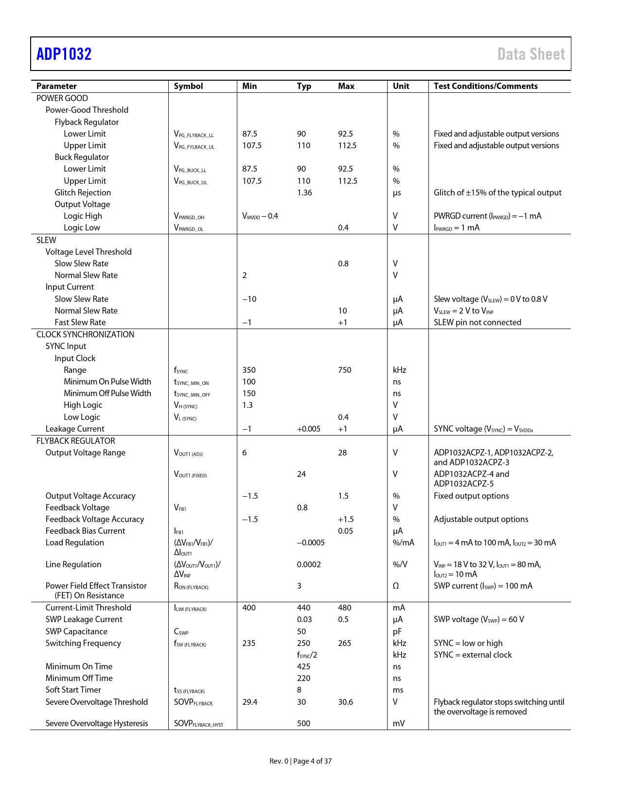 Páginas / Página37 / 4 — ADP1032. Data Sheet. Parameter. Symbol. Min. Typ. Max. Unit. Test …