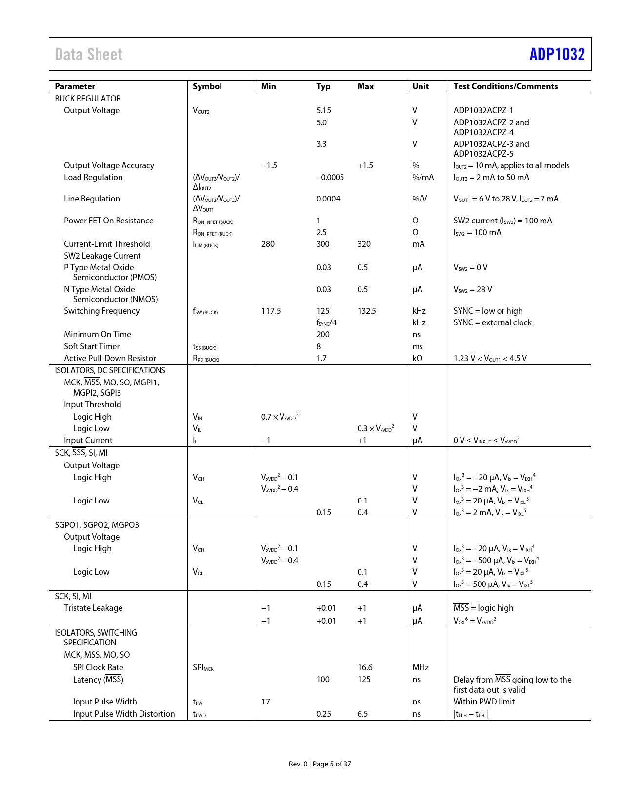 Páginas / Página37 / 5 — Data Sheet. ADP1032. Parameter. Symbol. Min. Typ. Max. Unit. Test …