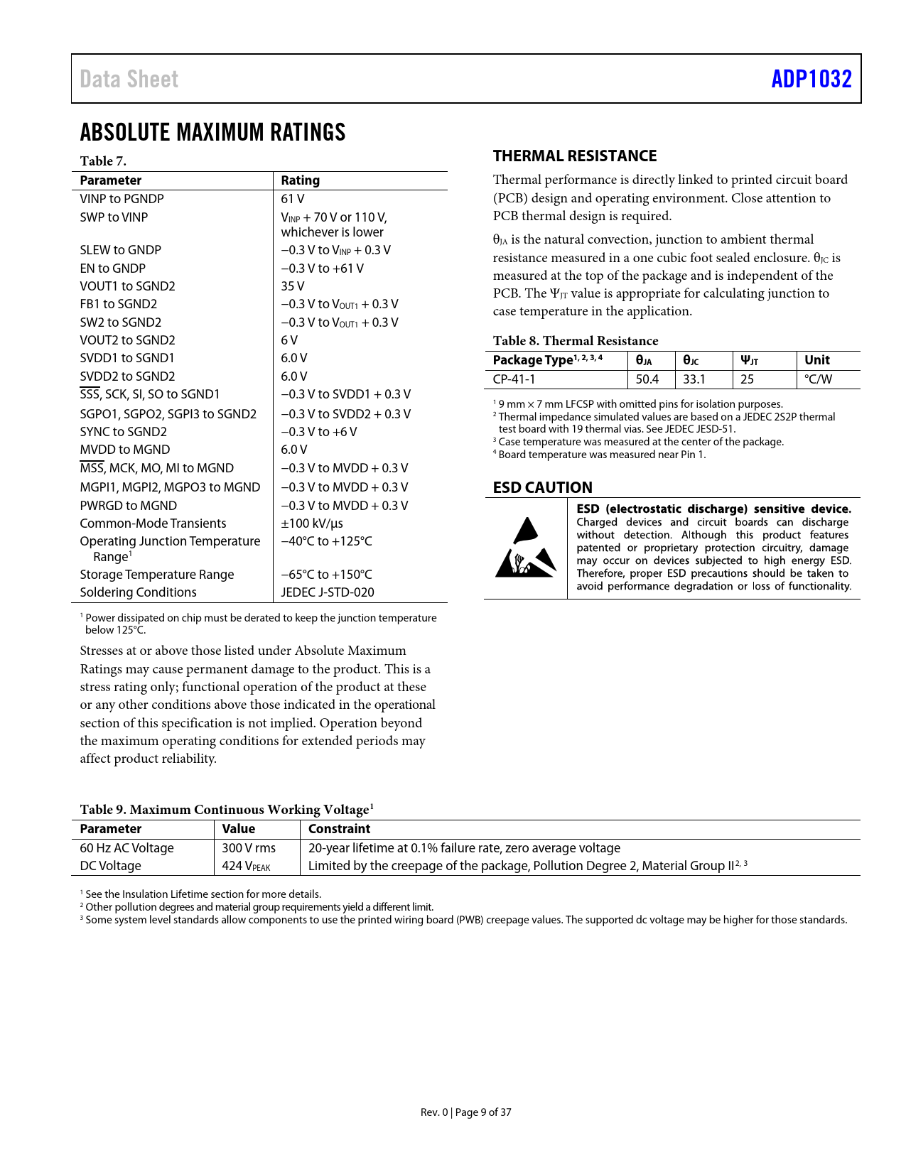 Data Sheet ADP1032 ABSOLUTE MAXIMUM RATINGS Table 7 THERMAL RESISTANCE Parameter Rating Table 8 Thermal Resistance