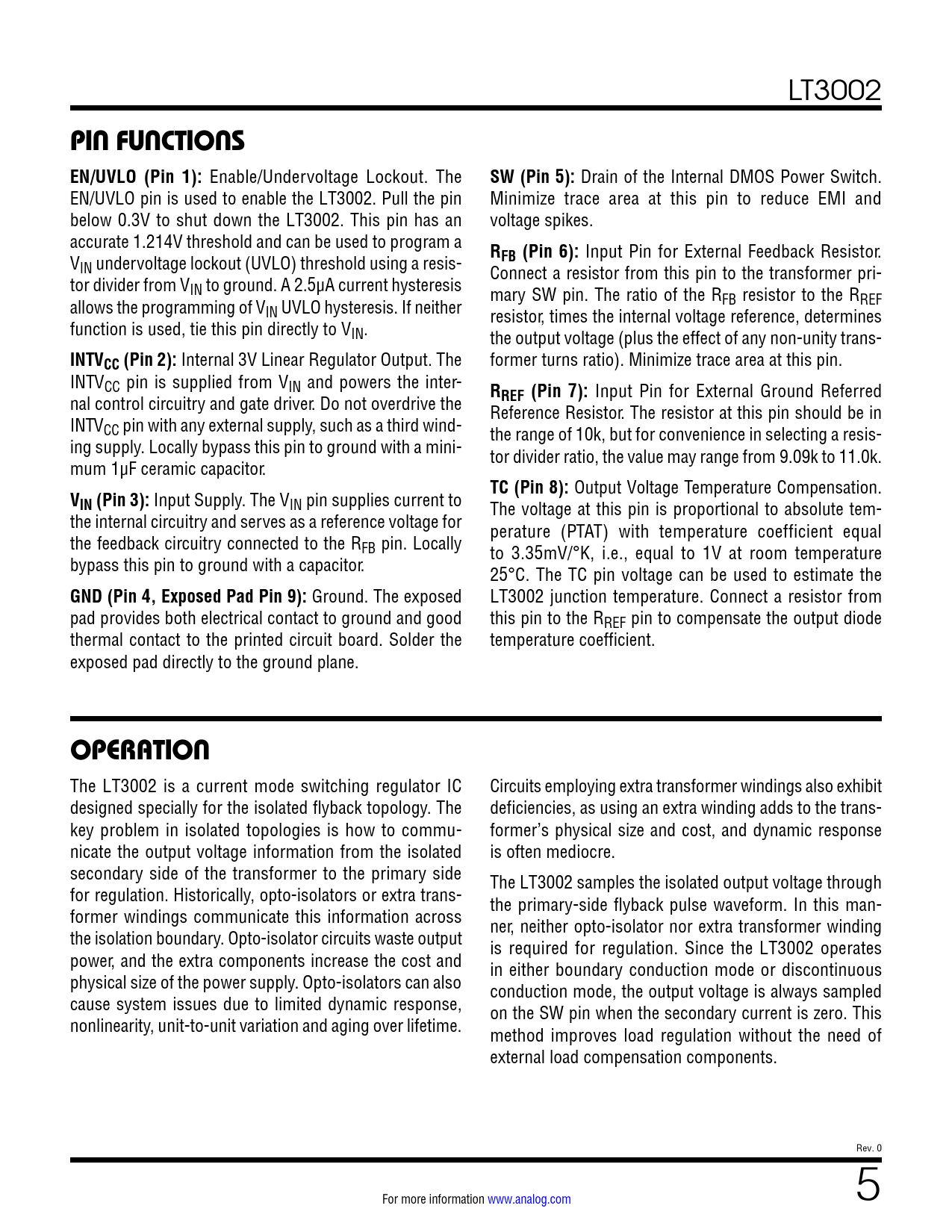 Input Pin for External Feedback Resistor. IN undervoltage lockout (UVLO) threshold using a resis- Connect a resistor from this pin to the transformer pri- tor divider from VIN to ground. A 2.5µA current hysteresis mary SW pin. The ratio of the R al ows the programming of V FB resistor to the RREF IN UVLO hysteresis. If neither resistor, times the internal voltage reference, determines function is used, tie this pin directly to VIN. the output voltage (plus the effect of any non-unity trans-
