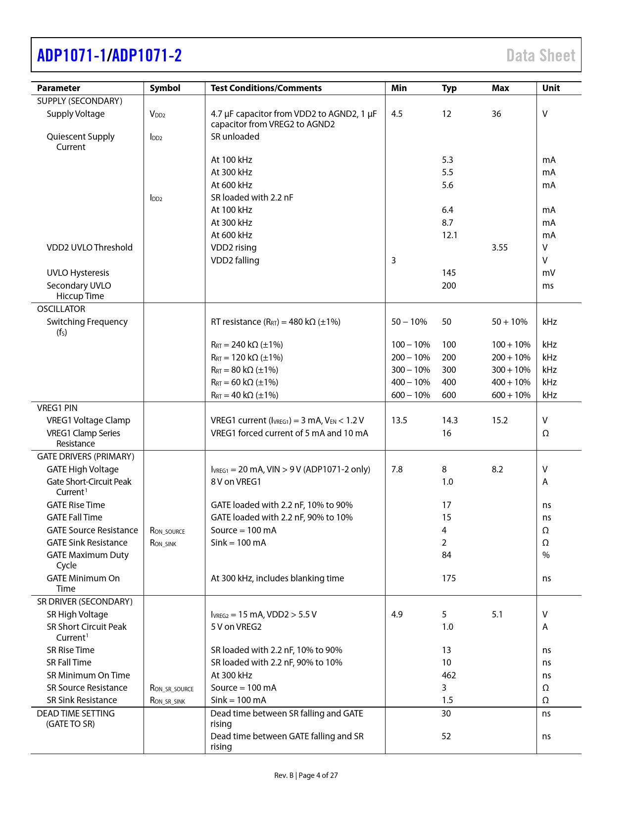Páginas / Página27 / 4 — ADP1071-1. /ADP1071-2. Data Sheet. Parameter. Symbol. Test …