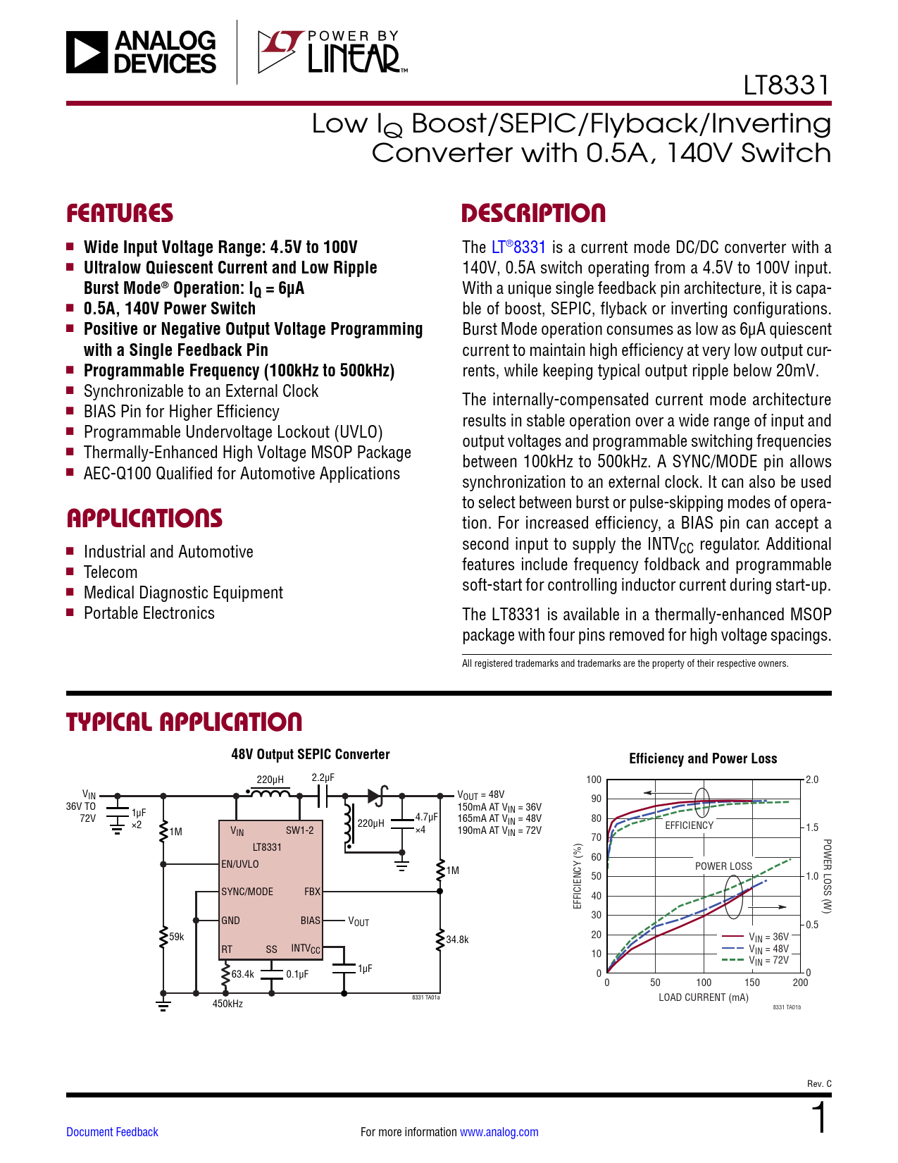LT8331 Low IQ Boost/SEPIC/Flyback/Inverting Converter with 0.5A, 140V Switch FEATURESDESCRIPTION n Wide Input Voltage Range: 4.5V to 100V The LT®8331 is a current mode DC/DC converter with a n Ultralow Quiescent Current and Low Ripple 140V, 0.5A switch operating from a 4.5V to 100V input. Burst Mode® Operation: IQ = 6µA With a unique single feedback pin architecture, it is capa- n 0.5A, 140V Power Switch ble of boost, SEPIC, flyback or inverting configurations. n Positive or Negative Output Voltage Programming Burst Mode operation consumes as low as 6μA quiescent with a Single Feedback Pin current to maintain high efficiency at very low output cur- n Programmable Frequency (100kHz to 500kHz) rents, while keeping typical output ripple below 20mV. n Synchronizable to an External Clock The internally-compensated current mode architecture n BIAS Pin for Higher Efficiency results in stable operation over a wide range of input and n Programmable Undervoltage Lockout (UVLO) output voltages and programmable switching frequencies n Thermally-Enhanced High Voltage MSOP Package between 100kHz to 500kHz. A SYNC/MODE pin allows n AEC-Q100 Qualified for Automotive Applications synchronization to an external clock. It can also be used to select between burst or pulse-skipping modes of opera- APPLICATIONS tion. For increased efficiency, a BIAS pin can accept a n second input to supply the INTVCC regulator. Additional Industrial and Automotive n features include frequency foldback and programmable Telecom n soft-start for controlling inductor current during start-up. Medical Diagnostic Equipment n Portable Electronics The LT8331 is available in a thermally-enhanced MSOP package with four pins removed for high voltage spacings. All registered trademarks and trademarks are the property of their respective owners. TYPICAL APPLICATION48V Output SEPIC ConverterEfficiency and Power Loss 220μH 2.2µF 100 2.0 • VIN VOUT = 48V 90 36V TO 150mA AT VIN = 36V 72V 1µF 4.7µF 80 ×2 220μH 165mA AT VIN = 48V 1M V EFFICIENCY IN SW1-2 ×4 190mA AT VIN = 72V 1.5 70 POWER LOSS (W) LT8331 • 60 EN/UVLO 1M POWER LOSS 50 1.0 SYNC/MODE FBX 40 EFFICIENCY (%) GND BIAS V 30 OUT 0.5 59k 34.8k 20 VIN = 36V RT SS INTVCC VIN = 48V 10 VIN = 72V 63.4k 0.1µF 1µF 0 0 0 50 100 150 200 8331 TA01a LOAD CURRENT (mA) 450kHz 8331 TA01b Rev. C Document Feedback For more information www.analog.com 1 Document Outline Features Applications Typical Application Description Absolute Maximum Ratings Order Information Electrical Characteristics Pin Configuration Electrical Characteristics Typical Performance Characteristics Pin Functions Block Diagram Operation Applications Information Typical Applications Package Description Revision History Typical Application Related Parts