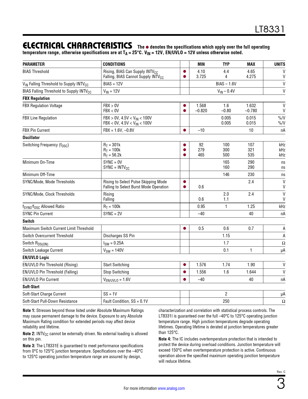 link to page 2 LT8331 ELECTRICAL CHARACTERISTICSThe l denotes the specifications which apply over the full operatingtemperature range, otherwise specifications are at TA = 25°C. VIN = 12V, EN/UVLO = 12V unless otherwise noted.PARAMETERCONDITIONSMINTYPMAXUNITS BIAS Threshold Rising, BIAS Can Supply INTVCC l 4.10 4.4 4.65 V Falling, BIAS Cannot Supply INTVCC l 3.725 4 4.275 V VIN Falling Threshold to Supply INTVCC BIAS = 12V BIAS – 1.6V V BIAS Falling Threshold to Supply INTVCC VIN = 12V VIN – 0.4V V FBX Regulation FBX Regulation Voltage FBX > 0V l 1.568 1.6 1.632 V FBX < 0V l –0.820 –0.80 –0.780 V FBX Line Regulation FBX > 0V, 4.5V < VIN < 100V 0.005 0.015 %/V FBX < 0V, 4.5V < VIN < 100V 0.005 0.015 %/V FBX Pin Current FBX = 1.6V, –0.8V l –10 10 nA Oscillator Switching Frequency (fOSC) RT = 301k l 92 100 107 kHz RT = 100k l 279 300 321 kHz RT = 56.2k l 465 500 535 kHz Minimum On-Time SYNC = 0V 165 290 ns SYNC = INTVCC 160 290 ns Minimum Off-Time 146 230 ns SYNC/Mode, Mode Thresholds Rising to Select Pulse Skipping Mode l 2.4 V Falling to Select Burst Mode Operation l 0.6 V SYNC/Mode, Clock Thresholds Rising 2.0 2.4 V Falling 0.6 1.1 V fSYNC/fOSC Allowed Ratio RT = 100k 0.95 1 1.25 kHz SYNC Pin Current SYNC = 2V –40 40 nA Switch Maximum Switch Current Limit Threshold l 0.5 0.6 0.7 A Switch Overcurrent Threshold Discharges SS Pin 1.15 A Switch RDS(ON) ISW = 0.25A 1.7 Ω Switch Leakage Current VSW = 140V 0.1 1 µA EN/UVLO Logic EN/UVLO Pin Threshold (Rising) Start Switching l 1.576 1.74 1.90 V EN/UVLO Pin Threshold (Falling) Stop Switching l 1.556 1.6 1.644 V EN/UVLO Pin Current VEN/UVLO = 1.6V l –40 40 nA Soft-Start Soft-Start Charge Current SS = 1V 2 µA Soft-Start Pull-Down Resistance Fault Condition, SS = 0.1V 250 Ω Note 1: Stresses beyond those listed under Absolute Maximum Ratings characterization and correlation with statistical process controls. The may cause permanent damage to the device. Exposure to any Absolute LT8331I is guaranteed over the full –40°C to 125°C operating junction Maximum Rating condition for extended periods may affect device temperature range. High junction temperatures degrade operating reliability and lifetime. lifetimes. Operating lifetime is derated at junction temperatures greater Note 2: INTV than 125°C. CC cannot be externally driven. No external loading is allowed on this pin. Note 4: The IC includes overtemperature protection that is intended to Note 3: The LT8331E is guaranteed to meet performance specifications protect the device during overload conditions. Junction temperature will from 0°C to 125°C junction temperature. Specifications over the –40°C exceed 150°C when overtemperature protection is active. Continuous to 125°C operating junction temperature range are assured by design, operation above the specified maximum operating junction temperature will reduce lifetime. Rev. C For more information www.analog.com 3 Document Outline Features Applications Typical Application Description Absolute Maximum Ratings Order Information Electrical Characteristics Pin Configuration Electrical Characteristics Typical Performance Characteristics Pin Functions Block Diagram Operation Applications Information Typical Applications Package Description Revision History Typical Application Related Parts