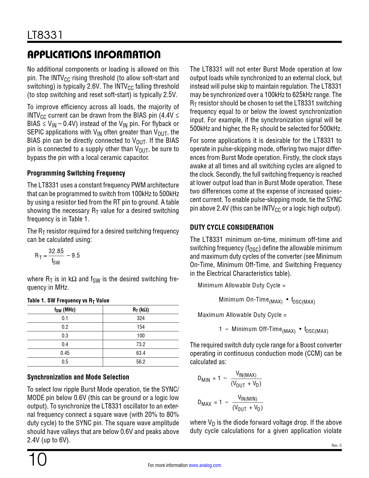 T resistor required for a desired switching frequency can be calculated using: The LT8331 minimum on-time, minimum off-time and 32.85 switching frequency (fOSC) define the allowable minimum RT = – 9.5 and maximum duty cycles of the converter (see Minimum f SW On-Time, Minimum Off-Time, and Switching Frequency in the Electrical Characteristics table). where RT is in kΩ and fSW is the desired switching fre- quency in MHz. Minimum Al owable Duty Cycle =