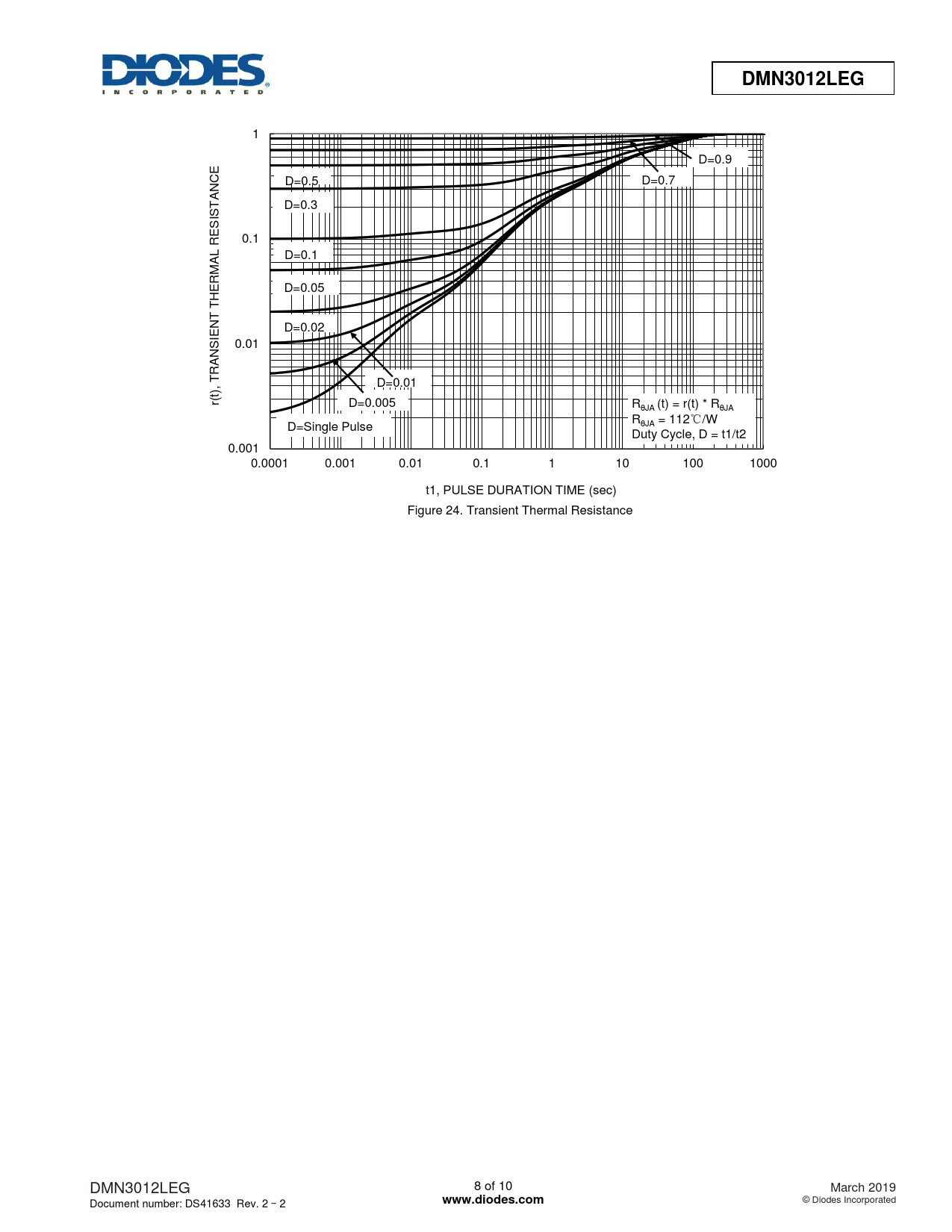 1 D=0.9 E C D=0.5 D=0.7 N TA D=0.3 SI S E 0.1 R LA D=0.1 M R E D=0.05 TH T N E D=0.02 I S 0.01 N A TR, D=0.01 )t(r D=0.005 Rθ (t) = r(t) * R JA θJA Rθ = 112℃/W JA D=Single Pulse Duty Cycle, D = t1/t2 0.001 0.0001 0.001 0.01 0.1 1 10 100 1000 t1, PULSE DURATION TIME (sec) Figure 24. Transient Thermal Resistance DMN3012LEG 8 of 10 March 2019 Document number: DS41633 Rev. 2 - 2