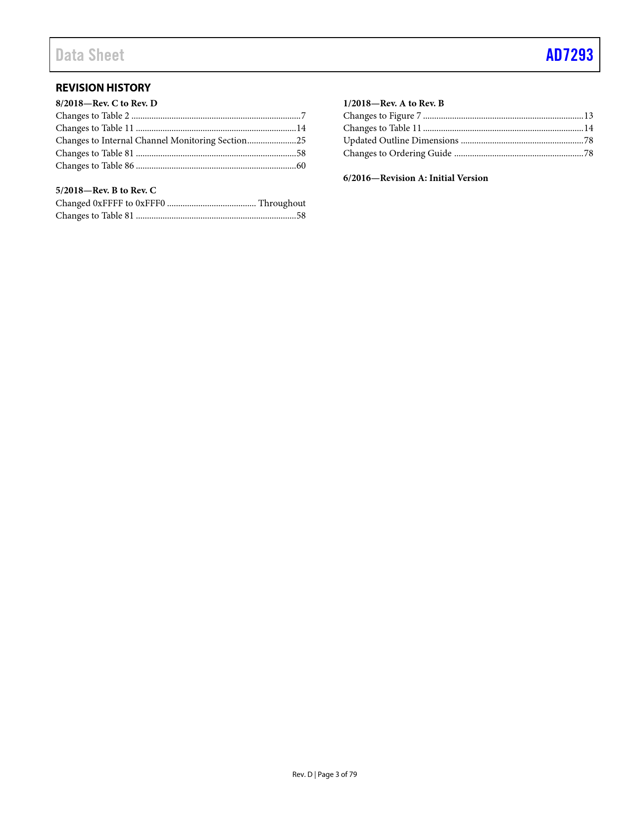 | Páginas / Página | 79 / 3 — Data Sheet. AD7293. REVISION HISTORY 8/2018—Rev. C to Rev. D. 1/2018—Rev. … |