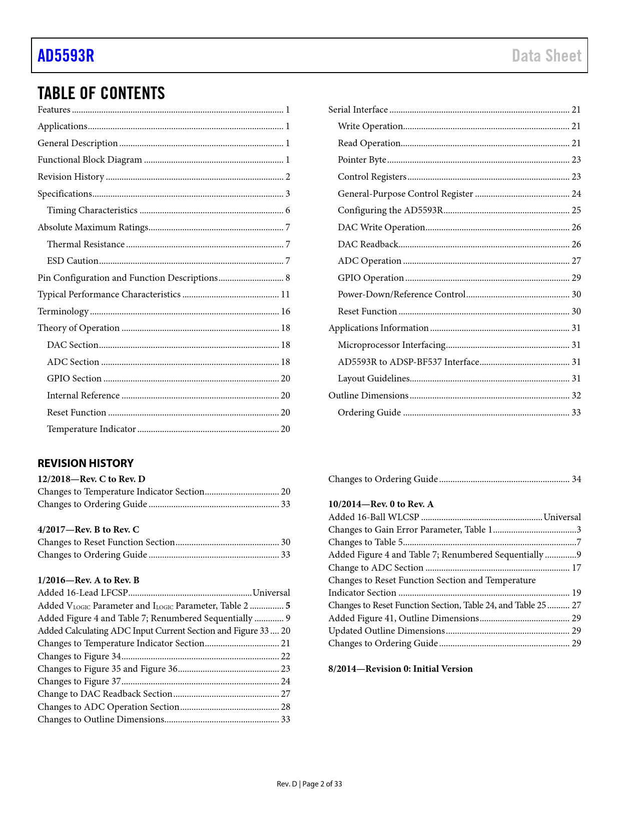link to page 1 link to page 1 link to page 1 link to page 1 link to page 2 link to page 3 link to page 6 link to page 7 link to page 7 link to page 7 link to page 8 link to page 11 link to page 16 link to page 18 link to page 18 link to page 18 link to page 20 link to page 20 link to page 20 link to page 20 link to page 21 link to page 21 link to page 21 link to page 23 link to page 23 link to page 24 link to page 25 link to page 26 link to page 26 link to page 27 link to page 29 link to page 30 link to page 30 link to page 31 link to page 31 link to page 31 link to page 31 link to page 32 link to page 33 AD5593RData SheetTABLE OF CONTENTS Features .. 1 Serial Interface .. 21 Applications ... 1 Write Operation.. 21 General Description ... 1 Read Operation... 21 Functional Block Diagram .. 1 Pointer Byte ... 23 Revision History ... 2 Control Registers .. 23 Specifications ... 3 General-Purpose Control Register .. 24 Timing Characteristics .. 6 Configuring the AD5593R .. 25 Absolute Maximum Ratings .. 7 DAC Write Operation .. 26 Thermal Resistance .. 7 DAC Readback .. 26 ESD Caution .. 7 ADC Operation .. 27 Pin Configuration and Function Descriptions ... 8 GPIO Operation ... 29 Typical Performance Characteristics ... 11 Power-Down/Reference Control .. 30 Terminology .. 16 Reset Function .. 30 Theory of Operation .. 18 Applications Information .. 31 DAC Section .. 18 Microprocessor Interfacing ... 31 ADC Section ... 18 AD5593R to ADSP-BF537 Interface .. 31 GPIO Section .. 20 Layout Guidelines... 31 Internal Reference .. 20 Outline Dimensions ... 32 Reset Function .. 20 Ordering Guide .. 33 Temperature Indicator ... 20 REVISION HISTORY12/2018—Rev. C to Rev. D Changes to Ordering Guide .. 34 Changes to Temperature Indicator Section ... 20 Changes to Ordering Guide .. 33 10/2014—Rev. 0 to Rev. A Added 16-Ball WLCSP .. Universal 4/2017—Rev. B to Rev. C Changes to Gain Error Parameter, Table 1 ... 3 Changes to Reset Function Section .. 30 Changes to Table 5 ... 7 Changes to Ordering Guide .. 33 Added Figure 4 and Table 7; Renumbered Sequentially .. 9 Change to ADC Section .. 17 1/2016—Rev. A to Rev. B Changes to Reset Function Section and Temperature Added 16-Lead LFCSP ... Universal Indicator Section .. 19 Added VLOGIC Parameter and ILOGIC Parameter, Table 2 ... 5 Changes to Reset Function Section, Table 24, and Table 25 .. 27 Added Figure 4 and Table 7; Renumbered Sequentially ... 9 Added Figure 41, Outline Dimensions .. 29 Added Calculating ADC Input Current Section and Figure 33 .. 20 Updated Outline Dimensions ... 29 Changes to Temperature Indicator Section ... 21 Changes to Ordering Guide .. 29 Changes to Figure 34 .. 22 Changes to Figure 35 and Figure 36 ... 23 8/2014—Revision 0: Initial Version Changes to Figure 37 .. 24 Change to DAC Readback Section ... 27 Changes to ADC Operation Section .. 28 Changes to Outline Dimensions ... 33 Rev. D | Page 2 of 33 Document Outline Features Applications General Description Functional Block Diagram Revision History Specifications Timing Characteristics Timing Diagram Absolute Maximum Ratings Thermal Resistance ESD Caution Pin Configuration and Function Descriptions Typical Performance Characteristics Terminology Theory of Operation DAC Section Resistor String DAC Output Buffer ADC Section Calculating ADC Input Current GPIO Section Internal Reference Reset Function Temperature Indicator Serial Interface Write Operation Read Operation Pointer Byte Control Registers General-Purpose Control Register Configuring the AD5593R DAC Write Operation LDAC Mode Operation DAC Readback ADC Operation GPIO Operation Setting Pins as Outputs Setting Pins as Inputs Three-State Pins 85 kΩ Pull-Down Pins Power-Down/Reference Control Reset Function Applications Information Microprocessor Interfacing AD5593R to ADSP-BF537 Interface Layout Guidelines Outline Dimensions Ordering Guide