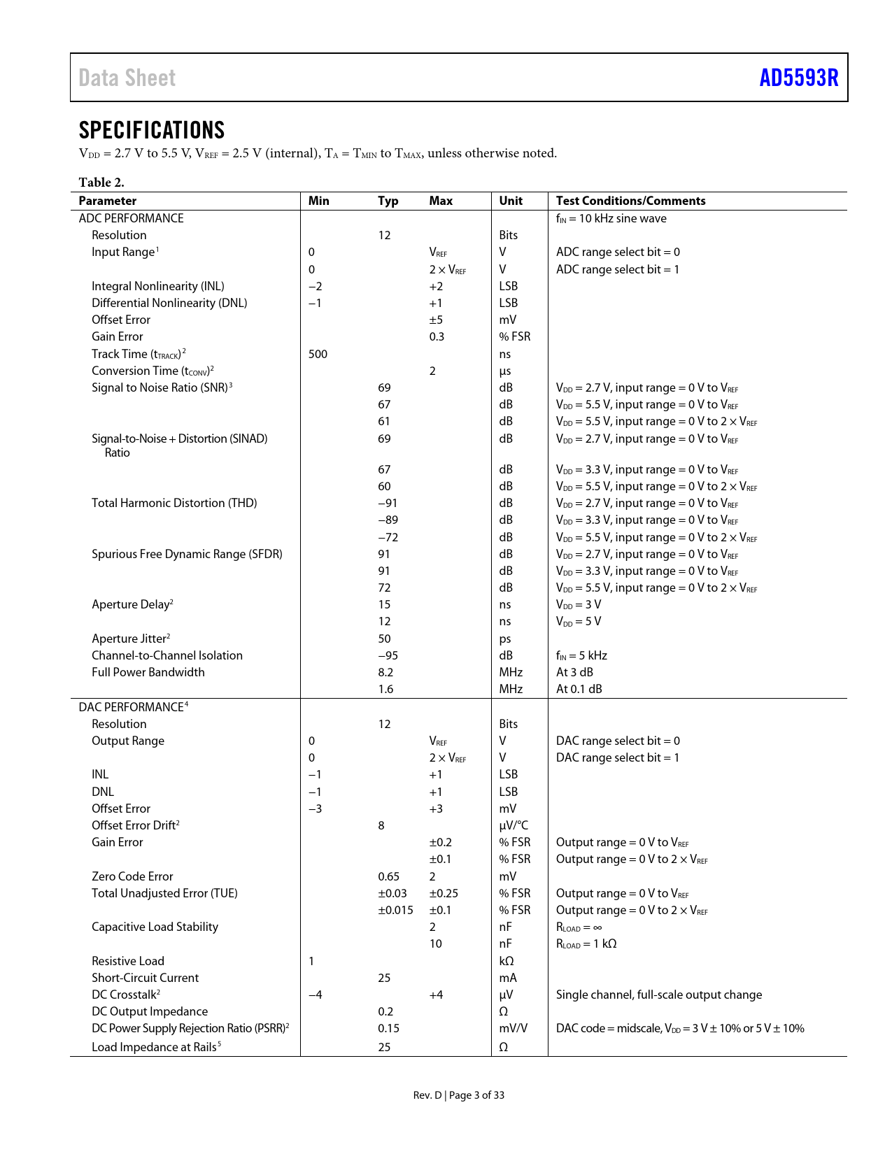 Páginas / Página33 / 3 — Data Sheet. AD5593R. SPECIFICATIONS. Table 2. Parameter. Min. Typ. Max. …