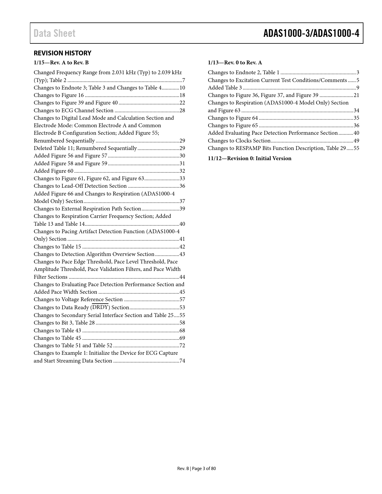Changed Frequency Range from 2.031 kHz (Typ) to 2.039 kHz Changes to Endnote 2, Table 1 .. 3 (Typ); Table 2 ... 7 Changes to Excitation Current Test Conditions/Comments .. 5 Changes to Endnote 3; Table 3 and Changes to Table 4 ... 10 Added Table 3 .. 9 Changes to Figure 16 .. 18 Changes to Figure 36, Figure 37, and Figure 39 ... 21 Changes to Figure 39 and Figure 40 ... 22 Changes to Respiration (ADAS1000-4 Model Only) Section Changes to ECG Channel Section .. 28 and Figure 63 ... 34 Changes to Digital Lead Mode and Calculation Section and Changes to Figure 64 .. 35 Electrode Mode: Common Electrode A and Common Changes to Figure 65 .. 36 Electrode B Configuration Section; Added Figure 55; Added Evaluating Pace Detection Performance Section ... 40 Renumbered Sequential y .. 29 Changes to Clocks Section ... 49 Deleted Table 11; Renumbered Sequentially ... 29 Changes to RESPAMP Bits Function Description, Table 29 ... 55 Added Figure 56 and Figure 57 ... 30