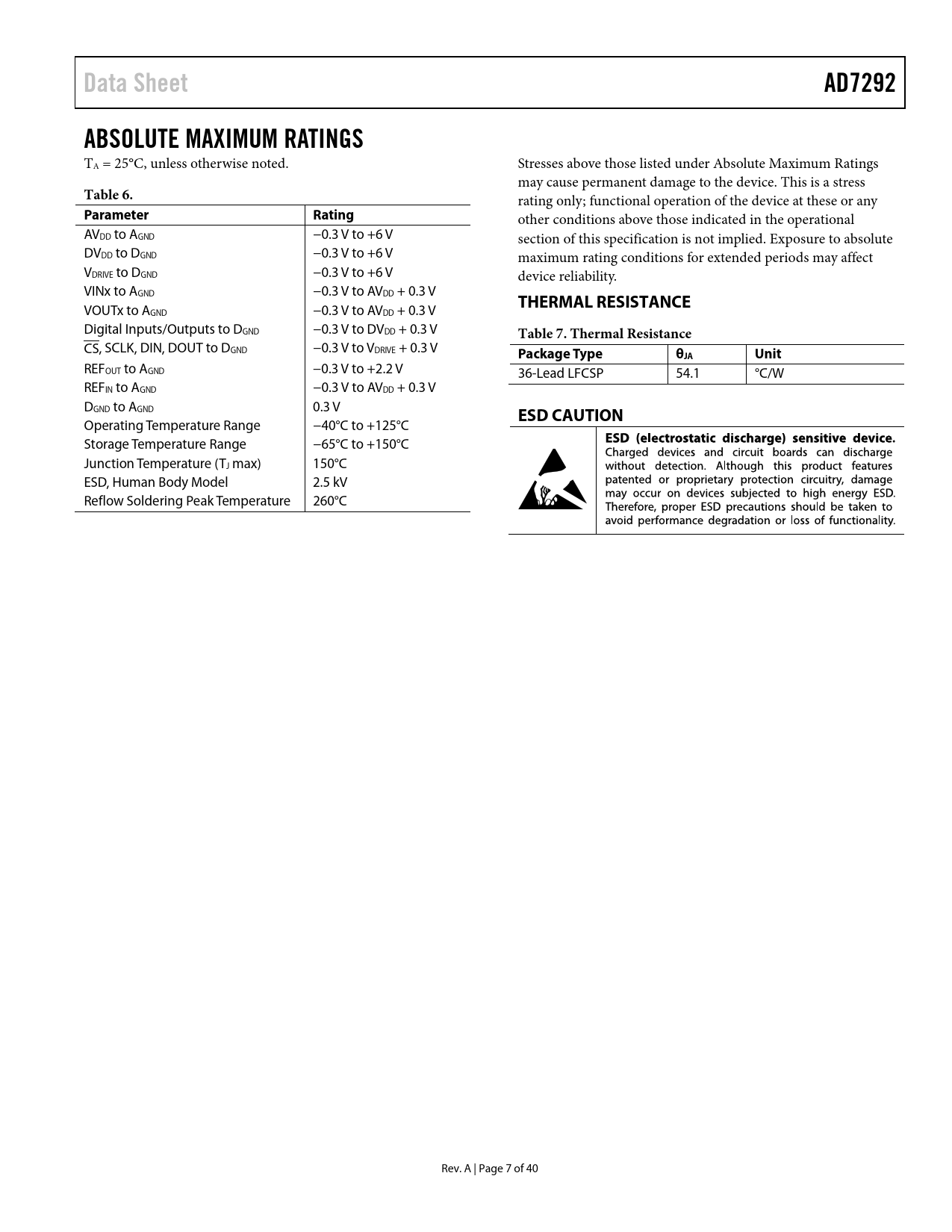 Data Sheet AD7292 ABSOLUTE MAXIMUM RATINGS Table 6 Parameter Rating THERMAL RESISTANCE Table 7 Thermal Resistance Package Type