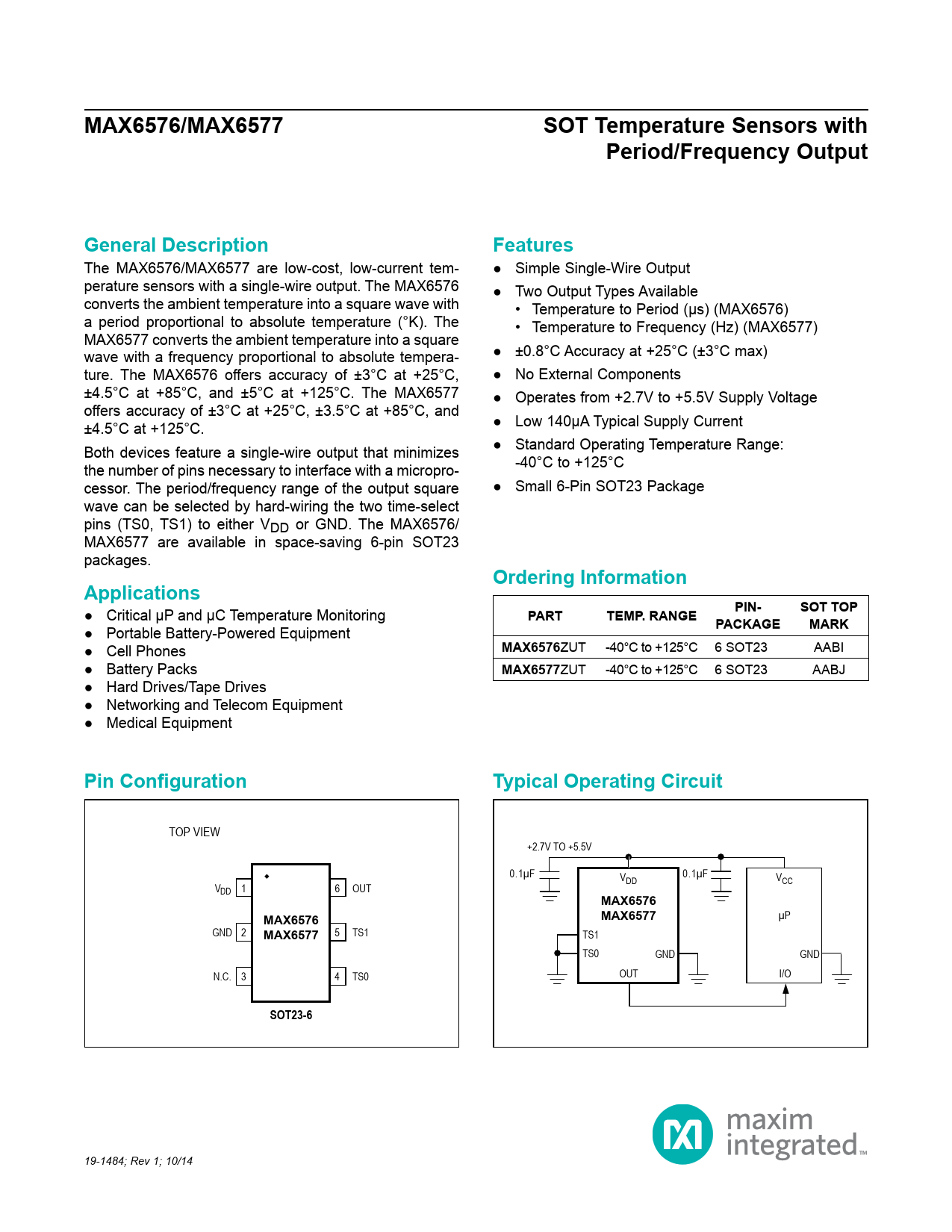 MAX6576/MAX6577. SOT Temperature Sensors with. Period/Frequency Output. General Description. Features. Ordering Information