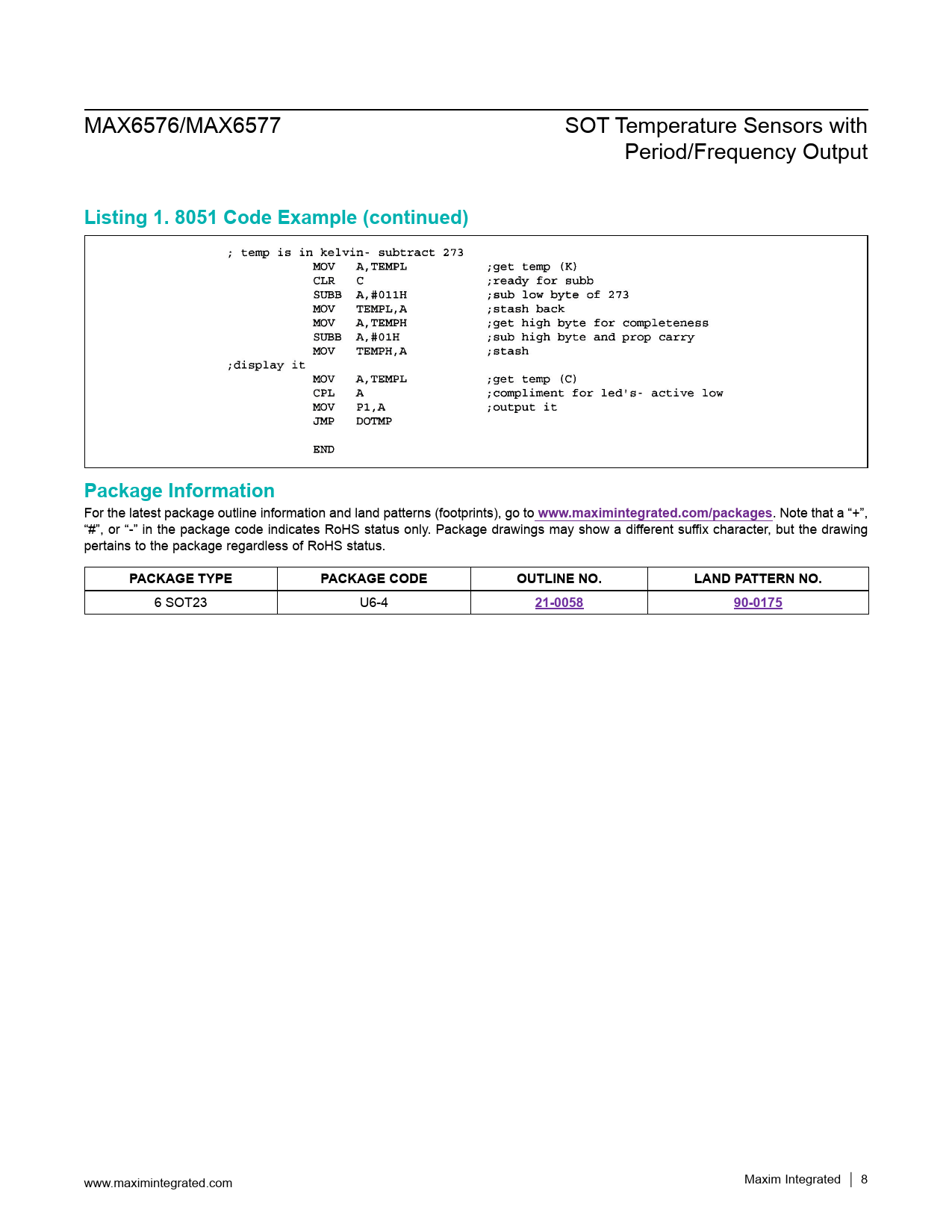 Listing 1. 8051 Code Example (continued). Package Information. www.maximintegrated.com/packages. PACKAGE TYPE. PACKAGE CODE