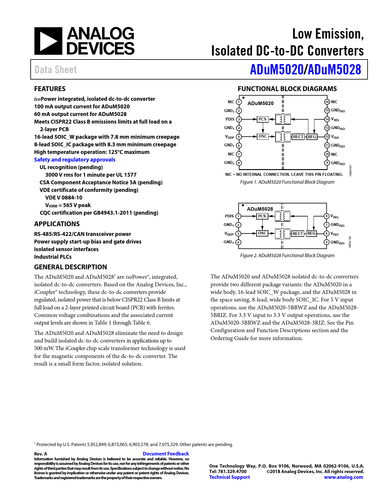 Low Emission,. Isolated DC-to-DC Converters. Data Sheet. ADuM5020/. ADuM5028. FEATURES. FUNCTIONAL BLOCK DIAGRAMS. iso