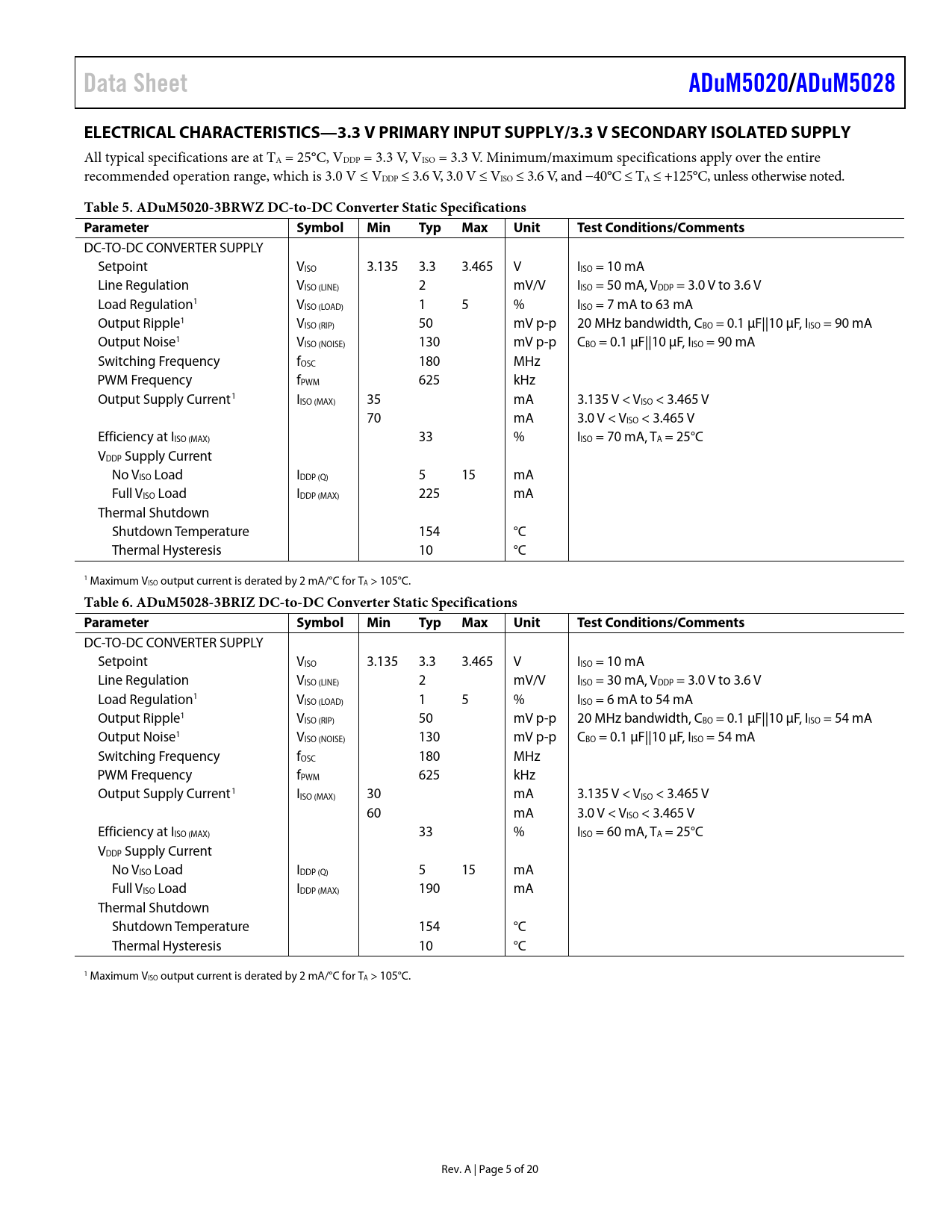 Data SheetADuM5020/ADuM5028ELECTRICAL CHARACTERISTICS—3.3 V PRIMARY INPUT SUPPLY/3.3 V SECONDARY ISOLATED SUPPLY All typical specifications are at TA = 25°C, VDDP = 3.3 V, VISO = 3.3 V. Minimum/maximum specifications apply over the entire recommended operation range, which is 3.0 V ≤ VDDP ≤ 3.6 V, 3.0 V ≤ VISO ≤ 3.6 V, and −40°C ≤ TA ≤ +125°C, unless otherwise noted. Table 5. ADuM5020-3BRWZ DC-to-DC Converter Static Specifications ParameterSymbolMinTypMaxUnitTest Conditions/Comments DC-TO-DC CONVERTER SUPPLY Setpoint VISO 3.135 3.3 3.465 V IISO = 10 mA Line Regulation VISO (LINE) 2 mV/V IISO = 50 mA, VDDP = 3.0 V to 3.6 V Load Regulation1 VISO (LOAD) 1 5 % IISO = 7 mA to 63 mA Output Ripple1 VISO (RIP) 50 mV p-p 20 MHz bandwidth, CBO = 0.1 µF||10 µF, IISO = 90 mA Output Noise1 VISO (NOISE) 130 mV p-p CBO = 0.1 µF||10 µF, IISO = 90 mA Switching Frequency fOSC 180 MHz PWM Frequency fPWM 625 kHz Output Supply Current1 IISO (MAX) 35 mA 3.135 V < VISO < 3.465 V 70 mA 3.0 V < VISO < 3.465 V Efficiency at IISO (MAX) 33 % IISO = 70 mA, TA = 25°C VDDP Supply Current No VISO Load IDDP (Q) 5 15 mA Full VISO Load IDDP (MAX) 225 mA Thermal Shutdown Shutdown Temperature 154 °C Thermal Hysteresis 10 °C 1 Maximum VISO output current is derated by 2 mA/°C for TA > 105°C. Table 6. ADuM5028-3BRIZ DC-to-DC Converter Static Specifications ParameterSymbolMinTypMaxUnitTest Conditions/Comments DC-TO-DC CONVERTER SUPPLY Setpoint VISO 3.135 3.3 3.465 V IISO = 10 mA Line Regulation VISO (LINE) 2 mV/V IISO = 30 mA, VDDP = 3.0 V to 3.6 V Load Regulation1 VISO (LOAD) 1 5 % IISO = 6 mA to 54 mA Output Ripple1 VISO (RIP) 50 mV p-p 20 MHz bandwidth, CBO = 0.1 µF||10 µF, IISO = 54 mA Output Noise1 VISO (NOISE) 130 mV p-p CBO = 0.1 µF||10 µF, IISO = 54 mA Switching Frequency fOSC 180 MHz PWM Frequency fPWM 625 kHz Output Supply Current1 IISO (MAX) 30 mA 3.135 V < VISO < 3.465 V 60 mA 3.0 V < VISO < 3.465 V Efficiency at IISO (MAX) 33 % IISO = 60 mA, TA = 25°C VDDP Supply Current No VISO Load IDDP (Q) 5 15 mA Full VISO Load IDDP (MAX) 190 mA Thermal Shutdown Shutdown Temperature 154 °C Thermal Hysteresis 10 °C 1 Maximum VISO output current is derated by 2 mA/°C for TA > 105°C. Rev. A | Page 5 of 20 Document Outline Features Applications Functional Block Diagrams General Description Revision History Specifications Electrical Characteristics—5 V Primary Input Supply/5 V Secondary Isolated Supply Electrical Characteristics—5 V Primary Input Supply/3.3 V Secondary Isolated Supply Electrical Characteristics—3.3 V Primary Input Supply/3.3 V Secondary Isolated Supply Regulatory Approvals Insulation and Safety Related Specifications Package Characteristics DIN V VDE V 0884-10 (VDE V 0884-10) Insulation Characteristics Recommended Operating Conditions Absolute Maximum Ratings ESD Caution Pin Configuration and Function Descriptions Typical Performance Characteristics Theory of Operation Applications Information PCB Layout Thermal Analysis EMI Considerations Insulation Lifetime Surface Tracking Insulation Wear Out Calculation and Use of Parameters Example Outline Dimensions Ordering Guide