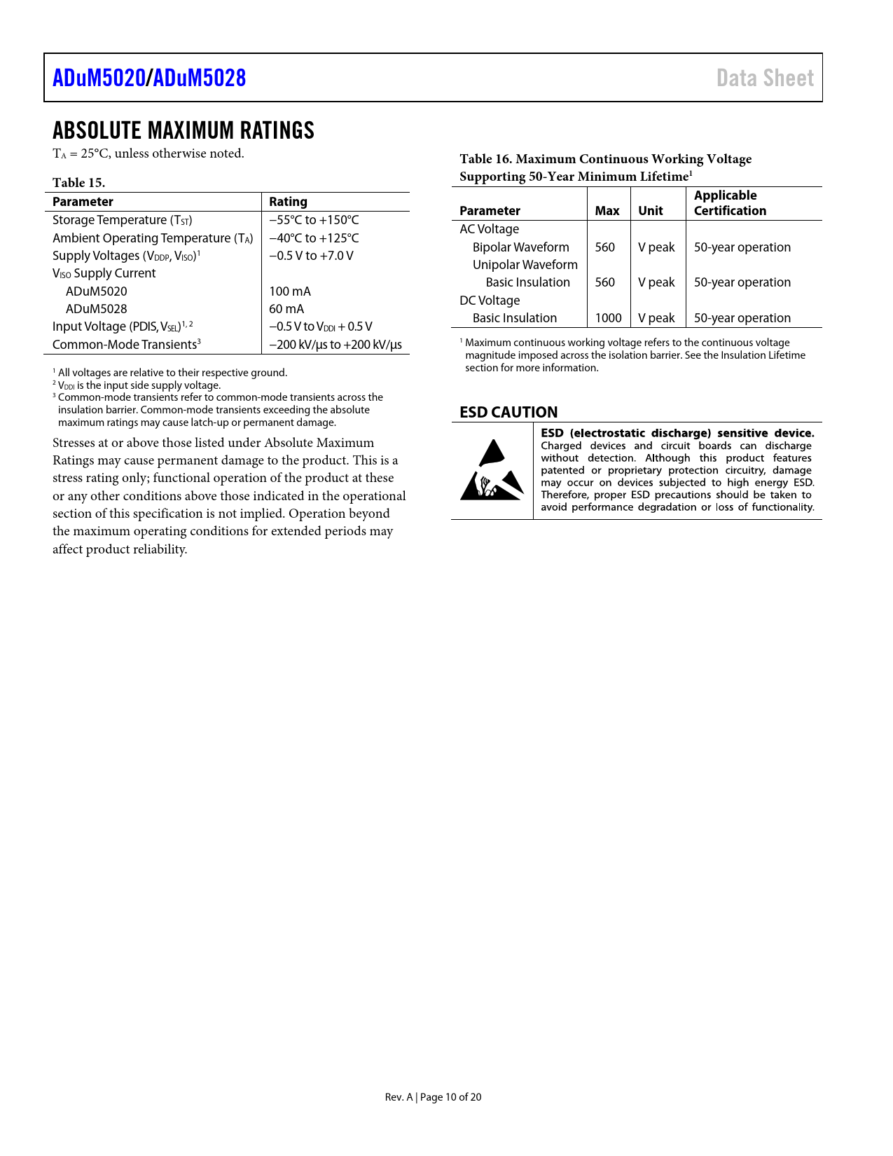 link to page 17 ADuM5020/ADuM5028Data SheetABSOLUTE MAXIMUM RATINGS TA = 25°C, unless otherwise noted. Table 16. Maximum Continuous Working VoltageTable 15.Supporting 50-Year Minimum Lifetime1ParameterRatingApplicableParameterMaxUnitCertification Storage Temperature (TST) −55°C to +150°C AC Voltage Ambient Operating Temperature (TA) −40°C to +125°C Bipolar Waveform 560 V peak Supply Voltages (V 50-year operation DDP, VISO)1 −0.5 V to +7.0 V Unipolar Waveform VISO Supply Current Basic Insulation 560 V peak ADuM5020 100 mA 50-year operation DC Voltage ADuM5028 60 mA Basic Insulation 1000 V peak Input Voltage (PDIS, V 50-year operation SEL)1, 2 −0.5 V to VDDI + 0.5 V Common-Mode Transients3 −200 kV/µs to +200 kV/µs 1 Maximum continuous working voltage refers to the continuous voltage magnitude imposed across the isolation barrier. See the Insulation Lifetime 1 All voltages are relative to their respective ground. section for more information. 2 VDDI is the input side supply voltage. 3 Common-mode transients refer to common-mode transients across the insulation barrier. Common-mode transients exceeding the absolute ESD CAUTION maximum ratings may cause latch-up or permanent damage. Stresses at or above those listed under Absolute Maximum Ratings may cause permanent damage to the product. This is a stress rating only; functional operation of the product at these or any other conditions above those indicated in the operational section of this specification is not implied. Operation beyond the maximum operating conditions for extended periods may affect product reliability. Rev. A | Page 10 of 20 Document Outline Features Applications Functional Block Diagrams General Description Revision History Specifications Electrical Characteristics—5 V Primary Input Supply/5 V Secondary Isolated Supply Electrical Characteristics—5 V Primary Input Supply/3.3 V Secondary Isolated Supply Electrical Characteristics—3.3 V Primary Input Supply/3.3 V Secondary Isolated Supply Regulatory Approvals Insulation and Safety Related Specifications Package Characteristics DIN V VDE V 0884-10 (VDE V 0884-10) Insulation Characteristics Recommended Operating Conditions Absolute Maximum Ratings ESD Caution Pin Configuration and Function Descriptions Typical Performance Characteristics Theory of Operation Applications Information PCB Layout Thermal Analysis EMI Considerations Insulation Lifetime Surface Tracking Insulation Wear Out Calculation and Use of Parameters Example Outline Dimensions Ordering Guide