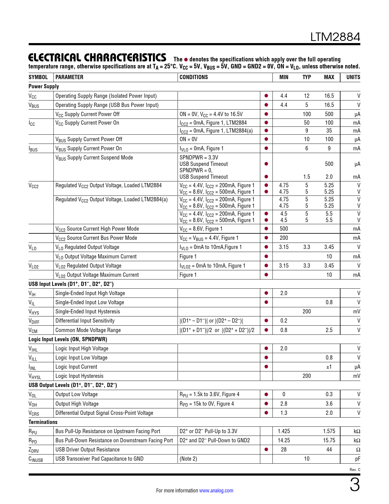 VCC Operating Supply Range (Isolated Power Input) l 4.4 12 16.5 V VBUS Operating Supply Range (USB Bus Power Input) l 4.4 5 16.5 V VCC Supply Current Power Off ON = 0V, VCC = 4.4V to 16.5V l 100 500 µA ICC VCC Supply Current Power On ICC2 = 0mA, Figure 1, LTM2884 l 50 100 mA ICC2 = 0mA, Figure 1, LTM2884(a) l 9 35 mA VBUS Supply Current Power Off ON = 0V l 10 100 µA IBUS VBUS Supply Current Power On IVLO = 0mA, Figure 1 l 6 9 mA VBUS Supply Current Suspend Mode SPNDPWR = 3.3V USB Suspend Timeout l 500 µA SPNDPWR = 0, USB Suspend Timeout l 1.5 2.0 mA VCC2 Regulated VCC2 Output Voltage, Loaded LTM2884 VCC = 4.4V, ICC2 = 200mA, Figure 1 l 4.75 5 5.25 V VCC = 8.6V, ICC2 = 500mA, Figure 1 l 4.75 5 5.25 V Regulated VCC2 Output Voltage, Loaded LTM2884(a) VCC = 4.4V, ICC2 = 200mA, Figure 1 4.75 5 5.25 V VCC = 8.6V, ICC2 = 500mA, Figure 1 4.75 5 5.25 V VCC = 4.4V, ICC2 = 200mA, Figure 1 l 4.5 5 5.5 V VCC = 8.6V, ICC2 = 500mA, Figure 1 l 4.5 5 5.5 V VCC2 Source Current High Power Mode VCC = 8.6V, Figure 1 l 500 mA VCC2 Source Current Bus Power Mode VCC = VBUS = 4.4V, Figure 1 l 200 mA VLO VLO Regulated Output Voltage IVLO = 0mA to 10mA,Figure 1 l 3.15 3.3 3.45 V VLO Output Voltage Maximum Current Figure 1 l 10 mA VLO2 VLO2 Regulated Output Voltage IVLO2 = 0mA to 10mA, Figure 1 l 3.15 3.3 3.45 V VLO2 Output Voltage Maximum Current Figure 1 l 10 mA