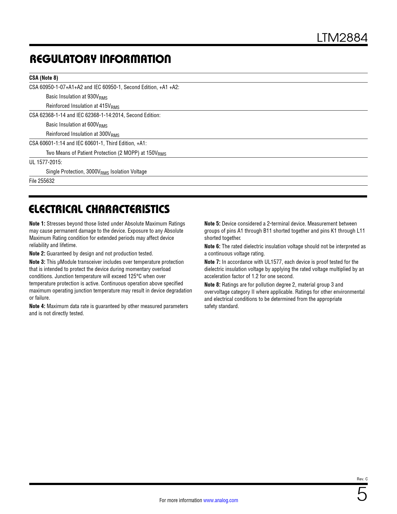 REGULATORY INFORMATION. CSA (Note 8). ELECTRICAL CHARACTERISTICS. Note 1:. Note 5:. Note 6:. Note 2:. Note 3:. Note 7:. Note 8:. Note 4: