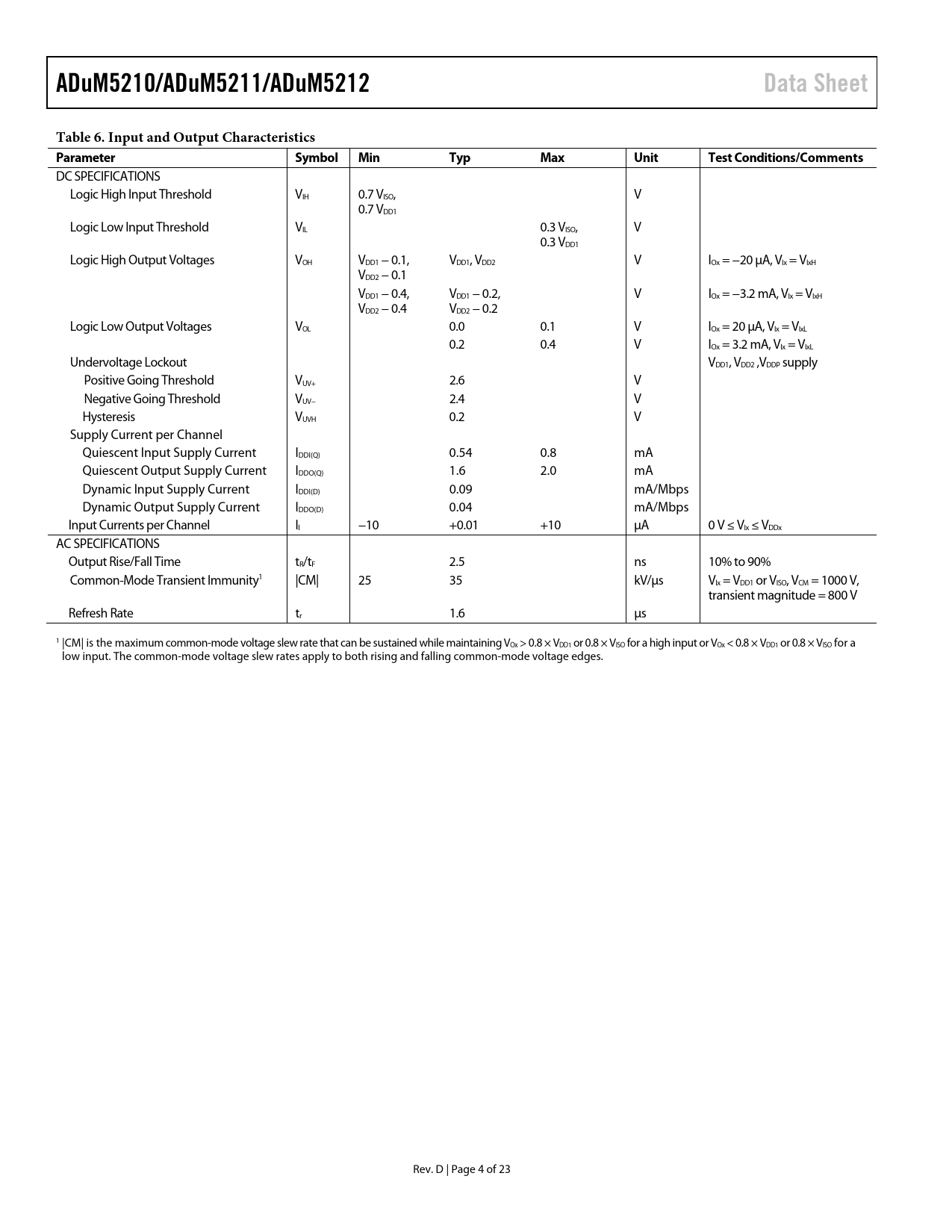 ADuM5210/ADuM5211/ADuM5212. Data Sheet. Table 6. Input and Output Characteristics Parameter Symbol. Min. Typ. Max. Unit. Test