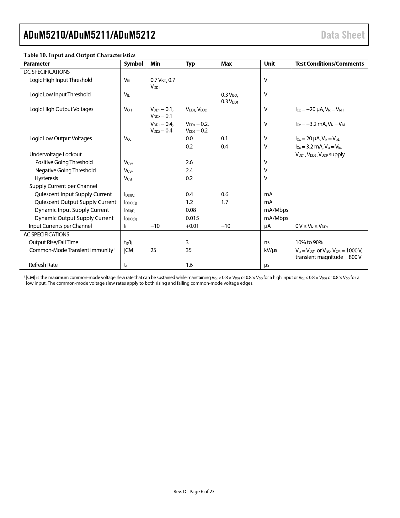 ADuM5210/ADuM5211/ADuM5212 Data Sheet Table 10 Input and Output Characteristics Parameter Symbol Min Typ Max Unit Test
