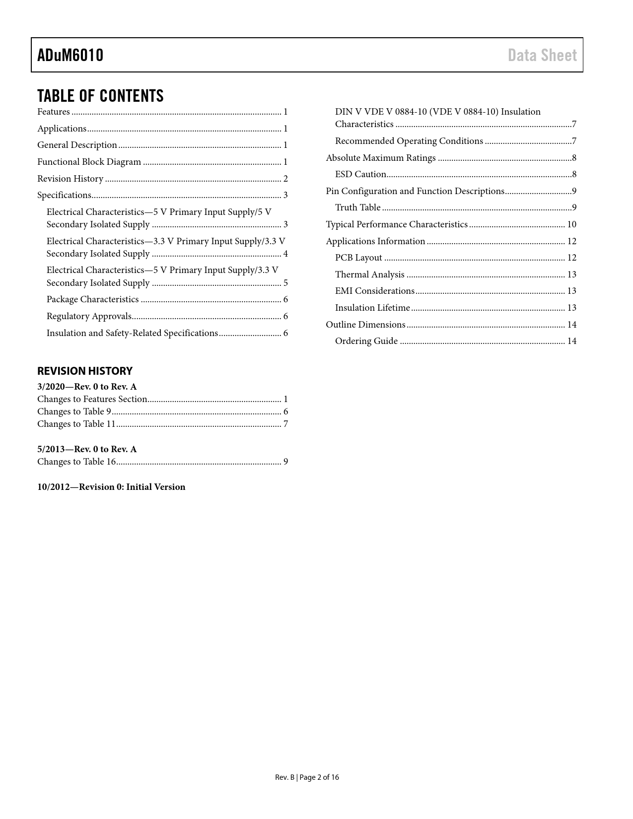 Páginas / Página16 / 2 — ADuM6010. Data Sheet. TABLE OF CONTENTS. REVISION HISTORY 3/2020—Rev. 0 …
