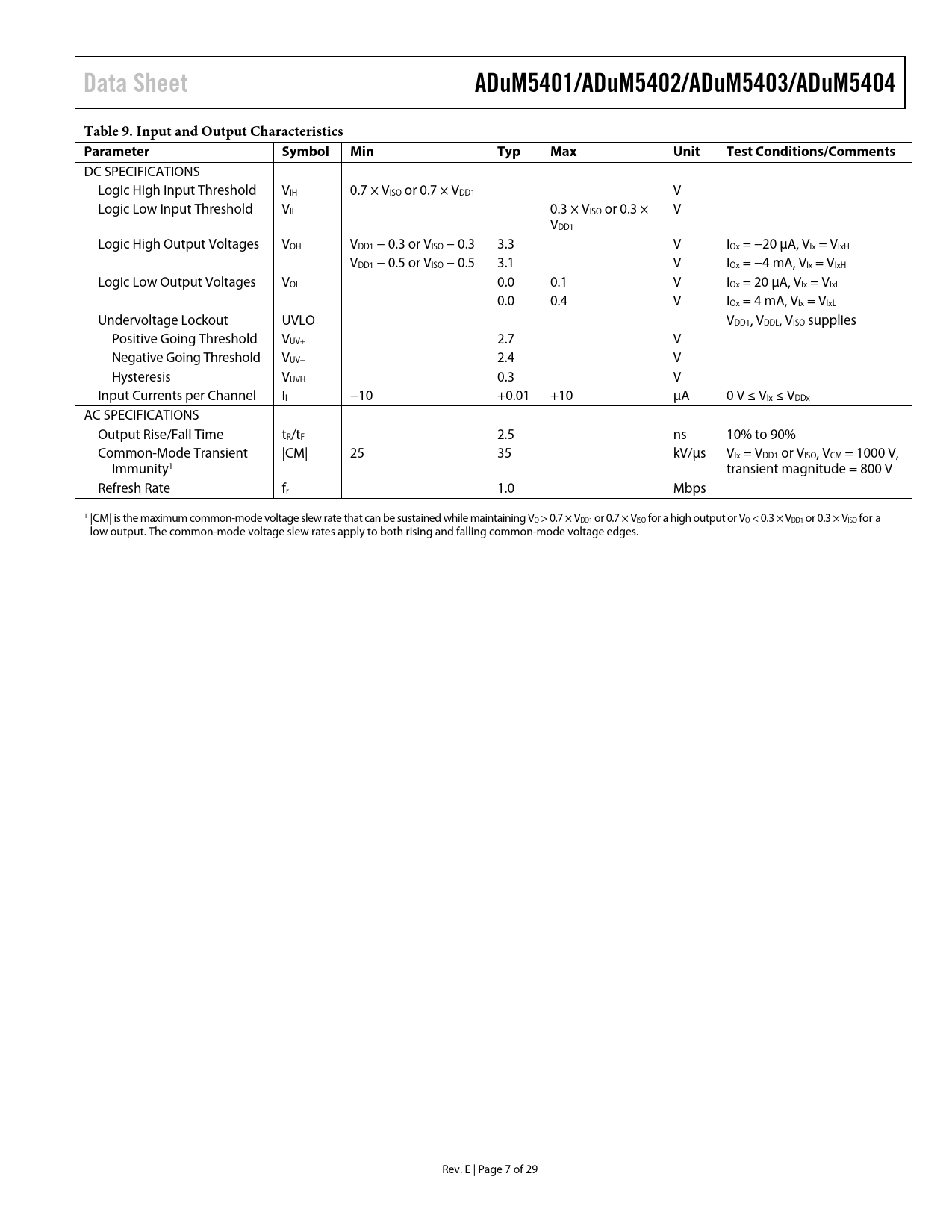 Data Sheet. ADuM5401/ADuM5402/ADuM5403/ADuM5404. Table 9. Input and Output Characteristics Parameter Symbol. Min. Typ. Max. Unit