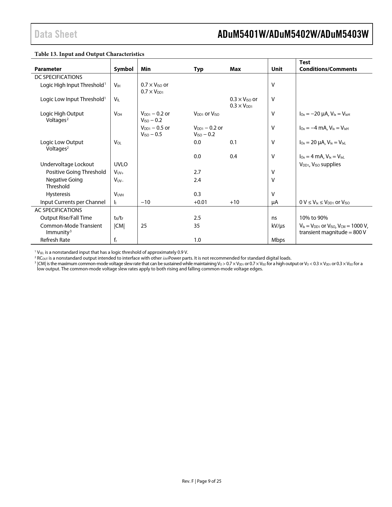 Data Sheet ADuM5401W/ADuM5402W/ADuM5403W Table 13 Input and Output Characteristics Test Parameter Symbol Min Typ Max Unit