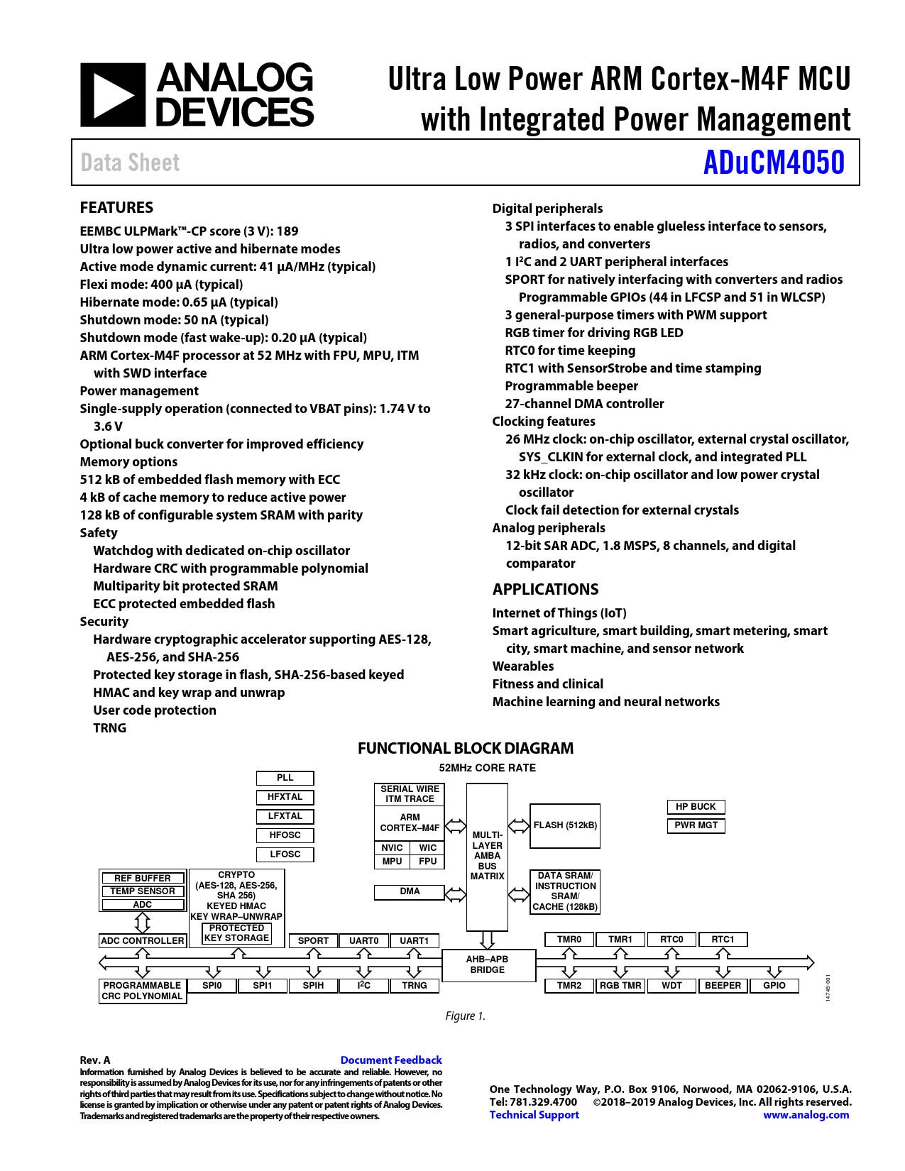 Ultra Low Power ARM Cortex-M4F MCU. with Integrated Power Management. Data Sheet. ADuCM4050. FEATURES. Digital peripherals