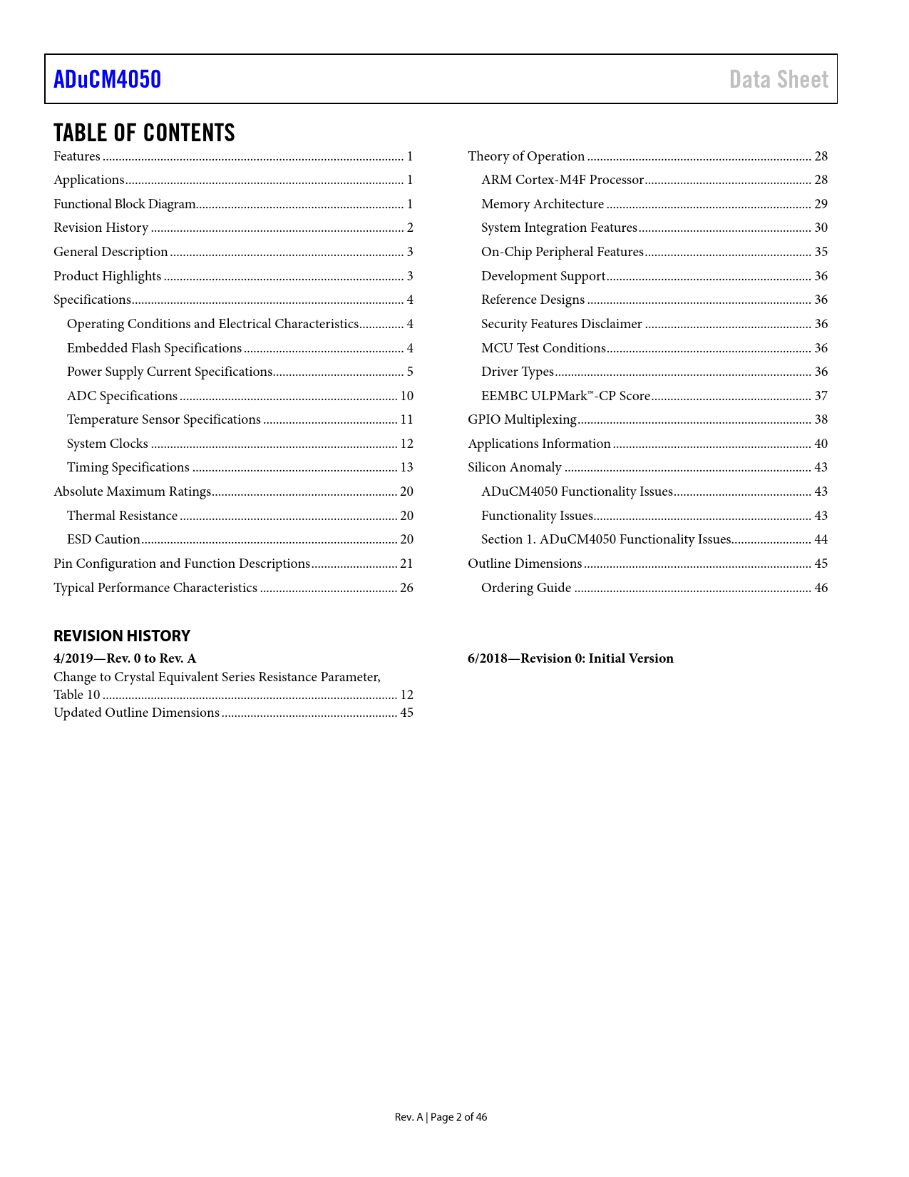 link to page 1 link to page 1 link to page 1 link to page 2 link to page 3 link to page 3 link to page 4 link to page 4 link to page 4 link to page 5 link to page 10 link to page 11 link to page 12 link to page 13 link to page 20 link to page 20 link to page 20 link to page 21 link to page 26 link to page 28 link to page 28 link to page 29 link to page 30 link to page 35 link to page 36 link to page 36 link to page 36 link to page 36 link to page 36 link to page 37 link to page 38 link to page 40 link to page 43 link to page 43 link to page 43 link to page 44 link to page 45 link to page 46 ADuCM4050Data SheetTABLE OF CONTENTS Features .. 1 Theory of Operation .. 28 Applications ... 1 ARM Cortex-M4F Processor .. 28 Functional Block Diagram... 1 Memory Architecture .. 29 Revision History ... 2 System Integration Features .. 30 General Description ... 3 On-Chip Peripheral Features .. 35 Product Highlights ... 3 Development Support .. 36 Specifications ... 4 Reference Designs .. 36 Operating Conditions and Electrical Characteristics .. 4 Security Features Disclaimer .. 36 Embedded Flash Specifications .. 4 MCU Test Conditions .. 36 Power Supply Current Specifications ... 5 Driver Types .. 36 ADC Specifications .. 10 EEMBC ULPMark™-CP Score .. 37 Temperature Sensor Specifications .. 11 GPIO Multiplexing ... 38 System Clocks ... 12 Applications Information .. 40 Timing Specifications .. 13 Silicon Anomaly ... 43 Absolute Maximum Ratings .. 20 ADuCM4050 Functionality Issues ... 43 Thermal Resistance .. 20 Functionality Issues .. 43 ESD Caution .. 20 Section 1. ADuCM4050 Functionality Issues... 44 Pin Configuration and Function Descriptions ... 21 Outline Dimensions ... 45 Typical Performance Characteristics ... 26 Ordering Guide .. 46 REVISION HISTORY4/2019—Rev. 0 to Rev. A6/2018—Revision 0: Initial Version Change to Crystal Equivalent Series Resistance Parameter, Table 10 .. 12 Updated Outline Dimensions ... 45 Rev. A | Page 2 of 46 Document Outline FEATURES APPLICATIONS FUNCTIONAL BLOCK DIAGRAM REVISION HISTORY GENERAL DESCRIPTION PRODUCT HIGHLIGHTS SPECIFICATIONS OPERATING CONDITIONS AND ELECTRICAL CHARACTERISTICS EMBEDDED FLASH SPECIFICATIONS POWER SUPPLY CURRENT SPECIFICATIONS Active Mode Flexi Mode Deep Sleep Modes—VBAT = 1.8 V Deep Sleep Modes—VBAT = 3.0 V Deep Sleep Modes—VBAT = 3.6 V ADC SPECIFICATIONS TEMPERATURE SENSOR SPECIFICATIONS SYSTEM CLOCKS External Crystal Oscillator Specifications On-Chip Resistor-Capacitor (RC) Oscillator Specifications System Clocks and Phase-Locked Loop (PLL) Specifications TIMING SPECIFICATIONS Reset Timing Serial Ports Timing SPI Timing I2C Specifications General-Purpose Port Timing RTC1 (FLEX_RTC) Specifications Timer Pulse-Width Modulation (PWM) Output Cycle Timing ABSOLUTE MAXIMUM RATINGS THERMAL RESISTANCE ESD CAUTION PIN CONFIGURATION AND FUNCTION DESCRIPTIONS TYPICAL PERFORMANCE CHARACTERISTICS THEORY OF OPERATION ARM CORTEX-M4F PROCESSOR ARM Cortex-M4F Subsystem Code Region SRAM Region System Region MEMORY ARCHITECTURE SRAM Region MMRs (Peripheral Control and Status) Flash Memory Cache Controller SYSTEM INTEGRATION FEATURES Reset Booting Power Management and Modes Active Mode Flexi Mode Hibernate Mode Shutdown Mode Shutdown Mode—Fast Wake-Up Power Management and Control Security Features Cryptographic Accelerator True Random Number Generator (TRNG) Reliability and Robustness Features ECC Enabled Flash Memory Multiparity Bit Protected SRAM Software Watchdog CRC Accelerator Programmable GPIOs Timers General-Purpose Timers Watchdog Timer (WDT) RGB Timer ADC Subsystem Clocking Clock Fail Detection Real-Time Clock (RTC) Beeper Driver Debug Capability ON-CHIP PERIPHERAL FEATURES Serial Ports (SPORT) SPI Ports UART Ports I2C DEVELOPMENT SUPPORT Documentation Hardware Software REFERENCE DESIGNS SECURITY FEATURES DISCLAIMER MCU TEST CONDITIONS DRIVER TYPES EEMBC ULPMARK™-CP SCORE GPIO MULTIPLEXING APPLICATIONS INFORMATION SILICON ANOMALY ADuCM4050 FUNCTIONALITY ISSUES FUNCTIONALITY ISSUES SECTION 1. ADuCM4050 FUNCTIONALITY ISSUES OUTLINE DIMENSIONS ORDERING GUIDE