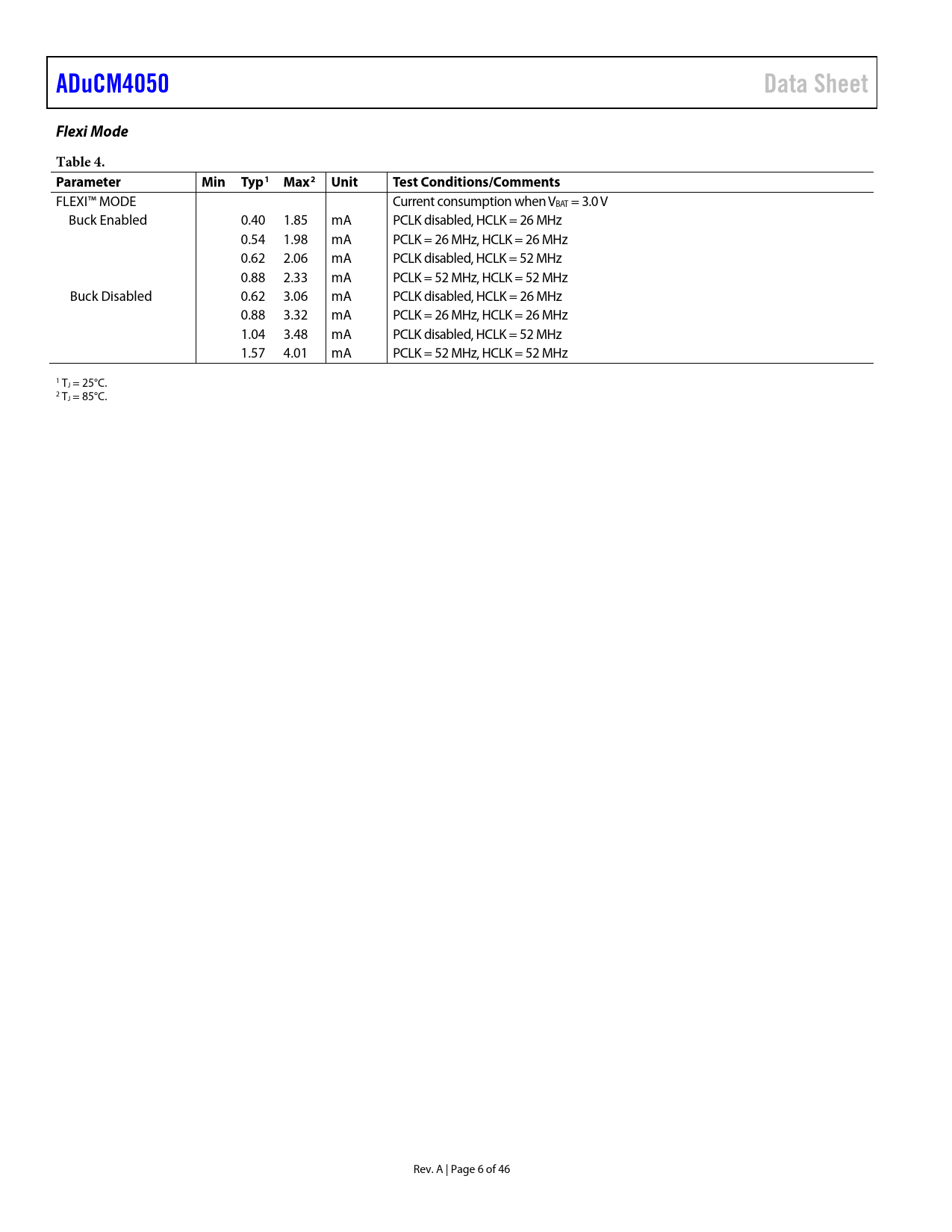 ADuCM4050. Data Sheet. Flexi Mode. Table 4. Parameter. Min. Typ1. Max2. Unit. Test Conditions/Comments