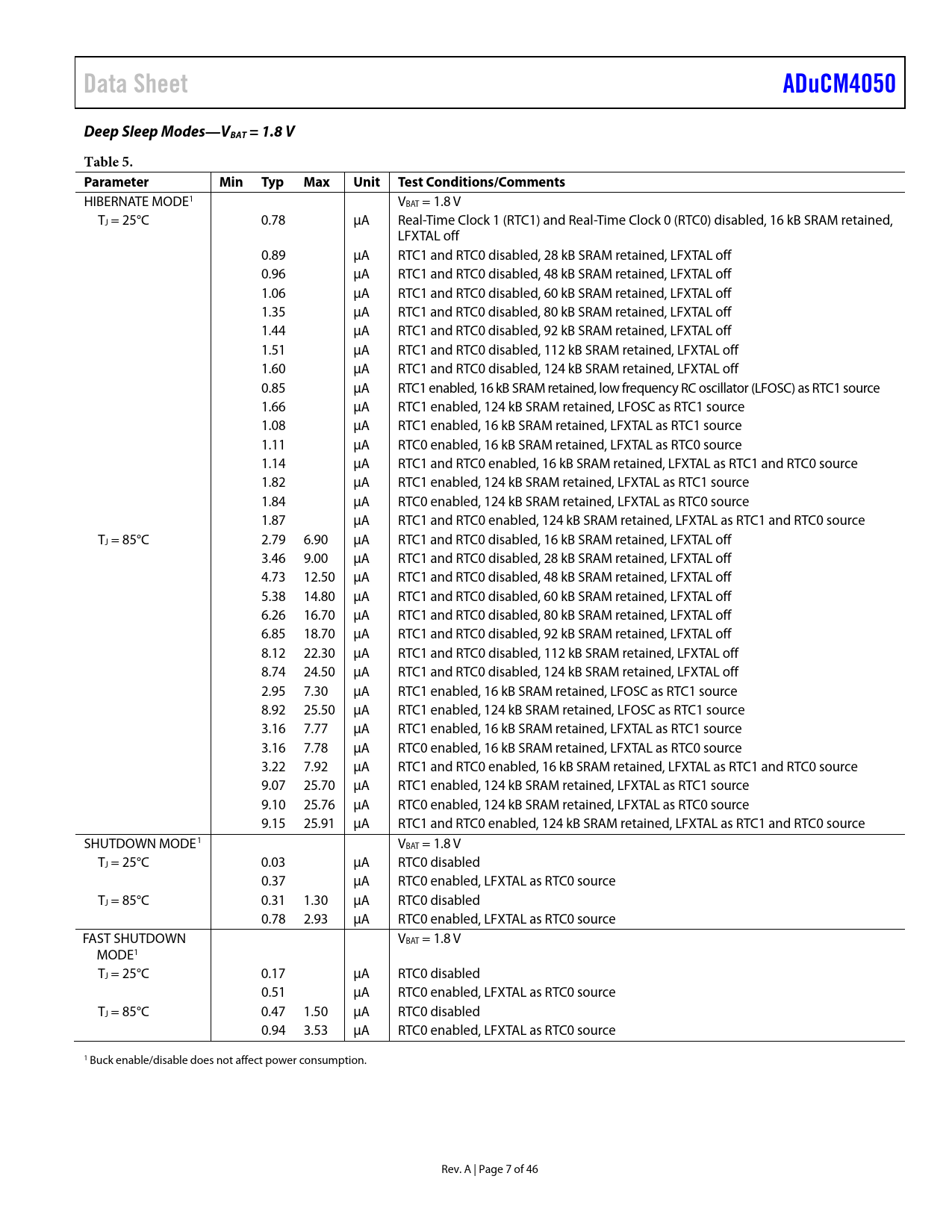 Data Sheet. ADuCM4050. Deep Sleep Modes—VBAT = 1.8 V. Table 5. Parameter. Min Typ. Max. Unit Test Conditions/Comments