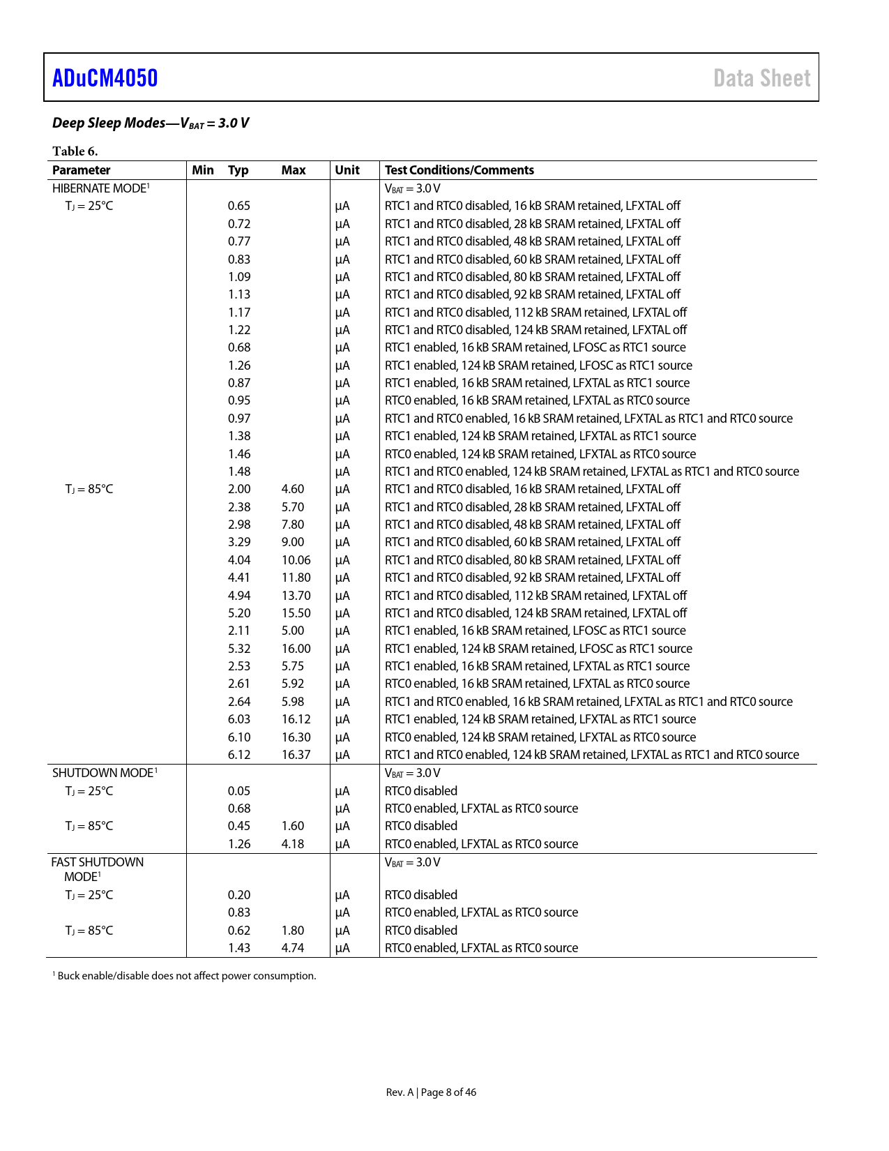 ADuCM4050. Data Sheet. Deep Sleep Modes—VBAT = 3.0 V. Table 6. Parameter. Min Typ. Max. Unit. Test Conditions/Comments