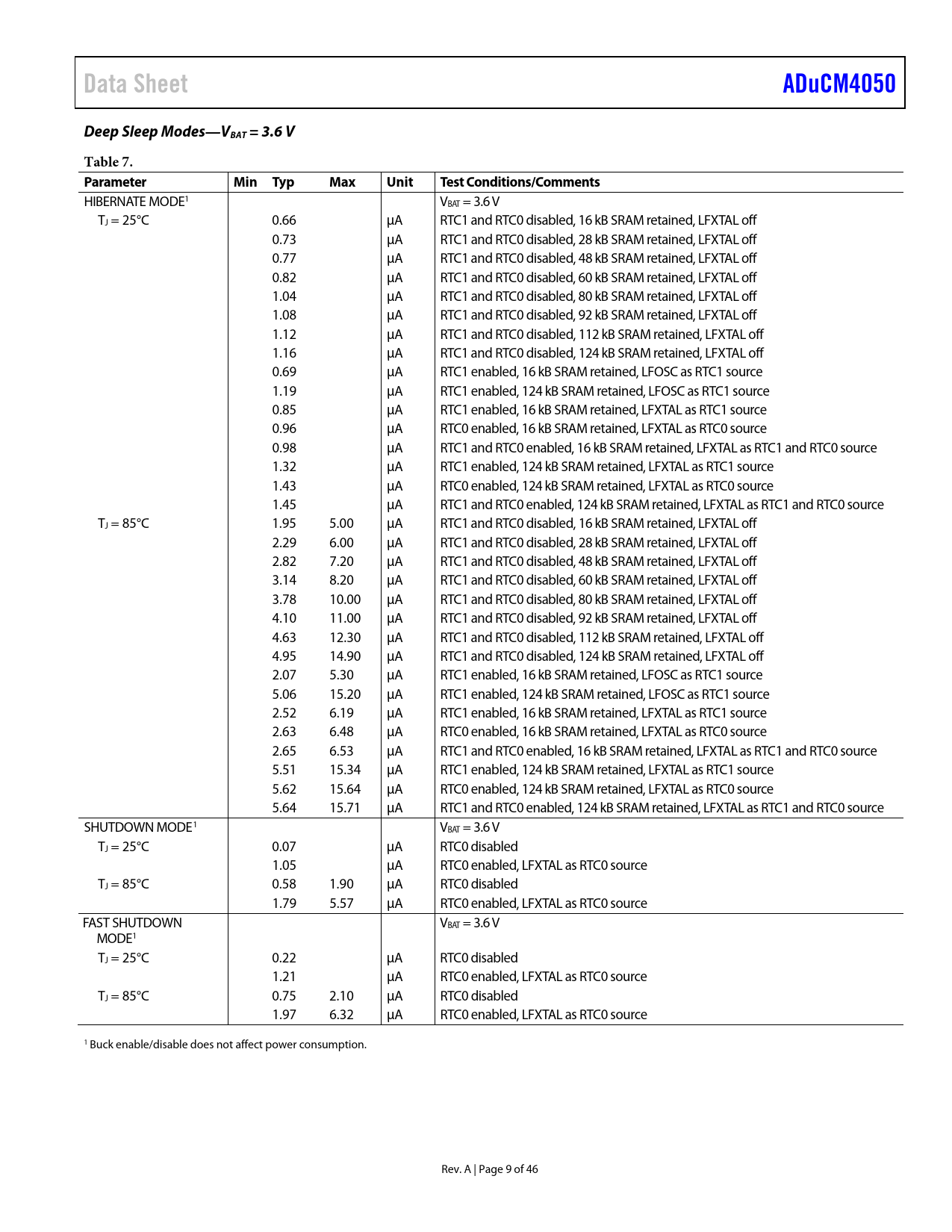 Data Sheet. ADuCM4050. Deep Sleep Modes—VBAT = 3.6 V. Table 7. Parameter. Min Typ. Max. Unit. Test Conditions/Comments