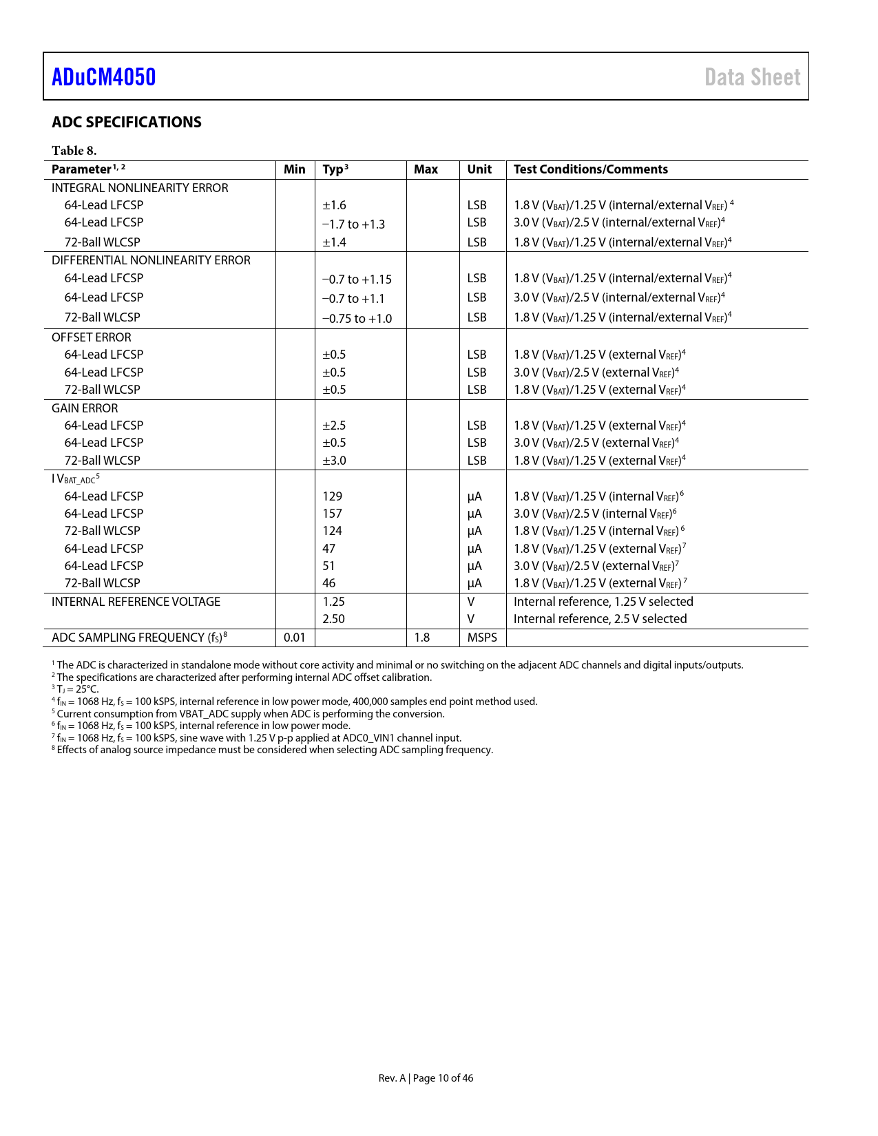 ADuCM4050. Data Sheet. ADC SPECIFICATIONS. Table 8. Parameter1, 2. Min Typ3. Max. Unit. Test Conditions/Comments