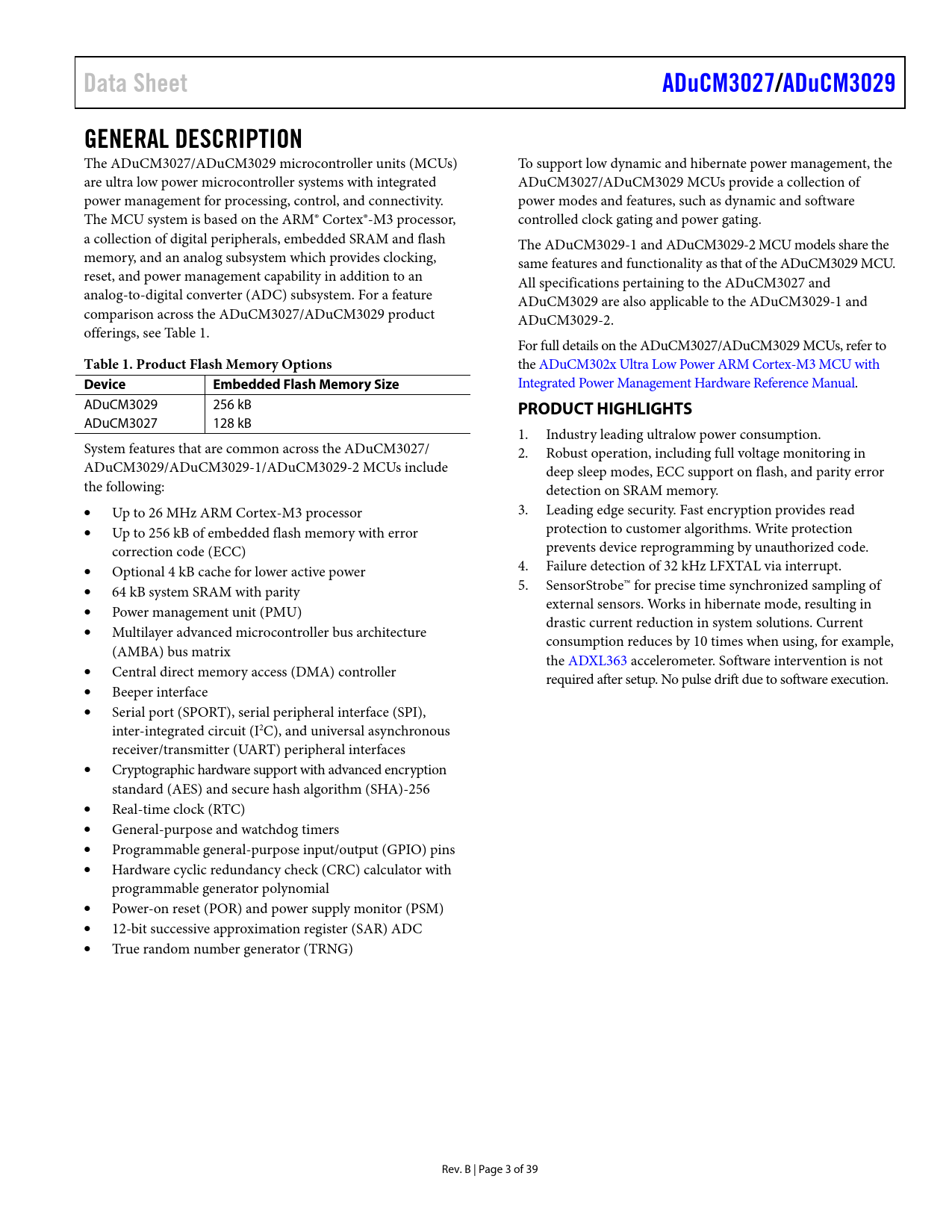link to page 3 Data SheetADuCM3027/ADuCM3029GENERAL DESCRIPTION The ADuCM3027/ADuCM3029 microcontroller units (MCUs) To support low dynamic and hibernate power management, the are ultra low power microcontroller systems with integrated ADuCM3027/ADuCM3029 MCUs provide a collection of power management for processing, control, and connectivity. power modes and features, such as dynamic and software The MCU system is based on the ARM® Cortex®-M3 processor, controlled clock gating and power gating. a collection of digital peripherals, embedded SRAM and flash The ADuCM3029-1 and ADuCM3029-2 MCU models share the memory, and an analog subsystem which provides clocking, same features and functionality as that of the ADuCM3029 MCU. reset, and power management capability in addition to an All specifications pertaining to the ADuCM3027 and analog-to-digital converter (ADC) subsystem. For a feature ADuCM3029 are also applicable to the ADuCM3029-1 and comparison across the ADuCM3027/ADuCM3029 product ADuCM3029-2. offerings, see Table 1. For full details on the ADuCM3027/ADuCM3029 MCUs, refer to Table 1. Product Flash Memory Options the ADuCM302x Ultra Low Power ARM Cortex-M3 MCU with DeviceEmbedded Flash Memory Size Integrated Power Management Hardware Reference Manual. ADuCM3029 256 kB PRODUCT HIGHLIGHTS ADuCM3027 128 kB 1. Industry leading ultralow power consumption. System features that are common across the ADuCM3027/ 2. Robust operation, including full voltage monitoring in ADuCM3029/ADuCM3029-1/ADuCM3029-2 MCUs include deep sleep modes, ECC support on flash, and parity error the following: detection on SRAM memory. • Up to 26 MHz ARM Cortex-M3 processor 3. Leading edge security. Fast encryption provides read • Up to 256 kB of embedded flash memory with error protection to customer algorithms. Write protection correction code (ECC) prevents device reprogramming by unauthorized code. • Optional 4 kB cache for lower active power 4. Failure detection of 32 kHz LFXTAL via interrupt. • 64 kB system SRAM with parity 5. SensorStrobe™ for precise time synchronized sampling of • Power management unit (PMU) external sensors. Works in hibernate mode, resulting in • drastic current reduction in system solutions. Current Multilayer advanced microcontroller bus architecture consumption reduces by 10 times when using, for example, (AMBA) bus matrix the ADXL363 accelerometer. Software intervention is not • Central direct memory access (DMA) controller required after setup. No pulse drift due to software execution. • Beeper interface • Serial port (SPORT), serial peripheral interface (SPI), inter-integrated circuit (I2C), and universal asynchronous receiver/transmitter (UART) peripheral interfaces • Cryptographic hardware support with advanced encryption standard (AES) and secure hash algorithm (SHA)-256 • Real-time clock (RTC) • General-purpose and watchdog timers • Programmable general-purpose input/output (GPIO) pins • Hardware cyclic redundancy check (CRC) calculator with programmable generator polynomial • Power-on reset (POR) and power supply monitor (PSM) • 12-bit successive approximation register (SAR) ADC • True random number generator (TRNG) Rev. B | Page 3 of 39 Document Outline Features Applications Functional Block Diagram Revision History General Description Product Highlights Specifications Operating Conditions and Electrical Characteristics Embedded Flash Specifications Power Supply Current Specifications Active Mode Flexi Mode Deep Sleep Modes—VBAT = 3.0 V ADC Specifications System Clocks External Crystal Oscillator Specifications On-Chip RC Oscillator Specifications System Clocks and PLL Specifications Timing Specifications Reset Timing Serial Ports Timing SPI Timing I2C Specifications General-Purpose Port Timing RTC1 (FLEX_RTC) Specifications Timer Pulse-Width Modulation (PWM) Output Cycle Timing Absolute Maximum Ratings Thermal Resistance ESD Caution Pin Configuration and Function Descriptions Typical Performance Characteristics Theory of Operation ARM Cortex-M3 Processor ARM Cortex-M3 Memory Subsystem Code Region SRAM Region System Region Memory Architecture SRAM Region MMRs (Peripheral Control and Status) Flash Memory Cache Controller System and Integration Features Reset Booting Power Management Power Modes Active Mode Flexi Mode Hibernate Mode Shutdown Mode Security Features Cryptographic Accelerator True Random Number Generator (TRNG) Reliability and Robustness Features ECC Enabled Flash Memory Multiparity Bit Protected SRAM Software Watchdog Cyclic Redundancy Check (CRC) Accelerator Programmable GPIOs Timers General-Purpose Timers Watchdog Timer (WDT) Analog-to-Digital Converter (ADC) Subsystem Clocking Beeper Driver Debug Capability On-Chip Peripheral Features Serial Ports (SPORT) SPI Ports UART Port I2C Development Support Documentation Hardware Software Additional Information Reference Designs MCU Test Conditions Driver Types EEMBC ULPMark™-CP Score GPIO Multiplexing Applications Information About ADuCM3027/ADuCM3029 Silicon Anomalies Functionality Issues Outline Dimensions Ordering Guide