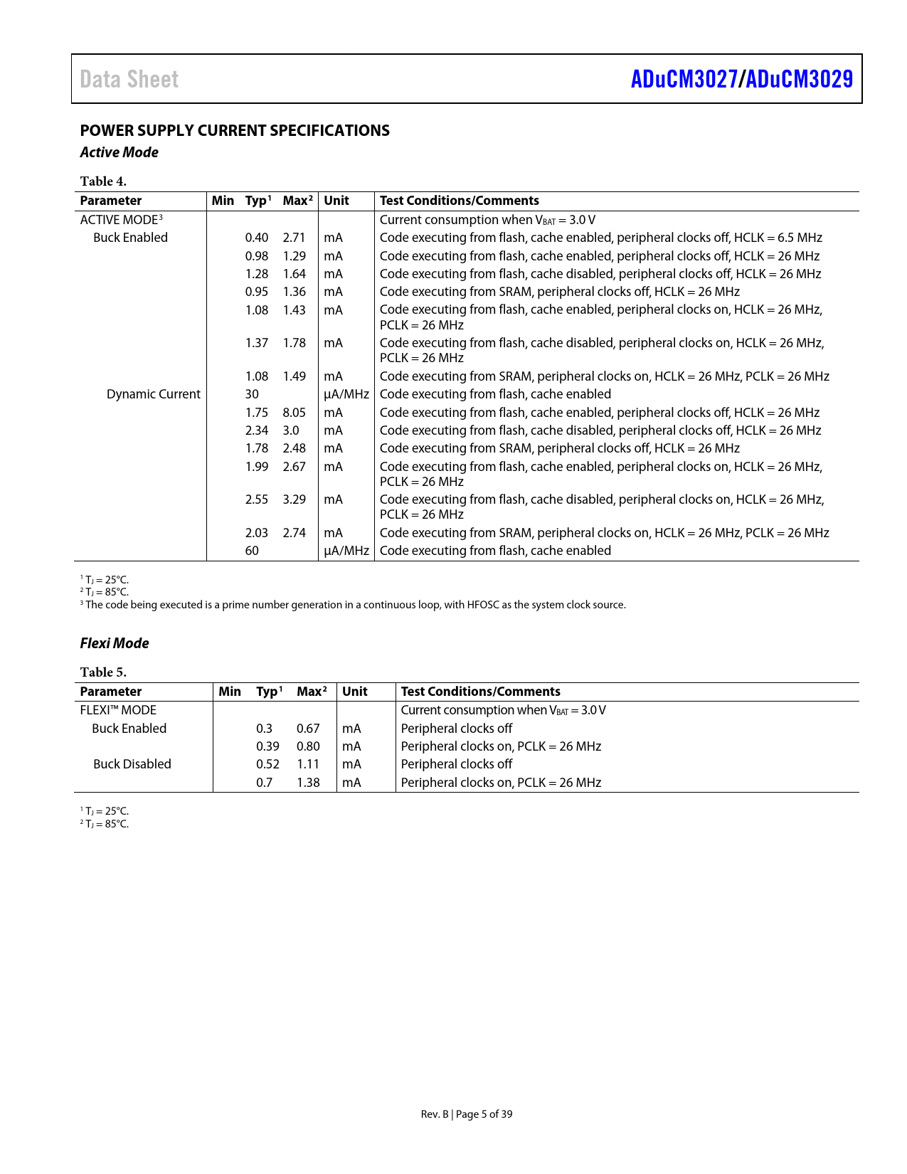 Data Sheet ADuCM3027/ ADuCM3029 POWER SUPPLY CURRENT SPECIFICATIONS Active Mode Table 4. Parameter Min Typ1 Max2 Unit Test Conditions/Comments