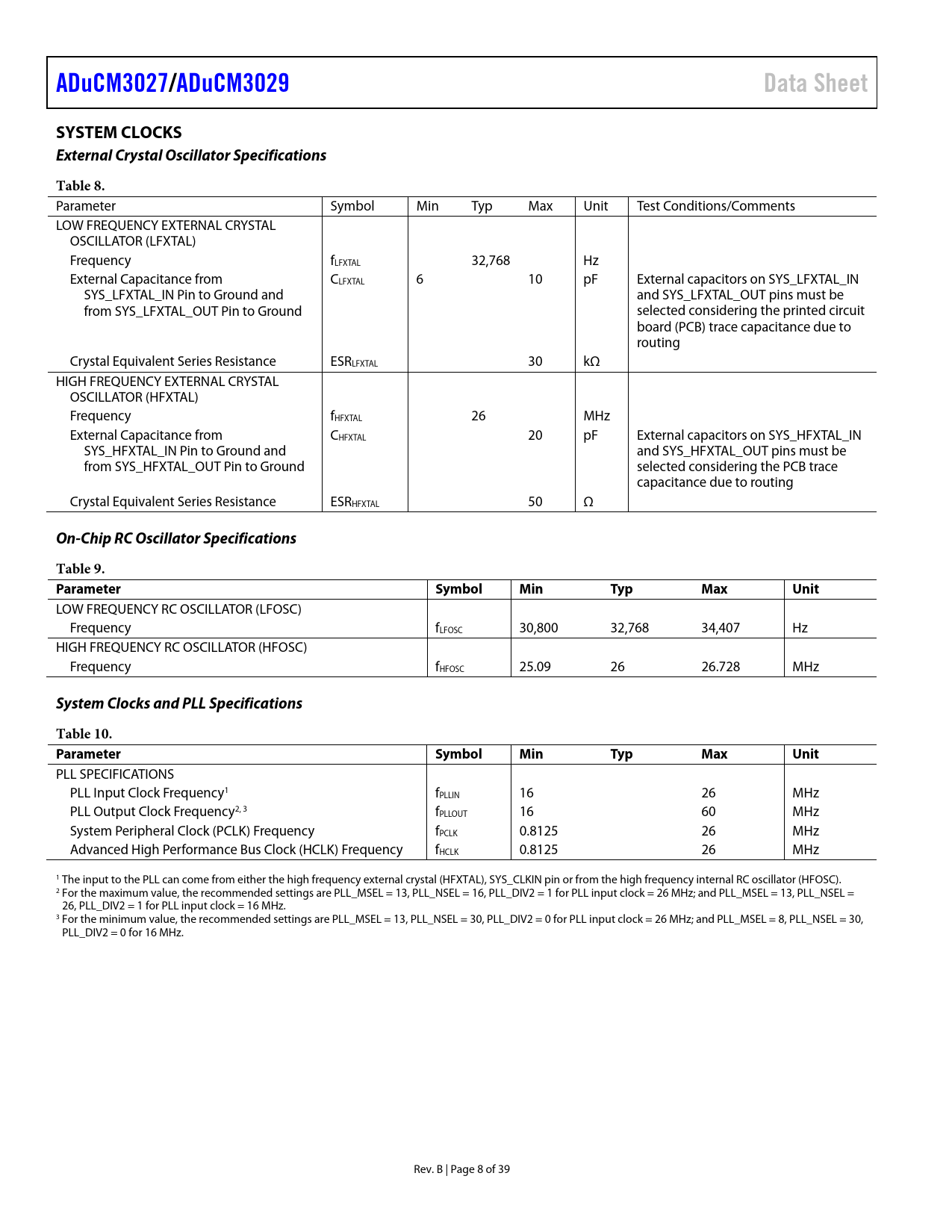 ADuCM3027 /ADuCM3029 Data Sheet SYSTEM CLOCKS External Crystal Oscillator Specifications Table 8