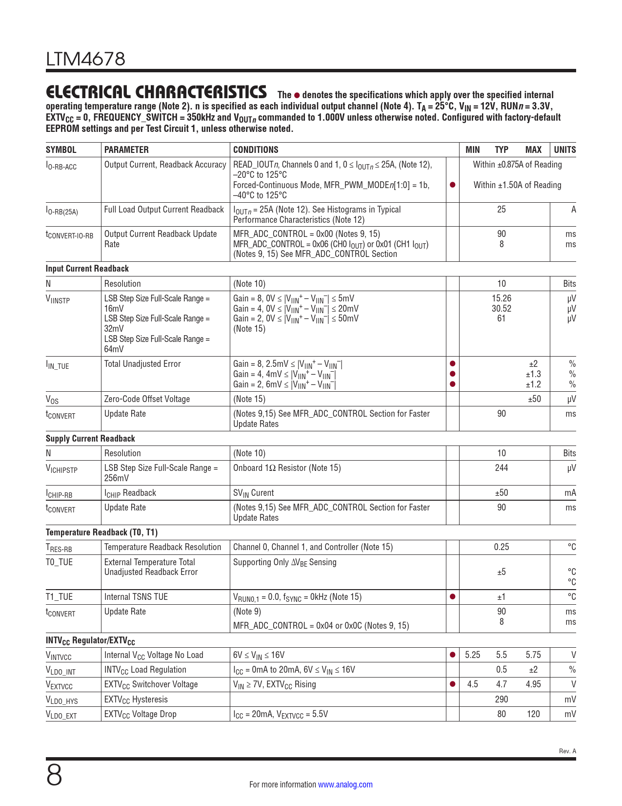 TRES-RB Temperature Readback Resolution Channel 0, Channel 1, and Controller (Note 15) 0.25 °C T0_TUE External Temperature Total Supporting Only ∆VBE Sensing Unadjusted Readback Error ±5 °C °C T1_TUE Internal TSNS TUE VRUN0,1 = 0.0, fSYNC = 0kHz (Note 15) l ±1 °C tCONVERT Update Rate (Note 9) 90 ms MFR_ADC_CONTROL = 0x04 or 0x0C (Notes 9, 15) 8 ms