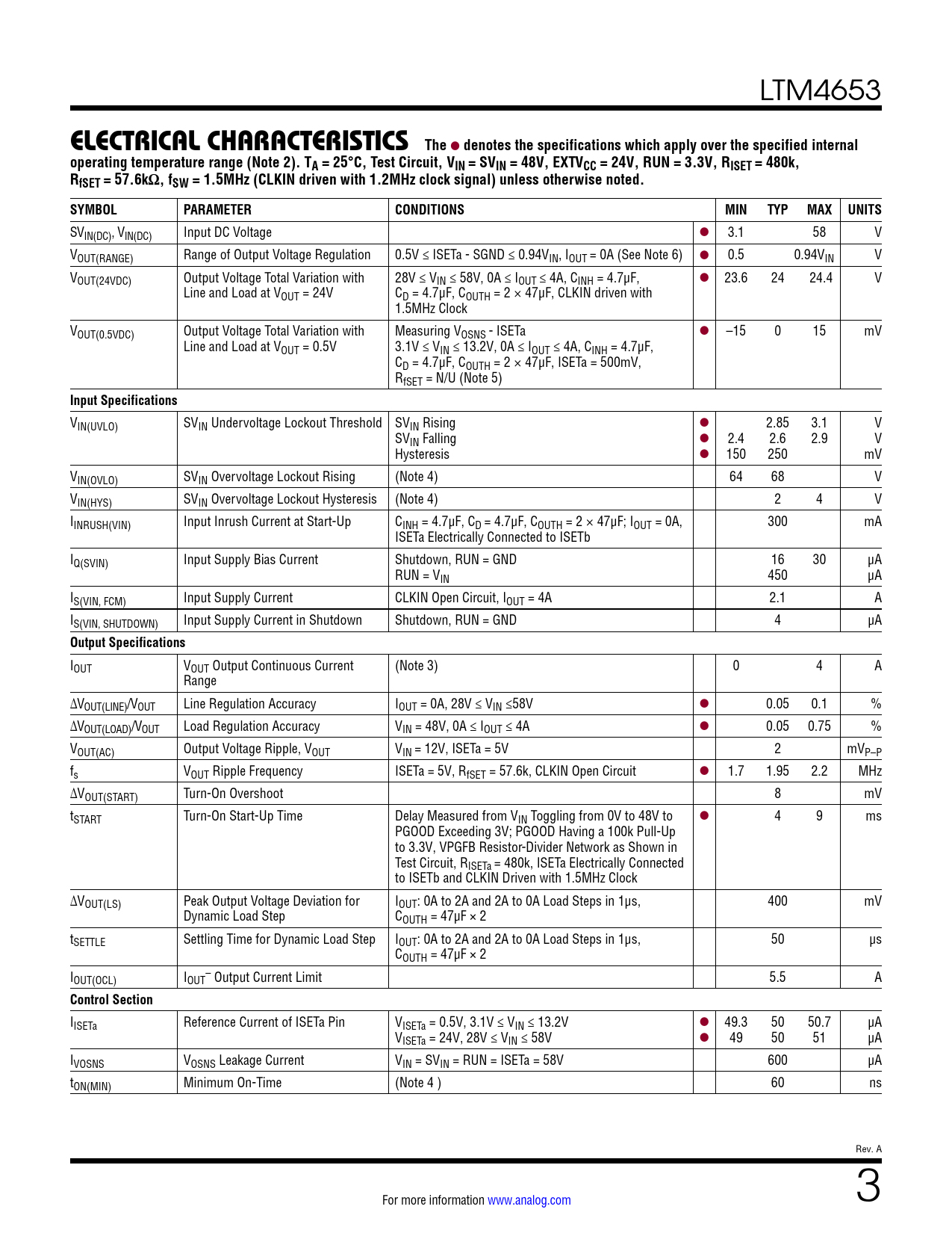 LTM4653 ELECTRICAL CHARACTERISTICS The l denotes the specifications which apply over the specified internaloperating temperature range (Note 2). TA = 25°C, Test Circuit, VIN = SVIN = 48V, EXTVCC = 24V, RUN = 3.3V, RISET = 480k,RfSET = 57.6kΩ, fSW = 1.5MHz (CLKIN driven with 1.2MHz clock signal) unless otherwise noted. SYMBOLPARAMETERCONDITIONSMINTYPMAX UNITS SVIN(DC), VIN(DC) Input DC Voltage l 3.1 58 V VOUT(RANGE) Range of Output Voltage Regulation 0.5V ≤ ISETa - SGND ≤ 0.94VIN, IOUT = 0A (See Note 6) l 0.5 0.94VIN V VOUT(24VDC) Output Voltage Total Variation with 28V ≤ VIN ≤ 58V, 0A ≤ IOUT ≤ 4A, CINH = 4.7μF, l 23.6 24 24.4 V Line and Load at VOUT = 24V CD = 4.7μF, COUTH = 2 × 47μF, CLKIN driven with 1.5MHz Clock VOUT(0.5VDC) Output Voltage Total Variation with Measuring VOSNS - ISETa l –15 0 15 mV Line and Load at VOUT = 0.5V 3.1V ≤ VIN ≤ 13.2V, 0A ≤ IOUT ≤ 4A, CINH = 4.7μF, CD = 4.7μF, COUTH = 2 × 47μF, ISETa = 500mV, RfSET = N/U (Note 5) Input Specifications VIN(UVLO) SVIN Undervoltage Lockout Threshold SVIN Rising l 2.85 3.1 V SVIN Falling l 2.4 2.6 2.9 V Hysteresis l 150 250 mV VIN(OVLO) SVIN Overvoltage Lockout Rising (Note 4) 64 68 V VIN(HYS) SVIN Overvoltage Lockout Hysteresis (Note 4) 2 4 V IINRUSH(VIN) Input Inrush Current at Start-Up CINH = 4.7μF, CD = 4.7μF, COUTH = 2 × 47μF; IOUT = 0A, 300 mA ISETa Electrically Connected to ISETb IQ(SVIN) Input Supply Bias Current Shutdown, RUN = GND 16 30 μA RUN = VIN 450 μA IS(VIN, FCM) Input Supply Current CLKIN Open Circuit, IOUT = 4A 2.1 A IS(VIN, SHUTDOWN) Input Supply Current in Shutdown Shutdown, RUN = GND 4 µA Output Specifications IOUT VOUT Output Continuous Current (Note 3) 0 4 A Range ∆VOUT(LINE)/VOUT Line Regulation Accuracy IOUT = 0A, 28V ≤ VIN ≤58V l 0.05 0.1 % ∆VOUT(LOAD)/VOUT Load Regulation Accuracy VIN = 48V, 0A ≤ IOUT ≤ 4A l 0.05 0.75 % VOUT(AC) Output Voltage Ripple, VOUT VIN = 12V, ISETa = 5V 2 mVP–P fs VOUT Ripple Frequency ISETa = 5V, RfSET = 57.6k, CLKIN Open Circuit l 1.7 1.95 2.2 MHz ∆VOUT(START) Turn-On Overshoot 8 mV tSTART Turn-On Start-Up Time Delay Measured from VIN Toggling from 0V to 48V to l 4 9 ms PGOOD Exceeding 3V; PGOOD Having a 100k Pull-Up to 3.3V, VPGFB Resistor-Divider Network as Shown in Test Circuit, RISETa = 480k, ISETa Electrically Connected to ISETb and CLKIN Driven with 1.5MHz Clock ∆VOUT(LS) Peak Output Voltage Deviation for IOUT: 0A to 2A and 2A to 0A Load Steps in 1μs, 400 mV Dynamic Load Step COUTH = 47µF × 2 tSETTLE Settling Time for Dynamic Load Step IOUT: 0A to 2A and 2A to 0A Load Steps in 1μs, 50 µs COUTH = 47µF × 2 I – OUT(OCL) IOUT Output Current Limit 5.5 A Control Section IISETa Reference Current of ISETa Pin VISETa = 0.5V, 3.1V ≤ VIN ≤ 13.2V l 49.3 50 50.7 µA VISETa = 24V, 28V ≤ VIN ≤ 58V l 49 50 51 µA IVOSNS VOSNS Leakage Current VIN = SVIN = RUN = ISETa = 58V 600 µA tON(MIN) Minimum On-Time (Note 4 ) 60 ns Rev. A For more information www.analog.com 3 Document Outline Features Applications Typical Application Description Absolute Maximum Ratings Order Information Pin Configuration Electrical Characteristics Typical Performance Characteristics Pin Functions Test Circuit Decoupling Requirements Operation Operation Operation Applications Information Typical Applications Package Photograph Package Description Typical Application Related Parts