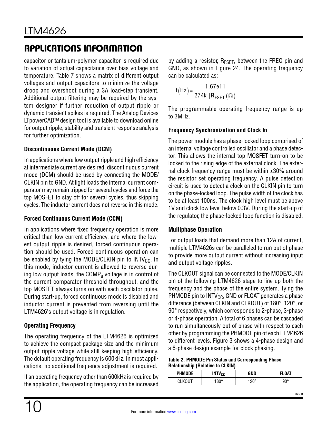 link to page 21 link to page 23 link to page 11 LTM4626 APPLICATIONS INFORMATION capacitor or tantalum-polymer capacitor is required due by adding a resistor, RFSET, between the FREQ pin and to variation of actual capacitance over bias voltage and GND, as shown in Figure 24. The operating frequency temperature. Table 7 shows a matrix of different output can be calculated as: voltages and output capacitors to minimize the voltage 1.67e11 droop and overshoot during a 3A load-step transient. f(Hz) = Additional output filtering may be required by the sys- 274k ||RFSET (Ω) tem designer if further reduction of output ripple or The programmable operating frequency range is up dynamic transient spikes is required. The Analog Devices to 3MHz. LTpowerCAD™ design tool is available to download online for output ripple, stability and transient response analysis Frequency Synchronization and Clock In for further optimization. The power module has a phase-locked loop comprised of Discontinuous Current Mode (DCM) an internal voltage controlled oscillator and a phase detec- tor. This al ows the internal top MOSFET turn-on to be In applications where low output ripple and high efficiency locked to the rising edge of the external clock. The exter- at intermediate current are desired, discontinuous current nal clock frequency range must be within ±30% around mode (DCM) should be used by connecting the MODE/ the resistor set operating frequency. A pulse detection CLKIN pin to GND. At light loads the internal current com- circuit is used to detect a clock on the CLKIN pin to turn parator may remain tripped for several cycles and force the on the phase-locked loop. The pulse width of the clock has top MOSFET to stay off for several cycles, thus skipping to be at least 100ns. The clock high level must be above cycles. The inductor current does not reverse in this mode. 1V and clock low level below 0.3V. During the start-up of Forced Continuous Current Mode (CCM) the regulator, the phase-locked loop function is disabled. In applications where fixed frequency operation is more Multiphase Operation critical than low current efficiency, and where the low- For output loads that demand more than 12A of current, est output ripple is desired, forced continuous opera- multiple LTM4626s can be paralleled to run out of phase tion should be used. Forced continuous operation can to provide more output current without increasing input be enabled by tying the MODE/CLKIN pin to INTVCC. In and output voltage ripples. this mode, inductor current is allowed to reverse dur- ing low output loads, the COMPa voltage is in control of The CLKOUT signal can be connected to the MODE/CLKIN the current comparator threshold throughout, and the pin of the following LTM4626 stage to line up both the top MOSFET always turns on with each oscillator pulse. frequency and the phase of the entire system. Tying the During start-up, forced continuous mode is disabled and PHMODE pin to INTVCC, GND or FLOAT generates a phase inductor current is prevented from reversing until the difference (between CLKIN and CLKOUT) of 180°, 120°, or LTM4626’s output voltage is in regulation. 90° respectively, which corresponds to 2-phase, 3-phase or 4-phase operation. A total of 6 phases can be cascaded Operating Frequency to run simultaneously out of phase with respect to each The operating frequency of the LTM4626 is optimized other by programming the PHMODE pin of each LTM4626 to achieve the compact package size and the minimum to different levels. Figure 3 shows a 4-phase design and output ripple voltage while still keeping high efficiency. a 6-phase design example for clock phasing. The default operating frequency is 600kHz. In most appli- Table 2. PHMODE Pin Status and Corresponding Phase cations, no additional frequency adjustment is required. Relationship (Relative to CLKIN) If an operating frequency other than 600kHz is required by PHMODEINTVCCGNDFLOAT the application, the operating frequency can be increased CLKOUT 180° 120° 90° Rev B 10 For more information www.analog.com Document Outline Features Applications Typical Application Description Absolute Maximum Ratings Order Information Electrical Characteristics Pin Configuration Typical Performance Characteristics Pin Functions Block Diagram Decoupling Requirements Operation Applications Information Package Description Revision History Package Photo Design Resources Related Parts