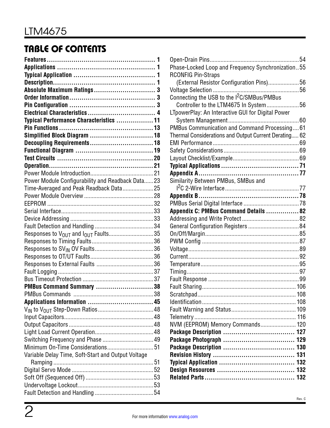 link to page 1 link to page 1 link to page 1 link to page 1 link to page 3 link to page 3 link to page 3 link to page 4 link to page 11 link to page 13 link to page 18 link to page 18 link to page 19 link to page 20 link to page 21 link to page 21 link to page 23 link to page 25 link to page 28 link to page 32 link to page 33 link to page 33 link to page 34 link to page 35 link to page 36 link to page 36 link to page 36 link to page 36 link to page 37 link to page 37 link to page 38 link to page 38 link to page 45 link to page 48 link to page 48 link to page 48 link to page 48 link to page 49 link to page 51 link to page 51 link to page 51 link to page 52 link to page 53 link to page 53 link to page 54 link to page 54 link to page 55 link to page 56 link to page 56 link to page 56 link to page 56 link to page 56 link to page 60 link to page 60 link to page 61 link to page 62 link to page 69 link to page 69 link to page 69 link to page 71 link to page 77 link to page 77 link to page 77 link to page 78 link to page 78 link to page 82 link to page 82 link to page 84 link to page 85 link to page 87 link to page 89 link to page 92 link to page 95 link to page 97 link to page 99 link to page 106 link to page 108 link to page 108 link to page 109 link to page 116 link to page 120 link to page 127 link to page 129 link to page 130 link to page 131 link to page 132 link to page 132 link to page 132 LTM4675 TABLE OF CONTENTS Features ... 1 Open-Drain Pins ..54 Applications .. 1 Phase-Locked Loop and Frequency Synchronization ..55 Typical Application .. 1 RCONFIG Pin-Straps Description.. 1 (External Resistor Configuration Pins) ..56 Absolute Maximum Ratings .. 3 Voltage Selection ..56 Order Information .. 3 Connecting the USB to the I2C/SMBus/PMBus Pin Configuration .. 3 Control er to the LTM4675 In System ...56 Electrical Characteristics ... 4 LTpowerPlay: An Interactive GUI for Digital Power Typical Performance Characteristics ..11 System Management ..60 Pin Functions ..13 PMBus Communication and Command Processing ..61 Simplified Block Diagram ...18 Thermal Considerations and Output Current Derating... 62 Decoupling Requirements ...18 EMI Performance ..69 Functional Diagram ..19 Safety Considerations ...69 Test Circuits ...20 Layout Checklist/Example ...69 Operation...21Typical Applications ..71 Power Module Introduction ...21 Appendix A ...77 Power Module Configurability and Readback Data ..23 Similarity Between PMBus, SMBus and Time-Averaged and Peak Readback Data ..25 I2C 2-Wire Interface ..77 Power Module Overview ...28 Appendix B ...78 EEPROM ...32 PMBus Serial Digital Interface ..78 Serial Interface ..33 Appendix C: PMBus Command Details ..82 Device Addressing ..33 Addressing and Write Protect ...82 Fault Detection and Handling ..34 General Configuration Registers ...84 Responses to VOUT and IOUT Faults...35 On/Off/Margin ...85 Responses to Timing Faults ..36 PWM Config ...87 Responses to SVIN OV Faults ..36 Voltage ..89 Responses to OT/UT Faults ...36 Current ..92 Responses to External Faults ...36 Temperature ..95 Fault Logging ..37 Timing ...97 Bus Timeout Protection ..37 Fault Response ...99 PMBus Command Summary ..38 Fault Sharing ... 106 PMBus Commands ..38 Scratchpad .. 108 Applications Information ..45 Identification ... 108 VIN to VOUT Step-Down Ratios ..48 Fault Warning and Status .. 109 Input Capacitors ..48 Telemetry .. 116 Output Capacitors ...48 NVM (EEPROM) Memory Commands ... 120 Light Load Current Operation ..48 Package Description ... 127 Switching Frequency and Phase ...49 Package Photograph ... 129 Minimum On-Time Considerations .. 51 Package Description ... 130 Variable Delay Time, Soft-Start and Output Voltage Revision History .. 131 Ramping ... 51 Typical Application ... 132 Digital Servo Mode ...52 Design Resources .. 132 Soft Off (Sequenced Off) ..53 Related Parts .. 132 Undervoltage Lockout ...53 Fault Detection and Handling ..54 Rev. C 2 For more information www.analog.com Document Outline Features Applications Typical Application Description Absolute Maximum Ratings Order Information Pin Configuration Electrical Characteristics Typical Performance Characteristics Pin Functions Simplified Block Diagram Decoupling Requirements Functional Diagram Test Circuits Operation Power Module Introduction Power Module Configurability and Readback Data Time-Averaged and Peak Readback Data Power Module Overview EEPROM Serial Interface Device Addressing Fault Detection and Handling Responses to VOUT and IOUT Faults Responses to Timing Faults Responses to SVIN OV Faults Responses to OT/UT Faults Responses to External Faults Fault Logging Bus Timeout Protection PMBus Command Summary PMBus Commands Applications Information VIN to VOUT Step-Down Ratios Input Capacitors Output Capacitors Light Load Current Operation Switching Frequency and Phase Minimum On-Time Considerations Variable Delay Time, Soft-Start and Output Voltage Ramping Digital Servo Mode Soft Off (Sequenced Off) Undervoltage Lockout Fault Detection and Handling Open-Drain Pins Phase-Locked Loop and Frequency Synchronization RCONFIG Pin-Straps (External Resistor Configuration Pins) Voltage Selection Connecting the USB to the I2C/SMBus/PMBus Controller to the LTM4675 In System LTpowerPlay: An Interactive GUI for Digital Power System Management PMBus Communication and Command Processing Thermal Considerations and Output Current Derating EMI Performance Safety Considerations Layout Checklist/Example Typical Applications Appendix A Similarity Between PMBus, SMBus and I2C 2-Wire Interface Appendix B PMBus Serial Digital Interface Appendix C: PMBus Command Details Addressing and Write Protect General Configuration Registers On/Off/Margin PWM Config Voltage Current Temperature Timing Fault Response Fault Sharing Scratchpad Identification Fault Warning and Status Telemetry NVM (EEPROM) Memory Commands Package Description Package Photograph Package Description Revision History Typical Application Design Resources Related Parts
